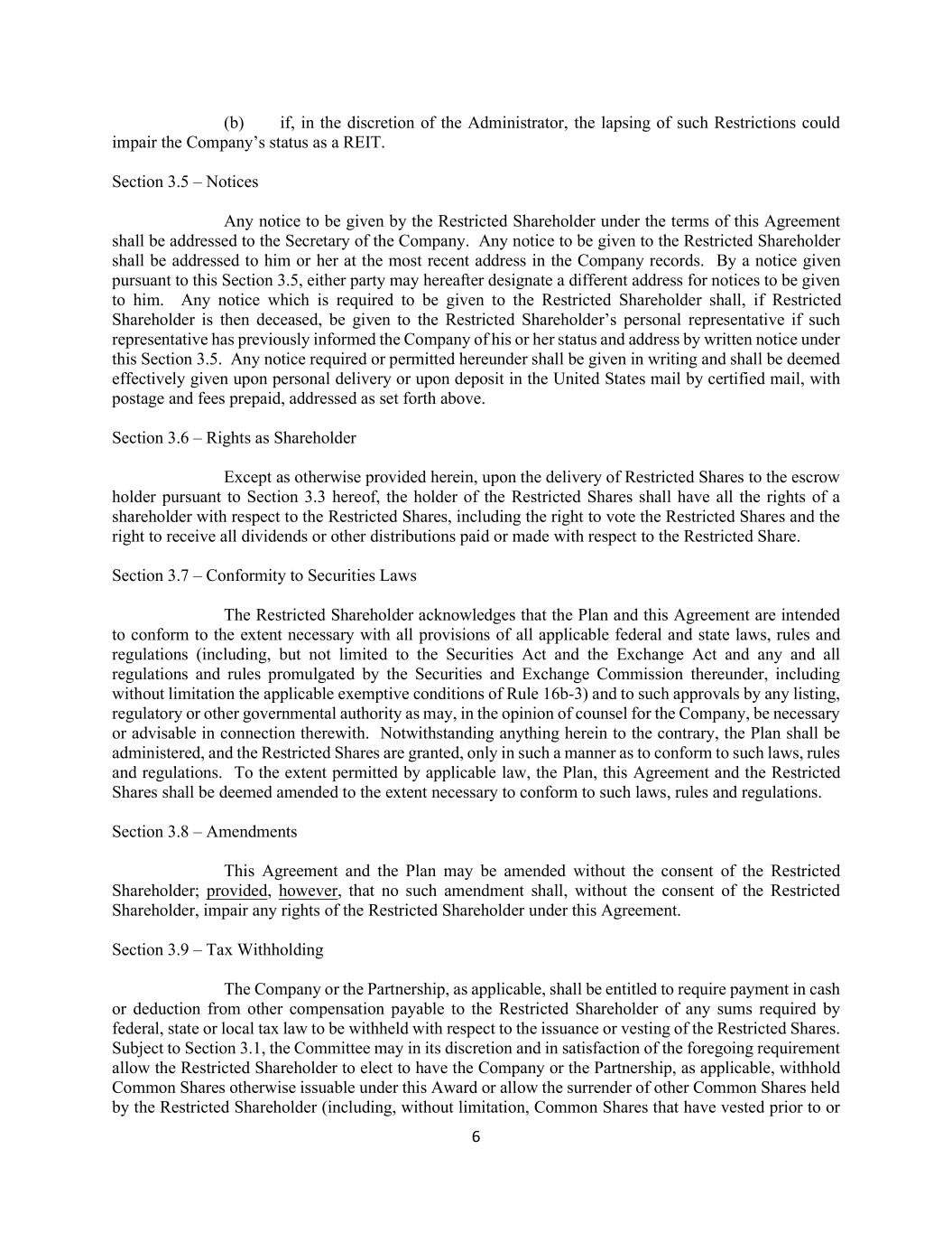 6 (b) if, in the discretion of the Administrator, the lapsing of such Restrictions could impair the Company’s status as a REIT. Section 3.5 – Notices Any notice to be given by the Restricted Shareholder under the terms of this Agreement shall be addressed to the Secretary of the Company. Any notice to be given to the Restricted Shareholder shall be addressed to him or her at the most recent address in the Company records. By a notice given pursuant to this Section 3.5, either party may hereafter designate a different address for notices to be given to him. Any notice which is required to be given to the Restricted Shareholder shall, if Restricted Shareholder is then deceased, be given to the Restricted Shareholder’s personal representative if such representative has previously informed the Company of his or her status and address by written notice under this Section 3.5. Any notice required or permitted hereunder shall be given in writing and shall be deemed effectively given upon personal delivery or upon deposit in the United States mail by certified mail, with postage and fees prepaid, addressed as set forth above. Section 3.6 – Rights as Shareholder Except as otherwise provided herein, upon the delivery of Restricted Shares to the escrow holder pursuant to Section 3.3 hereof, the holder of the Restricted Shares shall have all the rights of a shareholder with respect to the Restricted Shares, including the right to vote the Restricted Shares and the right to receive all dividends or other distributions paid or made with respect to the Restricted Share. Section 3.7 – Conformity to Securities Laws The Restricted Shareholder acknowledges that the Plan and this Agreement are intended to conform to the extent necessary with all provisions of all applicable federal and state laws, rules and regulations (including, but not limited to the Securities Act and the Exchange Act and any and all regulations and rules promulgated by the Securities and Exchange Commission thereunder, including without limitation the applicable exemptive conditions of Rule 16b-3) and to such approvals by any listing, regulatory or other governmental authority as may, in the opinion of counsel for the Company, be necessary or advisable in connection therewith. Notwithstanding anything herein to the contrary, the Plan shall be administered, and the Restricted Shares are granted, only in such a manner as to conform to such laws, rules and regulations. To the extent permitted by applicable law, the Plan, this Agreement and the Restricted Shares shall be deemed amended to the extent necessary to conform to such laws, rules and regulations. Section 3.8 – Amendments This Agreement and the Plan may be amended without the consent of the Restricted Shareholder; provided, however, that no such amendment shall, without the consent of the Restricted Shareholder, impair any rights of the Restricted Shareholder under this Agreement. Section 3.9 – Tax Withholding The Company or the Partnership, as applicable, shall be entitled to require payment in cash or deduction from other compensation payable to the Restricted Shareholder of any sums required by federal, state or local tax law to be withheld with respect to the issuance or vesting of the Restricted Shares. Subject to Section 3.1, the Committee may in its discretion and in satisfaction of the foregoing requirement allow the Restricted Shareholder to elect to have the Company or the Partnership, as applicable, withhold Common Shares otherwise issuable under this Award or allow the surrender of other Common Shares held by the Restricted Shareholder (including, without limitation, Common Shares that have vested prior to or
