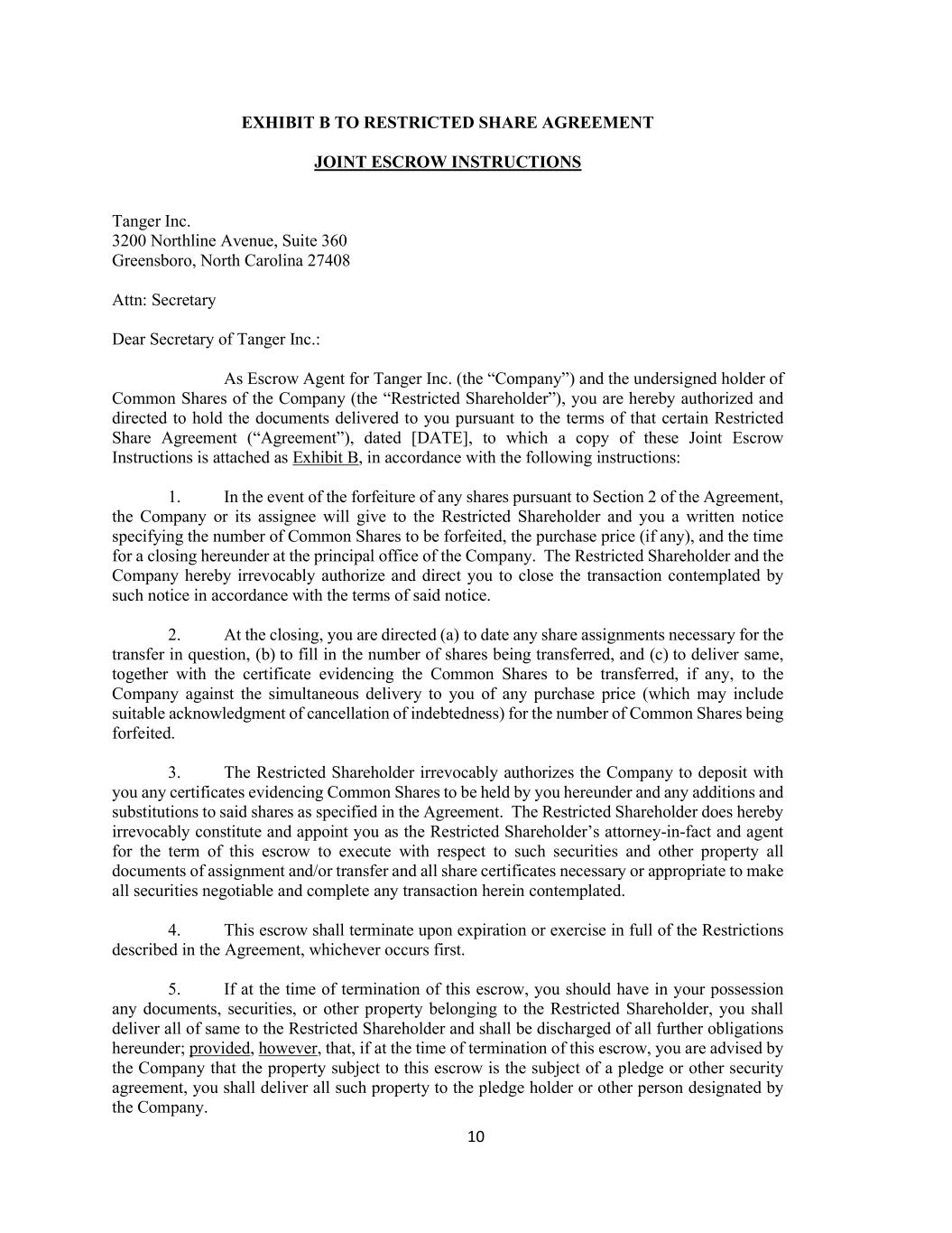 10 EXHIBIT B TO RESTRICTED SHARE AGREEMENT JOINT ESCROW INSTRUCTIONS Tanger Inc. 3200 Northline Avenue, Suite 360 Greensboro, North Carolina 27408 Attn: Secretary Dear Secretary of Tanger Inc.: As Escrow Agent for Tanger Inc. (the “Company”) and the undersigned holder of Common Shares of the Company (the “Restricted Shareholder”), you are hereby authorized and directed to hold the documents delivered to you pursuant to the terms of that certain Restricted Share Agreement (“Agreement”), dated [DATE], to which a copy of these Joint Escrow Instructions is attached as Exhibit B, in accordance with the following instructions: 1. In the event of the forfeiture of any shares pursuant to Section 2 of the Agreement, the Company or its assignee will give to the Restricted Shareholder and you a written notice specifying the number of Common Shares to be forfeited, the purchase price (if any), and the time for a closing hereunder at the principal office of the Company. The Restricted Shareholder and the Company hereby irrevocably authorize and direct you to close the transaction contemplated by such notice in accordance with the terms of said notice. 2. At the closing, you are directed (a) to date any share assignments necessary for the transfer in question, (b) to fill in the number of shares being transferred, and (c) to deliver same, together with the certificate evidencing the Common Shares to be transferred, if any, to the Company against the simultaneous delivery to you of any purchase price (which may include suitable acknowledgment of cancellation of indebtedness) for the number of Common Shares being forfeited. 3. The Restricted Shareholder irrevocably authorizes the Company to deposit with you any certificates evidencing Common Shares to be held by you hereunder and any additions and substitutions to said shares as specified in the Agreement. The Restricted Shareholder does hereby irrevocably constitute and appoint you as the Restricted Shareholder’s attorney-in-fact and agent for the term of this escrow to execute with respect to such securities and other property all documents of assignment and/or transfer and all share certificates necessary or appropriate to make all securities negotiable and complete any transaction herein contemplated. 4. This escrow shall terminate upon expiration or exercise in full of the Restrictions described in the Agreement, whichever occurs first. 5. If at the time of termination of this escrow, you should have in your possession any documents, securities, or other property belonging to the Restricted Shareholder, you shall deliver all of same to the Restricted Shareholder and shall be discharged of all further obligations hereunder; provided, however, that, if at the time of termination of this escrow, you are advised by the Company that the property subject to this escrow is the subject of a pledge or other security agreement, you shall deliver all such property to the pledge holder or other person designated by the Company.