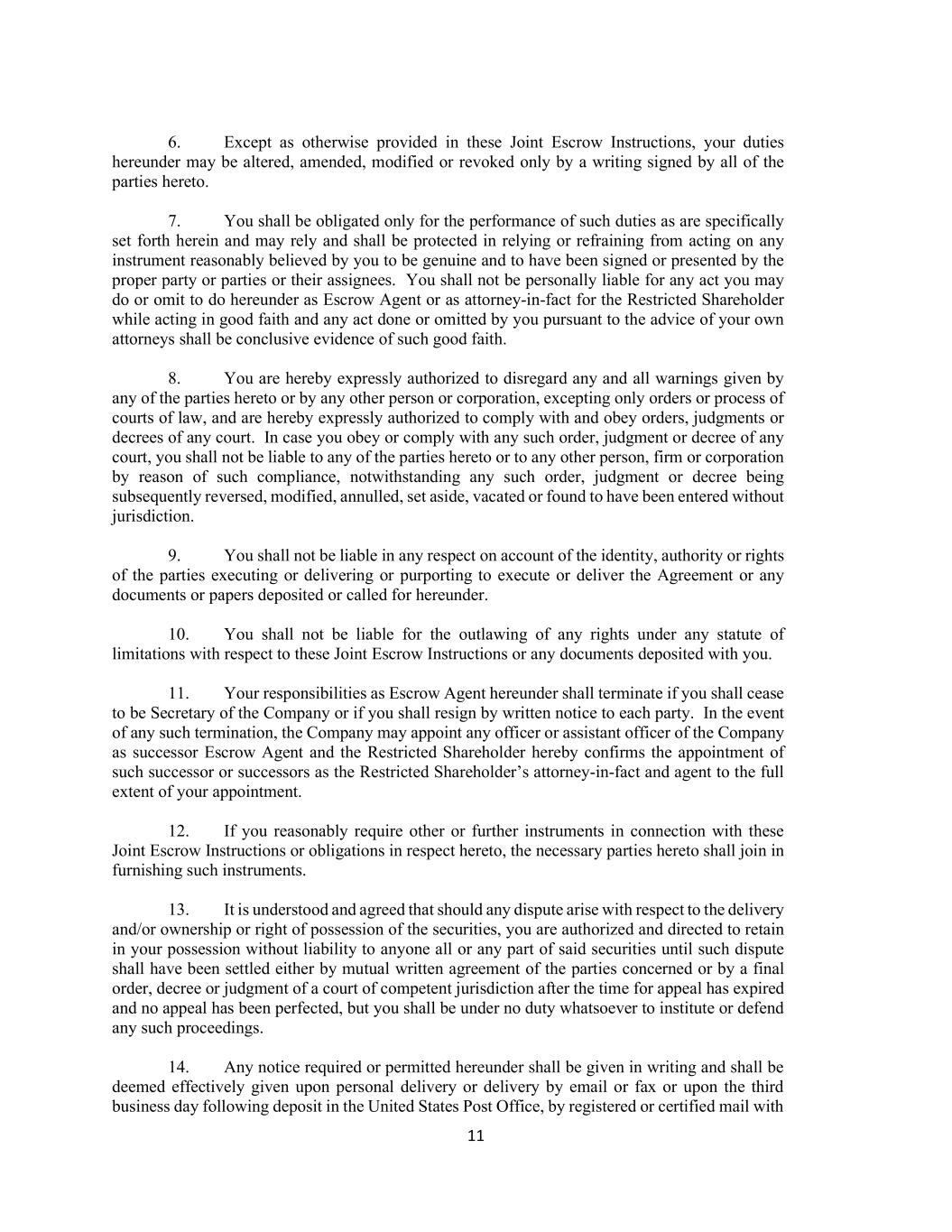 11 6. Except as otherwise provided in these Joint Escrow Instructions, your duties hereunder may be altered, amended, modified or revoked only by a writing signed by all of the parties hereto. 7. You shall be obligated only for the performance of such duties as are specifically set forth herein and may rely and shall be protected in relying or refraining from acting on any instrument reasonably believed by you to be genuine and to have been signed or presented by the proper party or parties or their assignees. You shall not be personally liable for any act you may do or omit to do hereunder as Escrow Agent or as attorney-in-fact for the Restricted Shareholder while acting in good faith and any act done or omitted by you pursuant to the advice of your own attorneys shall be conclusive evidence of such good faith. 8. You are hereby expressly authorized to disregard any and all warnings given by any of the parties hereto or by any other person or corporation, excepting only orders or process of courts of law, and are hereby expressly authorized to comply with and obey orders, judgments or decrees of any court. In case you obey or comply with any such order, judgment or decree of any court, you shall not be liable to any of the parties hereto or to any other person, firm or corporation by reason of such compliance, notwithstanding any such order, judgment or decree being subsequently reversed, modified, annulled, set aside, vacated or found to have been entered without jurisdiction. 9. You shall not be liable in any respect on account of the identity, authority or rights of the parties executing or delivering or purporting to execute or deliver the Agreement or any documents or papers deposited or called for hereunder. 10. You shall not be liable for the outlawing of any rights under any statute of limitations with respect to these Joint Escrow Instructions or any documents deposited with you. 11. Your responsibilities as Escrow Agent hereunder shall terminate if you shall cease to be Secretary of the Company or if you shall resign by written notice to each party. In the event of any such termination, the Company may appoint any officer or assistant officer of the Company as successor Escrow Agent and the Restricted Shareholder hereby confirms the appointment of such successor or successors as the Restricted Shareholder’s attorney-in-fact and agent to the full extent of your appointment. 12. If you reasonably require other or further instruments in connection with these Joint Escrow Instructions or obligations in respect hereto, the necessary parties hereto shall join in furnishing such instruments. 13. It is understood and agreed that should any dispute arise with respect to the delivery and/or ownership or right of possession of the securities, you are authorized and directed to retain in your possession without liability to anyone all or any part of said securities until such dispute shall have been settled either by mutual written agreement of the parties concerned or by a final order, decree or judgment of a court of competent jurisdiction after the time for appeal has expired and no appeal has been perfected, but you shall be under no duty whatsoever to institute or defend any such proceedings. 14. Any notice required or permitted hereunder shall be given in writing and shall be deemed effectively given upon personal delivery or delivery by email or fax or upon the third business day following deposit in the United States Post Office, by registered or certified mail with