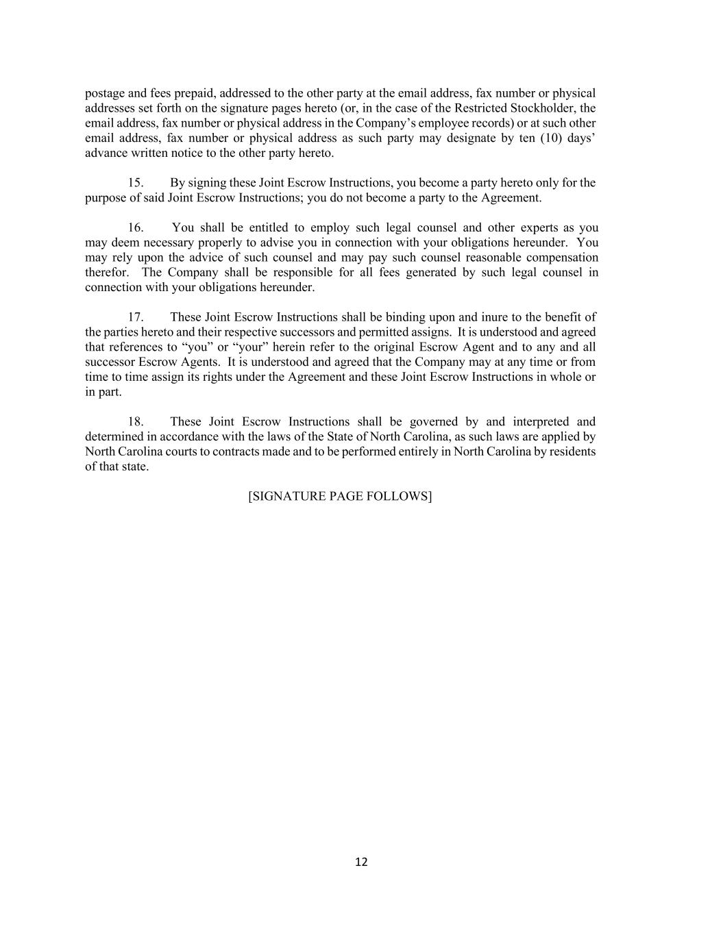 12 postage and fees prepaid, addressed to the other party at the email address, fax number or physical addresses set forth on the signature pages hereto (or, in the case of the Restricted Stockholder, the email address, fax number or physical address in the Company’s employee records) or at such other email address, fax number or physical address as such party may designate by ten (10) days’ advance written notice to the other party hereto. 15. By signing these Joint Escrow Instructions, you become a party hereto only for the purpose of said Joint Escrow Instructions; you do not become a party to the Agreement. 16. You shall be entitled to employ such legal counsel and other experts as you may deem necessary properly to advise you in connection with your obligations hereunder. You may rely upon the advice of such counsel and may pay such counsel reasonable compensation therefor. The Company shall be responsible for all fees generated by such legal counsel in connection with your obligations hereunder. 17. These Joint Escrow Instructions shall be binding upon and inure to the benefit of the parties hereto and their respective successors and permitted assigns. It is understood and agreed that references to “you” or “your” herein refer to the original Escrow Agent and to any and all successor Escrow Agents. It is understood and agreed that the Company may at any time or from time to time assign its rights under the Agreement and these Joint Escrow Instructions in whole or in part. 18. These Joint Escrow Instructions shall be governed by and interpreted and determined in accordance with the laws of the State of North Carolina, as such laws are applied by North Carolina courts to contracts made and to be performed entirely in North Carolina by residents of that state. [SIGNATURE PAGE FOLLOWS]