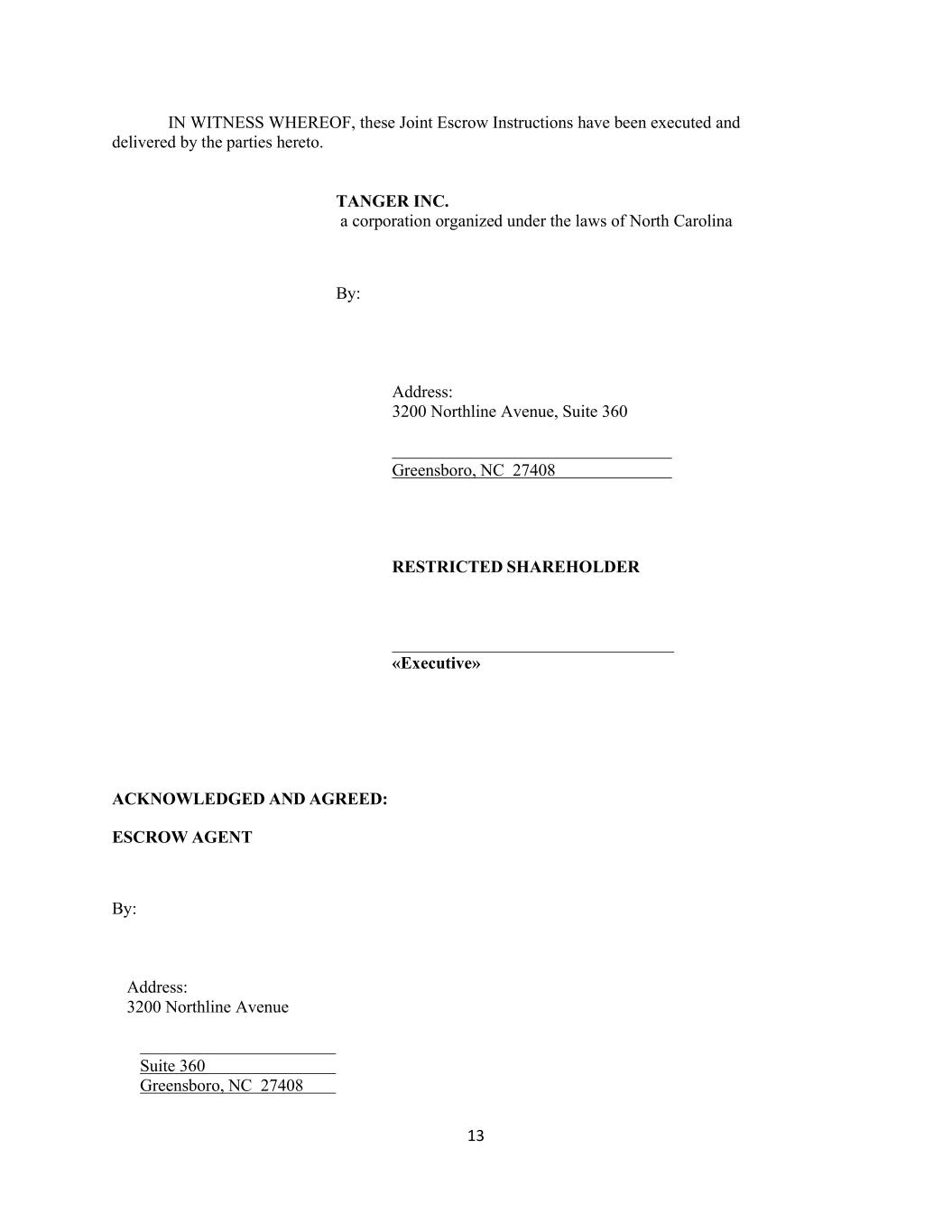 13 IN WITNESS WHEREOF, these Joint Escrow Instructions have been executed and delivered by the parties hereto. TANGER INC. a corporation organized under the laws of North Carolina By: Address: 3200 Northline Avenue, Suite 360 Greensboro, NC 27408 RESTRICTED SHAREHOLDER _________________________________ «Executive» ACKNOWLEDGED AND AGREED: ESCROW AGENT By: Address: 3200 Northline Avenue Suite 360 Greensboro, NC 27408
