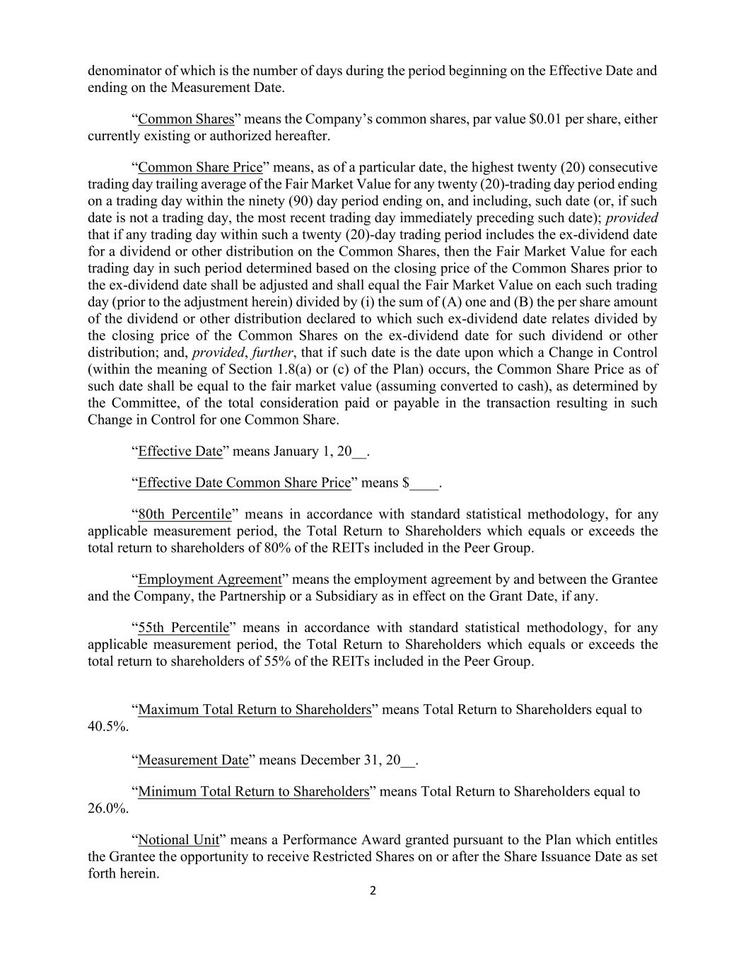 2 denominator of which is the number of days during the period beginning on the Effective Date and ending on the Measurement Date. “Common Shares” means the Company’s common shares, par value $0.01 per share, either currently existing or authorized hereafter. “Common Share Price” means, as of a particular date, the highest twenty (20) consecutive trading day trailing average of the Fair Market Value for any twenty (20)-trading day period ending on a trading day within the ninety (90) day period ending on, and including, such date (or, if such date is not a trading day, the most recent trading day immediately preceding such date); provided that if any trading day within such a twenty (20)-day trading period includes the ex-dividend date for a dividend or other distribution on the Common Shares, then the Fair Market Value for each trading day in such period determined based on the closing price of the Common Shares prior to the ex-dividend date shall be adjusted and shall equal the Fair Market Value on each such trading day (prior to the adjustment herein) divided by (i) the sum of (A) one and (B) the per share amount of the dividend or other distribution declared to which such ex-dividend date relates divided by the closing price of the Common Shares on the ex-dividend date for such dividend or other distribution; and, provided, further, that if such date is the date upon which a Change in Control (within the meaning of Section 1.8(a) or (c) of the Plan) occurs, the Common Share Price as of such date shall be equal to the fair market value (assuming converted to cash), as determined by the Committee, of the total consideration paid or payable in the transaction resulting in such Change in Control for one Common Share. “Effective Date” means January 1, 20__. “Effective Date Common Share Price” means $____. “80th Percentile” means in accordance with standard statistical methodology, for any applicable measurement period, the Total Return to Shareholders which equals or exceeds the total return to shareholders of 80% of the REITs included in the Peer Group. “Employment Agreement” means the employment agreement by and between the Grantee and the Company, the Partnership or a Subsidiary as in effect on the Grant Date, if any. “55th Percentile” means in accordance with standard statistical methodology, for any applicable measurement period, the Total Return to Shareholders which equals or exceeds the total return to shareholders of 55% of the REITs included in the Peer Group. 40.5%. “Maximum Total Return to Shareholders” means Total Return to Shareholders equal to “Measurement Date” means December 31, 20__. “Minimum Total Return to Shareholders” means Total Return to Shareholders equal to 26.0%. “Notional Unit” means a Performance Award granted pursuant to the Plan which entitles the Grantee the opportunity to receive Restricted Shares on or after the Share Issuance Date as set forth herein.