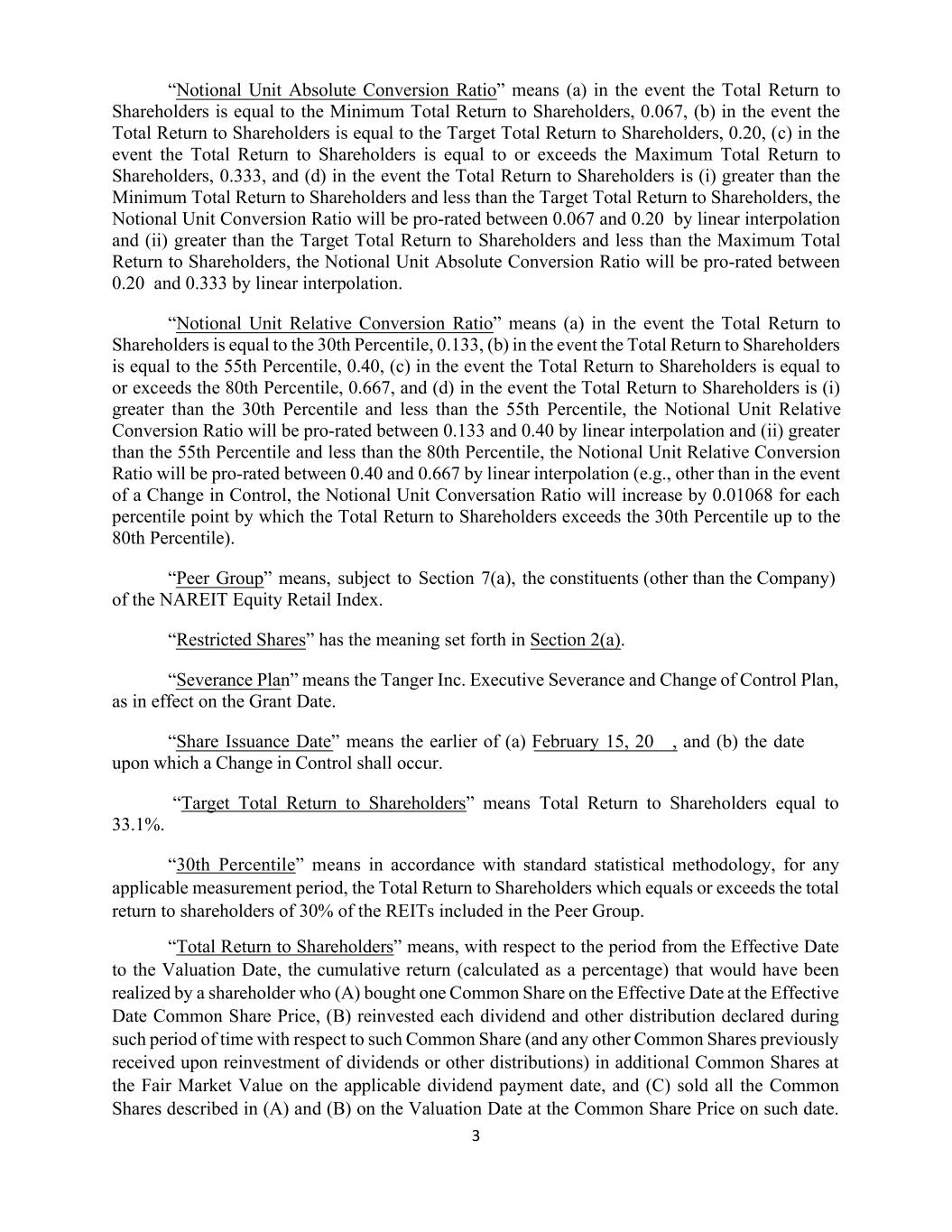 3 “Notional Unit Absolute Conversion Ratio” means (a) in the event the Total Return to Shareholders is equal to the Minimum Total Return to Shareholders, 0.067, (b) in the event the Total Return to Shareholders is equal to the Target Total Return to Shareholders, 0.20, (c) in the event the Total Return to Shareholders is equal to or exceeds the Maximum Total Return to Shareholders, 0.333, and (d) in the event the Total Return to Shareholders is (i) greater than the Minimum Total Return to Shareholders and less than the Target Total Return to Shareholders, the Notional Unit Conversion Ratio will be pro-rated between 0.067 and 0.20 by linear interpolation and (ii) greater than the Target Total Return to Shareholders and less than the Maximum Total Return to Shareholders, the Notional Unit Absolute Conversion Ratio will be pro-rated between 0.20 and 0.333 by linear interpolation. “Notional Unit Relative Conversion Ratio” means (a) in the event the Total Return to Shareholders is equal to the 30th Percentile, 0.133, (b) in the event the Total Return to Shareholders is equal to the 55th Percentile, 0.40, (c) in the event the Total Return to Shareholders is equal to or exceeds the 80th Percentile, 0.667, and (d) in the event the Total Return to Shareholders is (i) greater than the 30th Percentile and less than the 55th Percentile, the Notional Unit Relative Conversion Ratio will be pro-rated between 0.133 and 0.40 by linear interpolation and (ii) greater than the 55th Percentile and less than the 80th Percentile, the Notional Unit Relative Conversion Ratio will be pro-rated between 0.40 and 0.667 by linear interpolation (e.g., other than in the event of a Change in Control, the Notional Unit Conversation Ratio will increase by 0.01068 for each percentile point by which the Total Return to Shareholders exceeds the 30th Percentile up to the 80th Percentile). “Peer Group” means, subject to Section 7(a), the constituents (other than the Company) of the NAREIT Equity Retail Index. “Restricted Shares” has the meaning set forth in Section 2(a). “Severance Plan” means the Tanger Inc. Executive Severance and Change of Control Plan, as in effect on the Grant Date. “Share Issuance Date” means the earlier of (a) February 15, 20__, and (b) the date upon which a Change in Control shall occur. “Target Total Return to Shareholders” means Total Return to Shareholders equal to 33.1%. “30th Percentile” means in accordance with standard statistical methodology, for any applicable measurement period, the Total Return to Shareholders which equals or exceeds the total return to shareholders of 30% of the REITs included in the Peer Group. “Total Return to Shareholders” means, with respect to the period from the Effective Date to the Valuation Date, the cumulative return (calculated as a percentage) that would have been realized by a shareholder who (A) bought one Common Share on the Effective Date at the Effective Date Common Share Price, (B) reinvested each dividend and other distribution declared during such period of time with respect to such Common Share (and any other Common Shares previously received upon reinvestment of dividends or other distributions) in additional Common Shares at the Fair Market Value on the applicable dividend payment date, and (C) sold all the Common Shares described in (A) and (B) on the Valuation Date at the Common Share Price on such date.