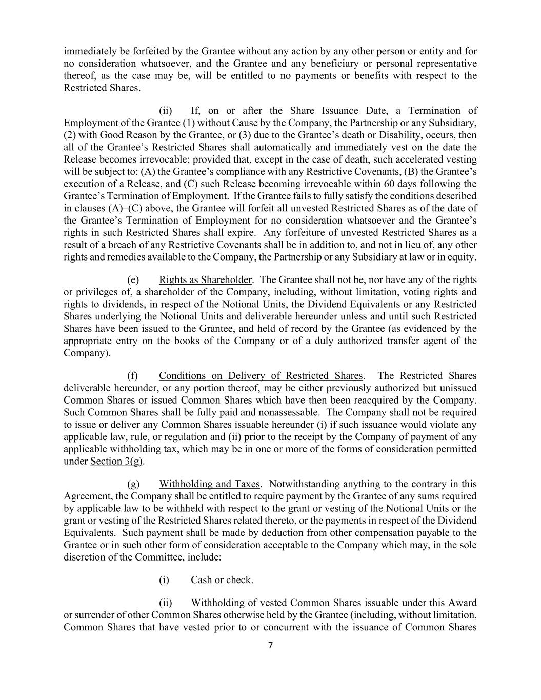 7 immediately be forfeited by the Grantee without any action by any other person or entity and for no consideration whatsoever, and the Grantee and any beneficiary or personal representative thereof, as the case may be, will be entitled to no payments or benefits with respect to the Restricted Shares. (ii) If, on or after the Share Issuance Date, a Termination of Employment of the Grantee (1) without Cause by the Company, the Partnership or any Subsidiary, (2) with Good Reason by the Grantee, or (3) due to the Grantee’s death or Disability, occurs, then all of the Grantee’s Restricted Shares shall automatically and immediately vest on the date the Release becomes irrevocable; provided that, except in the case of death, such accelerated vesting will be subject to: (A) the Grantee’s compliance with any Restrictive Covenants, (B) the Grantee’s execution of a Release, and (C) such Release becoming irrevocable within 60 days following the Grantee’s Termination of Employment. If the Grantee fails to fully satisfy the conditions described in clauses (A)–(C) above, the Grantee will forfeit all unvested Restricted Shares as of the date of the Grantee’s Termination of Employment for no consideration whatsoever and the Grantee’s rights in such Restricted Shares shall expire. Any forfeiture of unvested Restricted Shares as a result of a breach of any Restrictive Covenants shall be in addition to, and not in lieu of, any other rights and remedies available to the Company, the Partnership or any Subsidiary at law or in equity. (e) Rights as Shareholder. The Grantee shall not be, nor have any of the rights or privileges of, a shareholder of the Company, including, without limitation, voting rights and rights to dividends, in respect of the Notional Units, the Dividend Equivalents or any Restricted Shares underlying the Notional Units and deliverable hereunder unless and until such Restricted Shares have been issued to the Grantee, and held of record by the Grantee (as evidenced by the appropriate entry on the books of the Company or of a duly authorized transfer agent of the Company). (f) Conditions on Delivery of Restricted Shares. The Restricted Shares deliverable hereunder, or any portion thereof, may be either previously authorized but unissued Common Shares or issued Common Shares which have then been reacquired by the Company. Such Common Shares shall be fully paid and nonassessable. The Company shall not be required to issue or deliver any Common Shares issuable hereunder (i) if such issuance would violate any applicable law, rule, or regulation and (ii) prior to the receipt by the Company of payment of any applicable withholding tax, which may be in one or more of the forms of consideration permitted under Section 3(g). (g) Withholding and Taxes. Notwithstanding anything to the contrary in this Agreement, the Company shall be entitled to require payment by the Grantee of any sums required by applicable law to be withheld with respect to the grant or vesting of the Notional Units or the grant or vesting of the Restricted Shares related thereto, or the payments in respect of the Dividend Equivalents. Such payment shall be made by deduction from other compensation payable to the Grantee or in such other form of consideration acceptable to the Company which may, in the sole discretion of the Committee, include: (i) Cash or check. (ii) Withholding of vested Common Shares issuable under this Award or surrender of other Common Shares otherwise held by the Grantee (including, without limitation, Common Shares that have vested prior to or concurrent with the issuance of Common Shares
