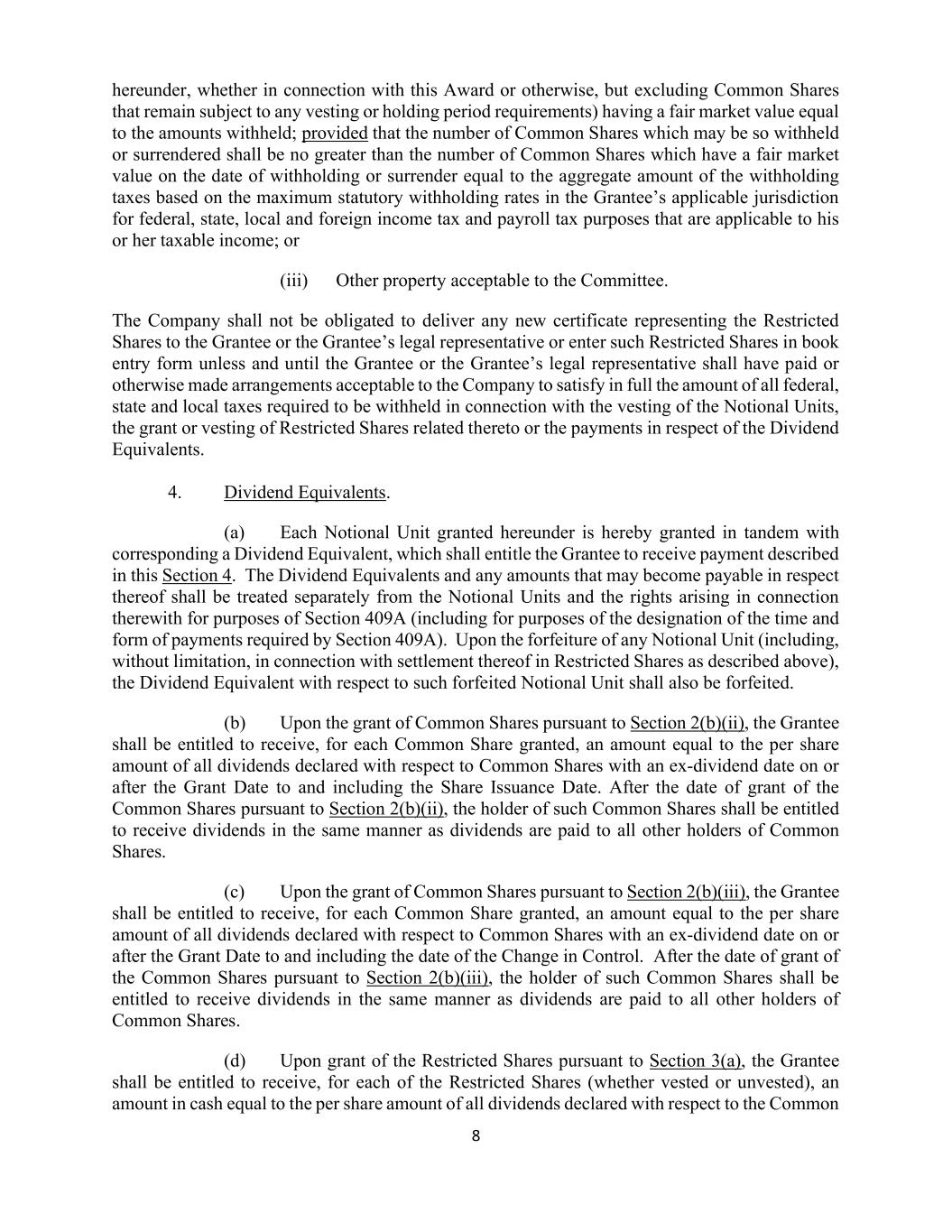 8 hereunder, whether in connection with this Award or otherwise, but excluding Common Shares that remain subject to any vesting or holding period requirements) having a fair market value equal to the amounts withheld; provided that the number of Common Shares which may be so withheld or surrendered shall be no greater than the number of Common Shares which have a fair market value on the date of withholding or surrender equal to the aggregate amount of the withholding taxes based on the maximum statutory withholding rates in the Grantee’s applicable jurisdiction for federal, state, local and foreign income tax and payroll tax purposes that are applicable to his or her taxable income; or (iii) Other property acceptable to the Committee. The Company shall not be obligated to deliver any new certificate representing the Restricted Shares to the Grantee or the Grantee’s legal representative or enter such Restricted Shares in book entry form unless and until the Grantee or the Grantee’s legal representative shall have paid or otherwise made arrangements acceptable to the Company to satisfy in full the amount of all federal, state and local taxes required to be withheld in connection with the vesting of the Notional Units, the grant or vesting of Restricted Shares related thereto or the payments in respect of the Dividend Equivalents. 4. Dividend Equivalents. (a) Each Notional Unit granted hereunder is hereby granted in tandem with corresponding a Dividend Equivalent, which shall entitle the Grantee to receive payment described in this Section 4. The Dividend Equivalents and any amounts that may become payable in respect thereof shall be treated separately from the Notional Units and the rights arising in connection therewith for purposes of Section 409A (including for purposes of the designation of the time and form of payments required by Section 409A). Upon the forfeiture of any Notional Unit (including, without limitation, in connection with settlement thereof in Restricted Shares as described above), the Dividend Equivalent with respect to such forfeited Notional Unit shall also be forfeited. (b) Upon the grant of Common Shares pursuant to Section 2(b)(ii), the Grantee shall be entitled to receive, for each Common Share granted, an amount equal to the per share amount of all dividends declared with respect to Common Shares with an ex-dividend date on or after the Grant Date to and including the Share Issuance Date. After the date of grant of the Common Shares pursuant to Section 2(b)(ii), the holder of such Common Shares shall be entitled to receive dividends in the same manner as dividends are paid to all other holders of Common Shares. (c) Upon the grant of Common Shares pursuant to Section 2(b)(iii), the Grantee shall be entitled to receive, for each Common Share granted, an amount equal to the per share amount of all dividends declared with respect to Common Shares with an ex-dividend date on or after the Grant Date to and including the date of the Change in Control. After the date of grant of the Common Shares pursuant to Section 2(b)(iii), the holder of such Common Shares shall be entitled to receive dividends in the same manner as dividends are paid to all other holders of Common Shares. (d) Upon grant of the Restricted Shares pursuant to Section 3(a), the Grantee shall be entitled to receive, for each of the Restricted Shares (whether vested or unvested), an amount in cash equal to the per share amount of all dividends declared with respect to the Common