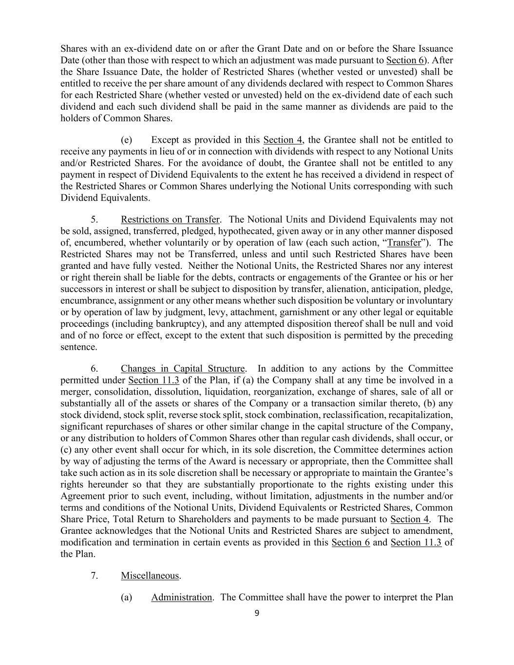 9 Shares with an ex-dividend date on or after the Grant Date and on or before the Share Issuance Date (other than those with respect to which an adjustment was made pursuant to Section 6). After the Share Issuance Date, the holder of Restricted Shares (whether vested or unvested) shall be entitled to receive the per share amount of any dividends declared with respect to Common Shares for each Restricted Share (whether vested or unvested) held on the ex-dividend date of each such dividend and each such dividend shall be paid in the same manner as dividends are paid to the holders of Common Shares. (e) Except as provided in this Section 4, the Grantee shall not be entitled to receive any payments in lieu of or in connection with dividends with respect to any Notional Units and/or Restricted Shares. For the avoidance of doubt, the Grantee shall not be entitled to any payment in respect of Dividend Equivalents to the extent he has received a dividend in respect of the Restricted Shares or Common Shares underlying the Notional Units corresponding with such Dividend Equivalents. 5. Restrictions on Transfer. The Notional Units and Dividend Equivalents may not be sold, assigned, transferred, pledged, hypothecated, given away or in any other manner disposed of, encumbered, whether voluntarily or by operation of law (each such action, “Transfer”). The Restricted Shares may not be Transferred, unless and until such Restricted Shares have been granted and have fully vested. Neither the Notional Units, the Restricted Shares nor any interest or right therein shall be liable for the debts, contracts or engagements of the Grantee or his or her successors in interest or shall be subject to disposition by transfer, alienation, anticipation, pledge, encumbrance, assignment or any other means whether such disposition be voluntary or involuntary or by operation of law by judgment, levy, attachment, garnishment or any other legal or equitable proceedings (including bankruptcy), and any attempted disposition thereof shall be null and void and of no force or effect, except to the extent that such disposition is permitted by the preceding sentence. 6. Changes in Capital Structure. In addition to any actions by the Committee permitted under Section 11.3 of the Plan, if (a) the Company shall at any time be involved in a merger, consolidation, dissolution, liquidation, reorganization, exchange of shares, sale of all or substantially all of the assets or shares of the Company or a transaction similar thereto, (b) any stock dividend, stock split, reverse stock split, stock combination, reclassification, recapitalization, significant repurchases of shares or other similar change in the capital structure of the Company, or any distribution to holders of Common Shares other than regular cash dividends, shall occur, or (c) any other event shall occur for which, in its sole discretion, the Committee determines action by way of adjusting the terms of the Award is necessary or appropriate, then the Committee shall take such action as in its sole discretion shall be necessary or appropriate to maintain the Grantee’s rights hereunder so that they are substantially proportionate to the rights existing under this Agreement prior to such event, including, without limitation, adjustments in the number and/or terms and conditions of the Notional Units, Dividend Equivalents or Restricted Shares, Common Share Price, Total Return to Shareholders and payments to be made pursuant to Section 4. The Grantee acknowledges that the Notional Units and Restricted Shares are subject to amendment, modification and termination in certain events as provided in this Section 6 and Section 11.3 of the Plan. 7. Miscellaneous. (a) Administration. The Committee shall have the power to interpret the Plan