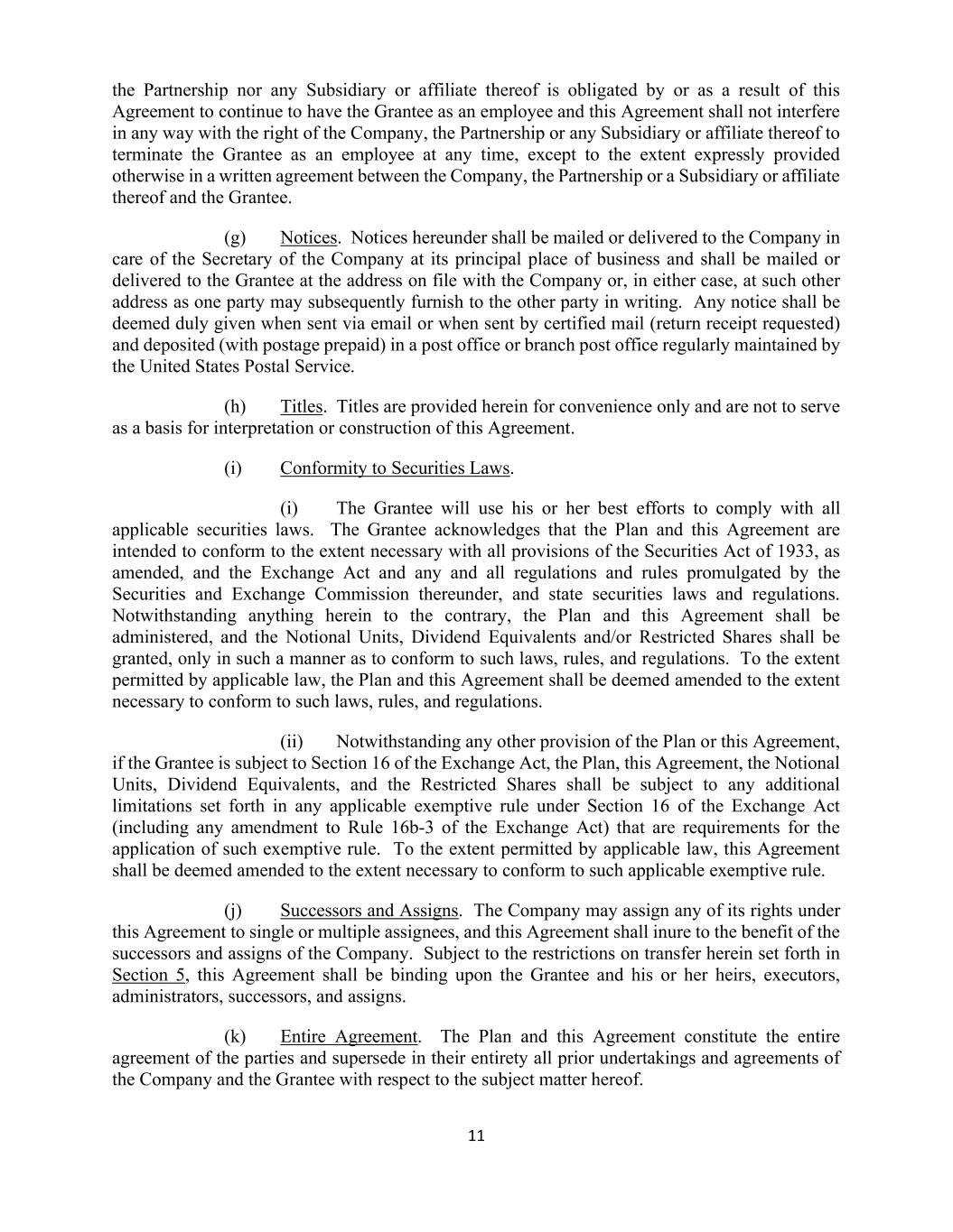 11 the Partnership nor any Subsidiary or affiliate thereof is obligated by or as a result of this Agreement to continue to have the Grantee as an employee and this Agreement shall not interfere in any way with the right of the Company, the Partnership or any Subsidiary or affiliate thereof to terminate the Grantee as an employee at any time, except to the extent expressly provided otherwise in a written agreement between the Company, the Partnership or a Subsidiary or affiliate thereof and the Grantee. (g) Notices. Notices hereunder shall be mailed or delivered to the Company in care of the Secretary of the Company at its principal place of business and shall be mailed or delivered to the Grantee at the address on file with the Company or, in either case, at such other address as one party may subsequently furnish to the other party in writing. Any notice shall be deemed duly given when sent via email or when sent by certified mail (return receipt requested) and deposited (with postage prepaid) in a post office or branch post office regularly maintained by the United States Postal Service. (h) Titles. Titles are provided herein for convenience only and are not to serve as a basis for interpretation or construction of this Agreement. (i) Conformity to Securities Laws. (i) The Grantee will use his or her best efforts to comply with all applicable securities laws. The Grantee acknowledges that the Plan and this Agreement are intended to conform to the extent necessary with all provisions of the Securities Act of 1933, as amended, and the Exchange Act and any and all regulations and rules promulgated by the Securities and Exchange Commission thereunder, and state securities laws and regulations. Notwithstanding anything herein to the contrary, the Plan and this Agreement shall be administered, and the Notional Units, Dividend Equivalents and/or Restricted Shares shall be granted, only in such a manner as to conform to such laws, rules, and regulations. To the extent permitted by applicable law, the Plan and this Agreement shall be deemed amended to the extent necessary to conform to such laws, rules, and regulations. (ii) Notwithstanding any other provision of the Plan or this Agreement, if the Grantee is subject to Section 16 of the Exchange Act, the Plan, this Agreement, the Notional Units, Dividend Equivalents, and the Restricted Shares shall be subject to any additional limitations set forth in any applicable exemptive rule under Section 16 of the Exchange Act (including any amendment to Rule 16b-3 of the Exchange Act) that are requirements for the application of such exemptive rule. To the extent permitted by applicable law, this Agreement shall be deemed amended to the extent necessary to conform to such applicable exemptive rule. (j) Successors and Assigns. The Company may assign any of its rights under this Agreement to single or multiple assignees, and this Agreement shall inure to the benefit of the successors and assigns of the Company. Subject to the restrictions on transfer herein set forth in Section 5, this Agreement shall be binding upon the Grantee and his or her heirs, executors, administrators, successors, and assigns. (k) Entire Agreement. The Plan and this Agreement constitute the entire agreement of the parties and supersede in their entirety all prior undertakings and agreements of the Company and the Grantee with respect to the subject matter hereof.