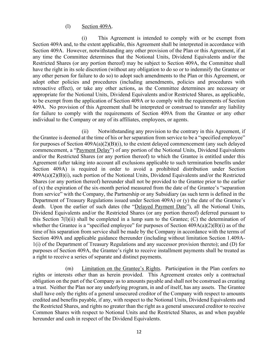12 (l) Section 409A. (i) This Agreement is intended to comply with or be exempt from Section 409A and, to the extent applicable, this Agreement shall be interpreted in accordance with Section 409A. However, notwithstanding any other provision of the Plan or this Agreement, if at any time the Committee determines that the Notional Units, Dividend Equivalents and/or the Restricted Shares (or any portion thereof) may be subject to Section 409A, the Committee shall have the right in its sole discretion (without any obligation to do so or to indemnify the Grantee or any other person for failure to do so) to adopt such amendments to the Plan or this Agreement, or adopt other policies and procedures (including amendments, policies and procedures with retroactive effect), or take any other actions, as the Committee determines are necessary or appropriate for the Notional Units, Dividend Equivalents and/or Restricted Shares, as applicable, to be exempt from the application of Section 409A or to comply with the requirements of Section 409A. No provision of this Agreement shall be interpreted or construed to transfer any liability for failure to comply with the requirements of Section 409A from the Grantee or any other individual to the Company or any of its affiliates, employees, or agents. (ii) Notwithstanding any provision to the contrary in this Agreement, if the Grantee is deemed at the time of his or her separation from service to be a “specified employee” for purposes of Section 409A(a)(2)(B)(i), to the extent delayed commencement (any such delayed commencement, a “Payment Delay”) of any portion of the Notional Units, Dividend Equivalents and/or the Restricted Shares (or any portion thereof) to which the Grantee is entitled under this Agreement (after taking into account all exclusions applicable to such termination benefits under Section 409A) is required in order to avoid a prohibited distribution under Section 409A(a)(2)(B)(i), such portion of the Notional Units, Dividend Equivalents and/or the Restricted Shares (or any portion thereof) hereunder shall not be provided to the Grantee prior to the earlier of (x) the expiration of the six-month period measured from the date of the Grantee’s “separation from service” with the Company, the Partnership or any Subsidiary (as such term is defined in the Department of Treasury Regulations issued under Section 409A) or (y) the date of the Grantee’s death. Upon the earlier of such dates (the “Delayed Payment Date”), all the Notional Units, Dividend Equivalents and/or the Restricted Shares (or any portion thereof) deferred pursuant to this Section 7(l)(ii) shall be completed in a lump sum to the Grantee; (C) the determination of whether the Grantee is a “specified employee” for purposes of Section 409A(a)(2)(B)(i) as of the time of his separation from service shall be made by the Company in accordance with the terms of Section 409A and applicable guidance thereunder (including without limitation Section 1.409A- 1(i) of the Department of Treasury Regulations and any successor provision thereto); and (D) for purposes of Section 409A, the Grantee’s right to receive installment payments shall be treated as a right to receive a series of separate and distinct payments. (m) Limitation on the Grantee’s Rights. Participation in the Plan confers no rights or interests other than as herein provided. This Agreement creates only a contractual obligation on the part of the Company as to amounts payable and shall not be construed as creating a trust. Neither the Plan nor any underlying program, in and of itself, has any assets. The Grantee shall have only the rights of a general unsecured creditor of the Company with respect to amounts credited and benefits payable, if any, with respect to the Notional Units, Dividend Equivalents and the Restricted Shares, and rights no greater than the right as a general unsecured creditor to receive Common Shares with respect to Notional Units and the Restricted Shares, as and when payable hereunder and cash in respect of the Dividend Equivalents.