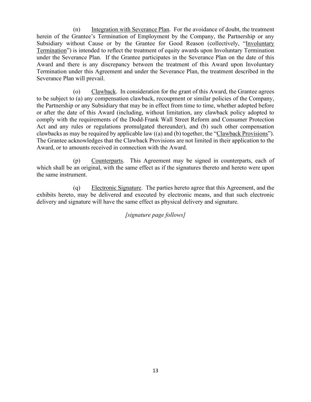 13 (n) Integration with Severance Plan. For the avoidance of doubt, the treatment herein of the Grantee’s Termination of Employment by the Company, the Partnership or any Subsidiary without Cause or by the Grantee for Good Reason (collectively, “Involuntary Termination”) is intended to reflect the treatment of equity awards upon Involuntary Termination under the Severance Plan. If the Grantee participates in the Severance Plan on the date of this Award and there is any discrepancy between the treatment of this Award upon Involuntary Termination under this Agreement and under the Severance Plan, the treatment described in the Severance Plan will prevail. (o) Clawback. In consideration for the grant of this Award, the Grantee agrees to be subject to (a) any compensation clawback, recoupment or similar policies of the Company, the Partnership or any Subsidiary that may be in effect from time to time, whether adopted before or after the date of this Award (including, without limitation, any clawback policy adopted to comply with the requirements of the Dodd-Frank Wall Street Reform and Consumer Protection Act and any rules or regulations promulgated thereunder), and (b) such other compensation clawbacks as may be required by applicable law ((a) and (b) together, the “Clawback Provisions”). The Grantee acknowledges that the Clawback Provisions are not limited in their application to the Award, or to amounts received in connection with the Award. (p) Counterparts. This Agreement may be signed in counterparts, each of which shall be an original, with the same effect as if the signatures thereto and hereto were upon the same instrument. (q) Electronic Signature. The parties hereto agree that this Agreement, and the exhibits hereto, may be delivered and executed by electronic means, and that such electronic delivery and signature will have the same effect as physical delivery and signature. [signature page follows]