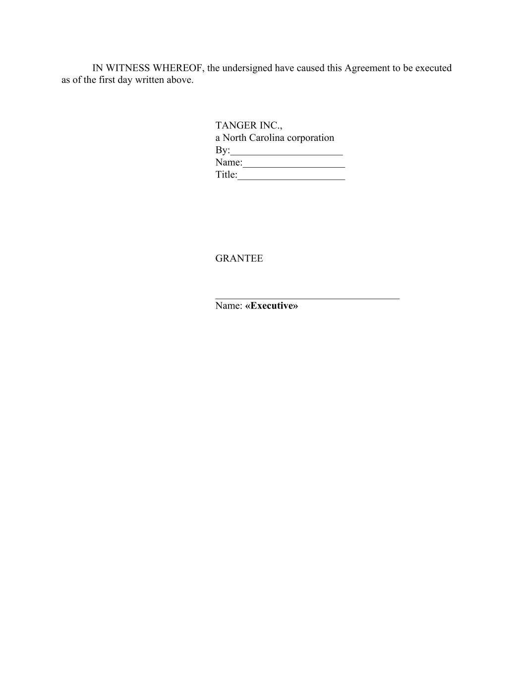 IN WITNESS WHEREOF, the undersigned have caused this Agreement to be executed as of the first day written above. TANGER INC., a North Carolina corporation By:______________________ Name:____________________ Title:_____________________ GRANTEE ____________________________________ Name: «Executive»