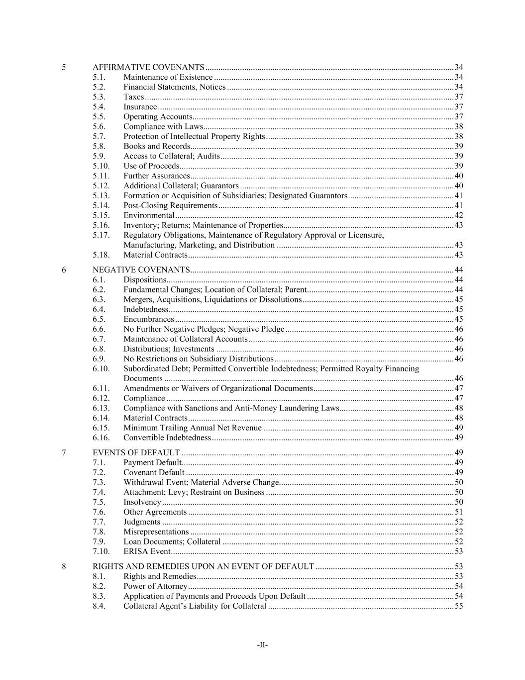 -II- 5 AFFIRMATIVE COVENANTS ................................................................................................................... 34 5.1. Maintenance of Existence ............................................................................................................... 34 5.2. Financial Statements, Notices ......................................................................................................... 34 5.3. Taxes ............................................................................................................................................... 37 5.4. Insurance ......................................................................................................................................... 37 5.5. Operating Accounts......................................................................................................................... 37 5.6. Compliance with Laws .................................................................................................................... 38 5.7. Protection of Intellectual Property Rights ....................................................................................... 38 5.8. Books and Records.......................................................................................................................... 39 5.9. Access to Collateral; Audits ............................................................................................................ 39 5.10. Use of Proceeds ............................................................................................................................... 39 5.11. Further Assurances .......................................................................................................................... 40 5.12. Additional Collateral; Guarantors ................................................................................................... 40 5.13. Formation or Acquisition of Subsidiaries; Designated Guarantors ................................................. 41 5.14. Post-Closing Requirements ............................................................................................................. 41 5.15. Environmental ................................................................................................................................. 42 5.16. Inventory; Returns; Maintenance of Properties............................................................................... 43 5.17. Regulatory Obligations, Maintenance of Regulatory Approval or Licensure, Manufacturing, Marketing, and Distribution .................................................................................. 43 5.18. Material Contracts ........................................................................................................................... 43 6 NEGATIVE COVENANTS .......................................................................................................................... 44 6.1. Dispositions..................................................................................................................................... 44 6.2. Fundamental Changes; Location of Collateral; Parent .................................................................... 44 6.3. Mergers, Acquisitions, Liquidations or Dissolutions ...................................................................... 45 6.4. Indebtedness .................................................................................................................................... 45 6.5. Encumbrances ................................................................................................................................. 45 6.6. No Further Negative Pledges; Negative Pledge .............................................................................. 46 6.7. Maintenance of Collateral Accounts ............................................................................................... 46 6.8. Distributions; Investments .............................................................................................................. 46 6.9. No Restrictions on Subsidiary Distributions ................................................................................... 46 6.10. Subordinated Debt; Permitted Convertible Indebtedness; Permitted Royalty Financing Documents ...................................................................................................................................... 46 6.11. Amendments or Waivers of Organizational Documents ................................................................. 47 6.12. Compliance ..................................................................................................................................... 47 6.13. Compliance with Sanctions and Anti-Money Laundering Laws..................................................... 48 6.14. Material Contracts ........................................................................................................................... 48 6.15. Minimum Trailing Annual Net Revenue ........................................................................................ 49 6.16. Convertible Indebtedness ................................................................................................................ 49 7 EVENTS OF DEFAULT .............................................................................................................................. 49 7.1. Payment Default .............................................................................................................................. 49 7.2. Covenant Default ............................................................................................................................ 49 7.3. Withdrawal Event; Material Adverse Change................................................................................. 50 7.4. Attachment; Levy; Restraint on Business ..............................................