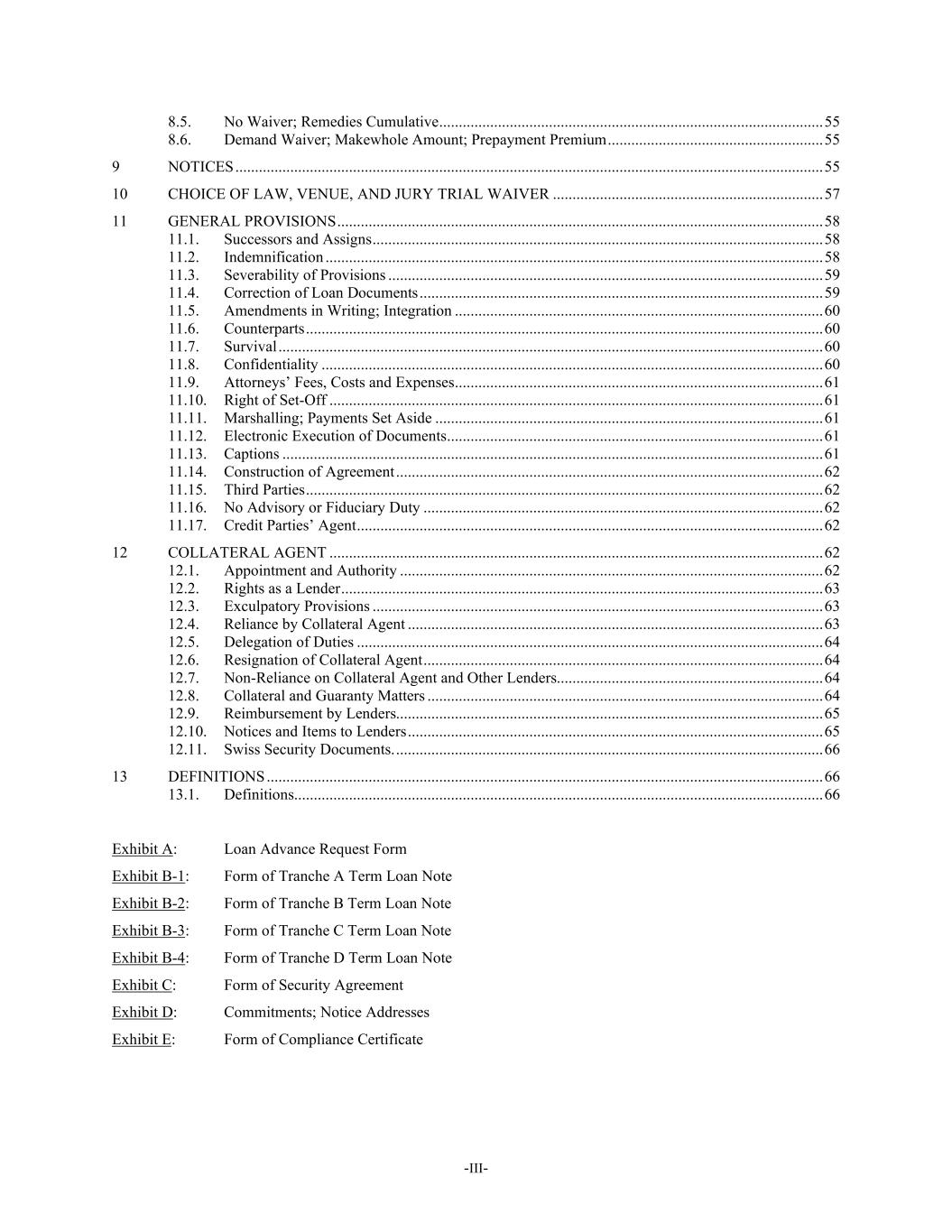 -III- 8.5. No Waiver; Remedies Cumulative .................................................................................................. 55 8.6. Demand Waiver; Makewhole Amount; Prepayment Premium ....................................................... 55 9 NOTICES ...................................................................................................................................................... 55 10 CHOICE OF LAW, VENUE, AND JURY TRIAL WAIVER ..................................................................... 57 11 GENERAL PROVISIONS ............................................................................................................................ 58 11.1. Successors and Assigns ................................................................................................................... 58 11.2. Indemnification ............................................................................................................................... 58 11.3. Severability of Provisions ............................................................................................................... 59 11.4. Correction of Loan Documents ....................................................................................................... 59 11.5. Amendments in Writing; Integration .............................................................................................. 60 11.6. Counterparts .................................................................................................................................... 60 11.7. Survival ........................................................................................................................................... 60 11.8. Confidentiality ................................................................................................................................ 60 11.9. Attorneys’ Fees, Costs and Expenses .............................................................................................. 61 11.10. Right of Set-Off .............................................................................................................................. 61 11.11. Marshalling; Payments Set Aside ................................................................................................... 61 11.12. Electronic Execution of Documents ................................................................................................ 61 11.13. Captions .......................................................................................................................................... 61 11.14. Construction of Agreement ............................................................................................................. 62 11.15. Third Parties .................................................................................................................................... 62 11.16. No Advisory or Fiduciary Duty ...................................................................................................... 62 11.17. Credit Parties’ Agent ....................................................................................................................... 62 12 COLLATERAL AGENT .............................................................................................................................. 62 12.1. Appointment and Authority ............................................................................................................ 62 12.2. Rights as a Lender ........................................................................................................................... 63 12.3. Exculpatory Provisions ................................................................................................................... 63 12.4. Reliance by Collateral Agent .......................................................................................................... 63 12.5. Delegation of Duties ....................................................................................................................... 64 12.6. Resignation of Collateral Agent ...................................................................................................... 64 12.7. Non-Reliance on Collateral Agent and Other Lenders .................................................................... 64 12.8. Collateral and Guaranty Matters ..................................................................................................... 64 12.9. Reimbursement by Lenders............................................................................................................. 65 12.10. Notices and Items to Lenders .......................................................................................................... 65 12.11. Swiss Security Documents. ............................................................................................................. 66 13 DEFINITIONS .............................................................................................................................................. 66 13.1. Definitions....................................................................................................................................... 66 Exhibit A: Loan Advance Request Form Exhibit B-1: Form of Tranche A Term Loan Note Exhibit B-2: Form of Tranche B Term Loan Note Exhibit B-3: Form of Tranche C Term Loan Note Exhibit B-4: Form of Tranche D Term Loan Note Exhibit C: Form of Security Agreement Exhibit D: Commitments; Notice Addresses Exhibit E: Form of Compliance Certificate