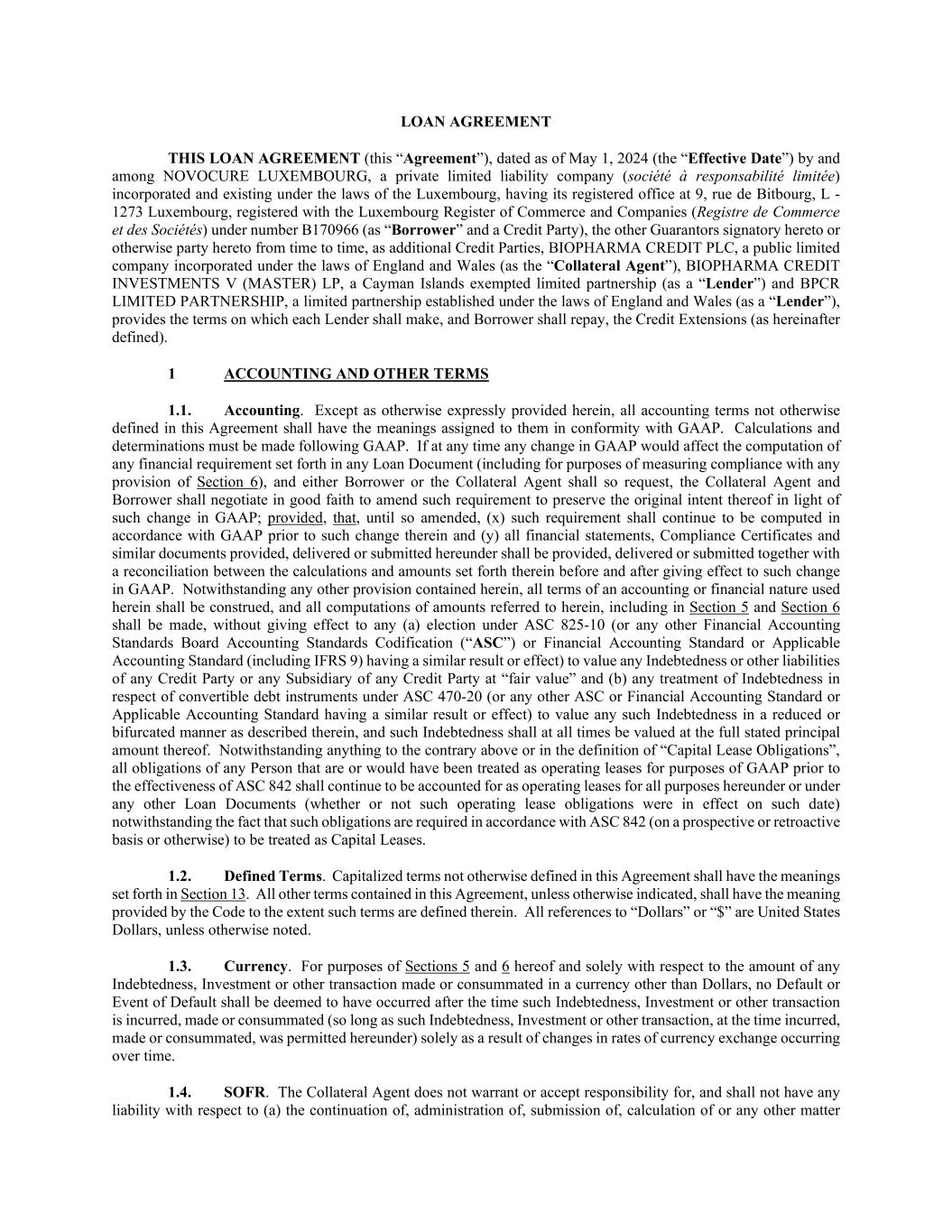 LOAN AGREEMENT THIS LOAN AGREEMENT (this “Agreement”), dated as of May 1, 2024 (the “Effective Date”) by and among NOVOCURE LUXEMBOURG, a private limited liability company (société à responsabilité limitée) incorporated and existing under the laws of the Luxembourg, having its registered office at 9, rue de Bitbourg, L - 1273 Luxembourg, registered with the Luxembourg Register of Commerce and Companies (Registre de Commerce et des Sociétés) under number B170966 (as “Borrower” and a Credit Party), the other Guarantors signatory hereto or otherwise party hereto from time to time, as additional Credit Parties, BIOPHARMA CREDIT PLC, a public limited company incorporated under the laws of England and Wales (as the “Collateral Agent”), BIOPHARMA CREDIT INVESTMENTS V (MASTER) LP, a Cayman Islands exempted limited partnership (as a “Lender”) and BPCR LIMITED PARTNERSHIP, a limited partnership established under the laws of England and Wales (as a “Lender”), provides the terms on which each Lender shall make, and Borrower shall repay, the Credit Extensions (as hereinafter defined). 1 ACCOUNTING AND OTHER TERMS 1.1. Accounting. Except as otherwise expressly provided herein, all accounting terms not otherwise defined in this Agreement shall have the meanings assigned to them in conformity with GAAP. Calculations and determinations must be made following GAAP. If at any time any change in GAAP would affect the computation of any financial requirement set forth in any Loan Document (including for purposes of measuring compliance with any provision of Section 6), and either Borrower or the Collateral Agent shall so request, the Collateral Agent and Borrower shall negotiate in good faith to amend such requirement to preserve the original intent thereof in light of such change in GAAP; provided, that, until so amended, (x) such requirement shall continue to be computed in accordance with GAAP prior to such change therein and (y) all financial statements, Compliance Certificates and similar documents provided, delivered or submitted hereunder shall be provided, delivered or submitted together with a reconciliation between the calculations and amounts set forth therein before and after giving effect to such change in GAAP. Notwithstanding any other provision contained herein, all terms of an accounting or financial nature used herein shall be construed, and all computations of amounts referred to herein, including in Section 5 and Section 6 shall be made, without giving effect to any (a) election under ASC 825-10 (or any other Financial Accounting Standards Board Accounting Standards Codification (“ASC”) or Financial Accounting Standard or Applicable Accounting Standard (including IFRS 9) having a similar result or effect) to value any Indebtedness or other liabilities of any Credit Party or any Subsidiary of any Credit Party at “fair value” and (b) any treatment of Indebtedness in respect of convertible debt instruments under ASC 470-20 (or any other ASC or Financial Accounting Standard or Applicable Accounting Standard having a similar result or effect) to value any such Indebtedness in a reduced or bifurcated manner as described therein, and such Indebtedness shall at all times be valued at the full stated principal amount thereof. Notwithstanding anything to the contrary above or in the definition of “Capital Lease Obligations”, all obligations of any Person that are or would have been treated as operating leases for purposes of GAAP prior to the effectiveness of ASC 842 shall continue to be accounted for as operating leases for all purposes hereunder or under any other Loan Documents (whether or not such operating lease obligations were in effect on such date) notwithstanding the fact that such obligations are required in accordance with ASC 842 (on a prospective or retroactive basis or otherwise) to be treated as Capital Leases. 1.2. Defined Terms. Capitalized terms not otherwise defined in this Agreement shall have the meanings set forth in Section 13. All other terms contained in this Agreement, unless otherwise indicated, shall have the meaning provided by the Code to the extent such terms are defined therein. All references to “Dollars” or “$” are United States Dollars, unless otherwise noted. 1.3. Currency. For purposes of Sections 5 and 6 hereof and solely with respect to the amount of any Indebtedness, Investment or other transaction made or consummated in a currency other than Dollars, no Default or Event of Default shall be deemed to have occurred after the time such Indebtedness, Investment or other transaction is incurred, made or consummated (so long as such Indebtedness, Investment or other transaction, at the time incurred, made or consummated, was permitted hereunder) solely as a result of changes in rates of currency exchange occurring over time. 1.4. SOFR. The Collateral Agent does not warrant or accept responsibility for, and shall not have any liability with respect to (a) the continuation of, administration of, submission of, calculation of or any other matter