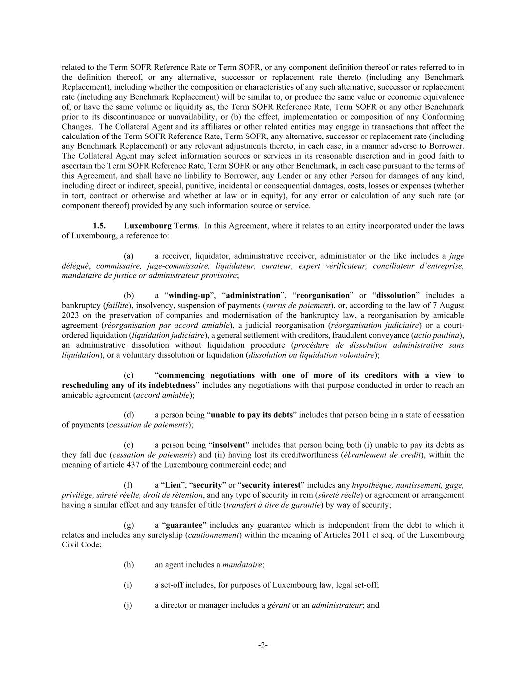 -2- related to the Term SOFR Reference Rate or Term SOFR, or any component definition thereof or rates referred to in the definition thereof, or any alternative, successor or replacement rate thereto (including any Benchmark Replacement), including whether the composition or characteristics of any such alternative, successor or replacement rate (including any Benchmark Replacement) will be similar to, or produce the same value or economic equivalence of, or have the same volume or liquidity as, the Term SOFR Reference Rate, Term SOFR or any other Benchmark prior to its discontinuance or unavailability, or (b) the effect, implementation or composition of any Conforming Changes. The Collateral Agent and its affiliates or other related entities may engage in transactions that affect the calculation of the Term SOFR Reference Rate, Term SOFR, any alternative, successor or replacement rate (including any Benchmark Replacement) or any relevant adjustments thereto, in each case, in a manner adverse to Borrower. The Collateral Agent may select information sources or services in its reasonable discretion and in good faith to ascertain the Term SOFR Reference Rate, Term SOFR or any other Benchmark, in each case pursuant to the terms of this Agreement, and shall have no liability to Borrower, any Lender or any other Person for damages of any kind, including direct or indirect, special, punitive, incidental or consequential damages, costs, losses or expenses (whether in tort, contract or otherwise and whether at law or in equity), for any error or calculation of any such rate (or component thereof) provided by any such information source or service. 1.5. Luxembourg Terms. In this Agreement, where it relates to an entity incorporated under the laws of Luxembourg, a reference to: (a) a receiver, liquidator, administrative receiver, administrator or the like includes a juge délégué, commissaire, juge-commissaire, liquidateur, curateur, expert vérificateur, conciliateur d’entreprise, mandataire de justice or administrateur provisoire; (b) a “winding-up”, “administration”, “reorganisation” or “dissolution” includes a bankruptcy (faillite), insolvency, suspension of payments (sursis de paiement), or, according to the law of 7 August 2023 on the preservation of companies and modernisation of the bankruptcy law, a reorganisation by amicable agreement (réorganisation par accord amiable), a judicial reorganisation (réorganisation judiciaire) or a court- ordered liquidation (liquidation judiciaire), a general settlement with creditors, fraudulent conveyance (actio paulina), an administrative dissolution without liquidation procedure (procédure de dissolution administrative sans liquidation), or a voluntary dissolution or liquidation (dissolution ou liquidation volontaire); (c) “commencing negotiations with one of more of its creditors with a view to rescheduling any of its indebtedness” includes any negotiations with that purpose conducted in order to reach an amicable agreement (accord amiable); (d) a person being “unable to pay its debts” includes that person being in a state of cessation of payments (cessation de paiements); (e) a person being “insolvent” includes that person being both (i) unable to pay its debts as they fall due (cessation de paiements) and (ii) having lost its creditworthiness (ébranlement de credit), within the meaning of article 437 of the Luxembourg commercial code; and (f) a “Lien”, “security” or “security interest” includes any hypothèque, nantissement, gage, privilège, sûreté réelle, droit de rétention, and any type of security in rem (sûreté réelle) or agreement or arrangement having a similar effect and any transfer of title (transfert à titre de garantie) by way of security; (g) a “guarantee” includes any guarantee which is independent from the debt to which it relates and includes any suretyship (cautionnement) within the meaning of Articles 2011 et seq. of the Luxembourg Civil Code; (h) an agent includes a mandataire; (i) a set-off includes, for purposes of Luxembourg law, legal set-off; (j) a director or manager includes a gérant or an administrateur; and