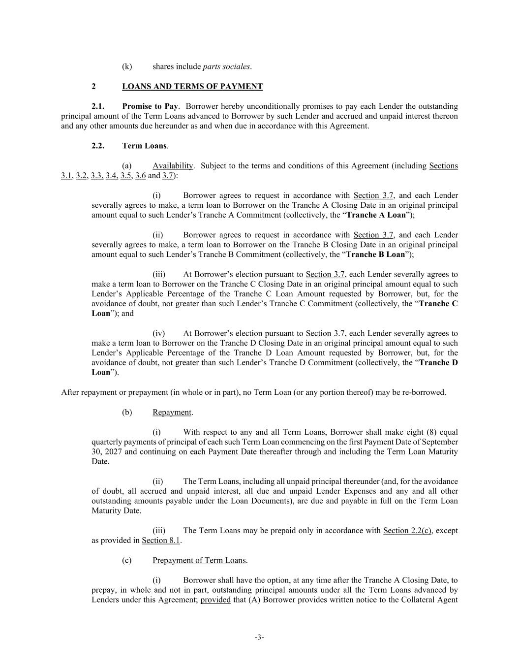 -3- (k) shares include parts sociales. 2 LOANS AND TERMS OF PAYMENT 2.1. Promise to Pay. Borrower hereby unconditionally promises to pay each Lender the outstanding principal amount of the Term Loans advanced to Borrower by such Lender and accrued and unpaid interest thereon and any other amounts due hereunder as and when due in accordance with this Agreement. 2.2. Term Loans. (a) Availability. Subject to the terms and conditions of this Agreement (including Sections 3.1, 3.2, 3.3, 3.4, 3.5, 3.6 and 3.7): (i) Borrower agrees to request in accordance with Section 3.7, and each Lender severally agrees to make, a term loan to Borrower on the Tranche A Closing Date in an original principal amount equal to such Lender’s Tranche A Commitment (collectively, the “Tranche A Loan”); (ii) Borrower agrees to request in accordance with Section 3.7, and each Lender severally agrees to make, a term loan to Borrower on the Tranche B Closing Date in an original principal amount equal to such Lender’s Tranche B Commitment (collectively, the “Tranche B Loan”); (iii) At Borrower’s election pursuant to Section 3.7, each Lender severally agrees to make a term loan to Borrower on the Tranche C Closing Date in an original principal amount equal to such Lender’s Applicable Percentage of the Tranche C Loan Amount requested by Borrower, but, for the avoidance of doubt, not greater than such Lender’s Tranche C Commitment (collectively, the “Tranche C Loan”); and (iv) At Borrower’s election pursuant to Section 3.7, each Lender severally agrees to make a term loan to Borrower on the Tranche D Closing Date in an original principal amount equal to such Lender’s Applicable Percentage of the Tranche D Loan Amount requested by Borrower, but, for the avoidance of doubt, not greater than such Lender’s Tranche D Commitment (collectively, the “Tranche D Loan”). After repayment or prepayment (in whole or in part), no Term Loan (or any portion thereof) may be re-borrowed. (b) Repayment. (i) With respect to any and all Term Loans, Borrower shall make eight (8) equal quarterly payments of principal of each such Term Loan commencing on the first Payment Date of September 30, 2027 and continuing on each Payment Date thereafter through and including the Term Loan Maturity Date. (ii) The Term Loans, including all unpaid principal thereunder (and, for the avoidance of doubt, all accrued and unpaid interest, all due and unpaid Lender Expenses and any and all other outstanding amounts payable under the Loan Documents), are due and payable in full on the Term Loan Maturity Date. (iii) The Term Loans may be prepaid only in accordance with Section 2.2(c), except as provided in Section 8.1. (c) Prepayment of Term Loans. (i) Borrower shall have the option, at any time after the Tranche A Closing Date, to prepay, in whole and not in part, outstanding principal amounts under all the Term Loans advanced by Lenders under this Agreement; provided that (A) Borrower provides written notice to the Collateral Agent