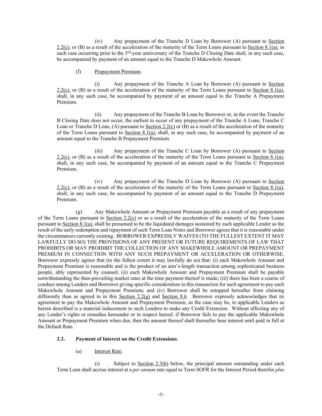 -5- (iv) Any prepayment of the Tranche D Loan by Borrower (A) pursuant to Section 2.2(c), or (B) as a result of the acceleration of the maturity of the Term Loans pursuant to Section 8.1(a), in each case occurring prior to the 3rd-year anniversary of the Tranche D Closing Date shall, in any such case, be accompanied by payment of an amount equal to the Tranche D Makewhole Amount. (f) Prepayment Premium. (i) Any prepayment of the Tranche A Loan by Borrower (A) pursuant to Section 2.2(c), or (B) as a result of the acceleration of the maturity of the Term Loans pursuant to Section 8.1(a), shall, in any such case, be accompanied by payment of an amount equal to the Tranche A Prepayment Premium. (ii) Any prepayment of the Tranche B Loan by Borrower or, in the event the Tranche B Closing Date does not occur, the earliest to occur of any prepayment of the Tranche A Loan, Tranche C Loan or Tranche D Loan, (A) pursuant to Section 2.2(c) or (B) as a result of the acceleration of the maturity of the Term Loans pursuant to Section 8.1(a), shall, in any such case, be accompanied by payment of an amount equal to the Tranche B Prepayment Premium. (iii) Any prepayment of the Tranche C Loan by Borrower (A) pursuant to Section 2.2(c), or (B) as a result of the acceleration of the maturity of the Term Loans pursuant to Section 8.1(a), shall, in any such case, be accompanied by payment of an amount equal to the Tranche C Prepayment Premium. (iv) Any prepayment of the Tranche D Loan by Borrower (A) pursuant to Section 2.2(c), or (B) as a result of the acceleration of the maturity of the Term Loans pursuant to Section 8.1(a), shall, in any such case, be accompanied by payment of an amount equal to the Tranche D Prepayment Premium. (g) Any Makewhole Amount or Prepayment Premium payable as a result of any prepayment of the Term Loans pursuant to Section 2.2(c) or as a result of the acceleration of the maturity of the Term Loans pursuant to Section 8.1(a), shall be presumed to be the liquidated damages sustained by each applicable Lender as the result of the early redemption and repayment of such Term Loan Notes and Borrower agrees that it is reasonable under the circumstances currently existing. BORROWER EXPRESSLY WAIVES (TO THE FULLEST EXTENT IT MAY LAWFULLY DO SO) THE PROVISIONS OF ANY PRESENT OR FUTURE REQUIREMENTS OF LAW THAT PROHIBITS OR MAY PROHIBIT THE COLLECTION OF ANY MAKEWHOLE AMOUNT OR PREPAYMENT PREMIUM IN CONNECTION WITH ANY SUCH PREPAYMENT OR ACCELERATION OR OTHERWISE. Borrower expressly agrees that (to the fullest extent it may lawfully do so) that: (i) each Makewhole Amount and Prepayment Premium is reasonable and is the product of an arm’s-length transaction among sophisticated business people, ably represented by counsel; (ii) each Makewhole Amount and Prepayment Premium shall be payable notwithstanding the then-prevailing market rates at the time payment thereof is made; (iii) there has been a course of conduct among Lenders and Borrower giving specific consideration in this transaction for such agreement to pay each Makewhole Amount and Prepayment Premium; and (iv) Borrower shall be estopped hereafter from claiming differently than as agreed to in this Section 2.2(g) and Section 8.6. Borrower expressly acknowledges that its agreement to pay the Makewhole Amount and Prepayment Premium, as the case may be, to applicable Lenders as herein described is a material inducement to such Lenders to make any Credit Extension. Without affecting any of any Lender’s rights or remedies hereunder or in respect hereof, if Borrower fails to pay the applicable Makewhole Amount or Prepayment Premium when due, then the amount thereof shall thereafter bear interest until paid in full at the Default Rate. 2.3. Payment of Interest on the Credit Extensions. (a) Interest Rate. (i) Subject to Section 2.3(b) below, the principal amount outstanding under each Term Loan shall accrue interest at a per annum rate equal to Term SOFR for the Interest Period therefor plus