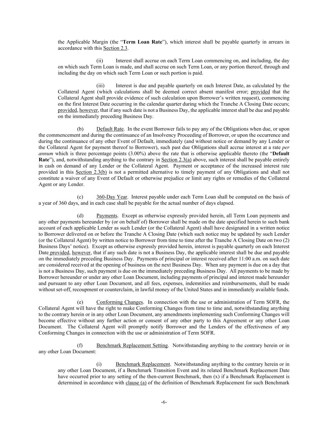 -6- the Applicable Margin (the “Term Loan Rate”), which interest shall be payable quarterly in arrears in accordance with this Section 2.3. (ii) Interest shall accrue on each Term Loan commencing on, and including, the day on which such Term Loan is made, and shall accrue on such Term Loan, or any portion thereof, through and including the day on which such Term Loan or such portion is paid. (iii) Interest is due and payable quarterly on each Interest Date, as calculated by the Collateral Agent (which calculations shall be deemed correct absent manifest error; provided that the Collateral Agent shall provide evidence of such calculation upon Borrower’s written request), commencing on the first Interest Date occurring in the calendar quarter during which the Tranche A Closing Date occurs; provided, however, that if any such date is not a Business Day, the applicable interest shall be due and payable on the immediately preceding Business Day. (b) Default Rate. In the event Borrower fails to pay any of the Obligations when due, or upon the commencement and during the continuance of an Insolvency Proceeding of Borrower, or upon the occurrence and during the continuance of any other Event of Default, immediately (and without notice or demand by any Lender or the Collateral Agent for payment thereof to Borrower), such past due Obligations shall accrue interest at a rate per annum which is three percentage points (3.00%) above the rate that is otherwise applicable thereto (the “Default Rate”), and, notwithstanding anything to the contrary in Section 2.3(a) above, such interest shall be payable entirely in cash on demand of any Lender or the Collateral Agent. Payment or acceptance of the increased interest rate provided in this Section 2.3(b) is not a permitted alternative to timely payment of any Obligations and shall not constitute a waiver of any Event of Default or otherwise prejudice or limit any rights or remedies of the Collateral Agent or any Lender. (c) 360-Day Year. Interest payable under each Term Loan shall be computed on the basis of a year of 360 days, and in each case shall be payable for the actual number of days elapsed. (d) Payments. Except as otherwise expressly provided herein, all Term Loan payments and any other payments hereunder by (or on behalf of) Borrower shall be made on the date specified herein to such bank account of each applicable Lender as such Lender (or the Collateral Agent) shall have designated in a written notice to Borrower delivered on or before the Tranche A Closing Date (which such notice may be updated by such Lender (or the Collateral Agent) by written notice to Borrower from time to time after the Tranche A Closing Date on two (2) Business Days’ notice). Except as otherwise expressly provided herein, interest is payable quarterly on each Interest Date provided, however, that if any such date is not a Business Day, the applicable interest shall be due and payable on the immediately preceding Business Day. Payments of principal or interest received after 11:00 a.m. on such date are considered received at the opening of business on the next Business Day. When any payment is due on a day that is not a Business Day, such payment is due on the immediately preceding Business Day. All payments to be made by Borrower hereunder or under any other Loan Document, including payments of principal and interest made hereunder and pursuant to any other Loan Document, and all fees, expenses, indemnities and reimbursements, shall be made without set-off, recoupment or counterclaim, in lawful money of the United States and in immediately available funds. (e) Conforming Changes. In connection with the use or administration of Term SOFR, the Collateral Agent will have the right to make Conforming Changes from time to time and, notwithstanding anything to the contrary herein or in any other Loan Document, any amendments implementing such Conforming Changes will become effective without any further action or consent of any other party to this Agreement or any other Loan Document. The Collateral Agent will promptly notify Borrower and the Lenders of the effectiveness of any Conforming Changes in connection with the use or administration of Term SOFR. (f) Benchmark Replacement Setting. Notwithstanding anything to the contrary herein or in any other Loan Document: (i) Benchmark Replacement. Notwithstanding anything to the contrary herein or in any other Loan Document, if a Benchmark Transition Event and its related Benchmark Replacement Date have occurred prior to any setting of the then-current Benchmark, then (x) if a Benchmark Replacement is determined in accordance with clause (a) of the definition of Benchmark Replacement for such Benchmark