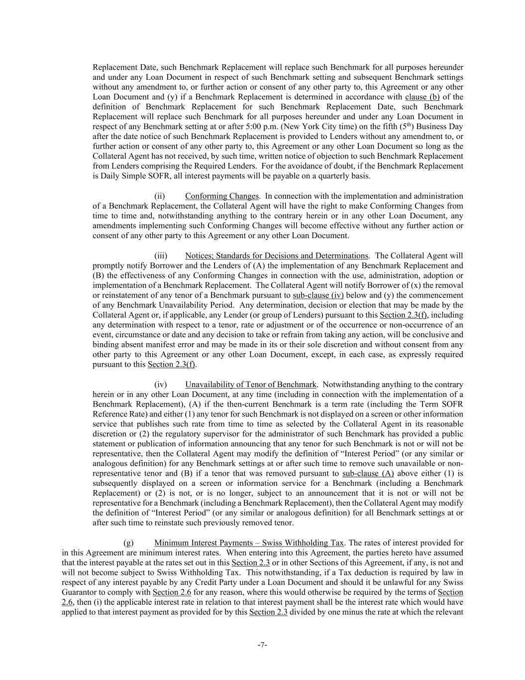 -7- Replacement Date, such Benchmark Replacement will replace such Benchmark for all purposes hereunder and under any Loan Document in respect of such Benchmark setting and subsequent Benchmark settings without any amendment to, or further action or consent of any other party to, this Agreement or any other Loan Document and (y) if a Benchmark Replacement is determined in accordance with clause (b) of the definition of Benchmark Replacement for such Benchmark Replacement Date, such Benchmark Replacement will replace such Benchmark for all purposes hereunder and under any Loan Document in respect of any Benchmark setting at or after 5:00 p.m. (New York City time) on the fifth (5th) Business Day after the date notice of such Benchmark Replacement is provided to Lenders without any amendment to, or further action or consent of any other party to, this Agreement or any other Loan Document so long as the Collateral Agent has not received, by such time, written notice of objection to such Benchmark Replacement from Lenders comprising the Required Lenders. For the avoidance of doubt, if the Benchmark Replacement is Daily Simple SOFR, all interest payments will be payable on a quarterly basis. (ii) Conforming Changes. In connection with the implementation and administration of a Benchmark Replacement, the Collateral Agent will have the right to make Conforming Changes from time to time and, notwithstanding anything to the contrary herein or in any other Loan Document, any amendments implementing such Conforming Changes will become effective without any further action or consent of any other party to this Agreement or any other Loan Document. (iii) Notices; Standards for Decisions and Determinations. The Collateral Agent will promptly notify Borrower and the Lenders of (A) the implementation of any Benchmark Replacement and (B) the effectiveness of any Conforming Changes in connection with the use, administration, adoption or implementation of a Benchmark Replacement. The Collateral Agent will notify Borrower of (x) the removal or reinstatement of any tenor of a Benchmark pursuant to sub-clause (iv) below and (y) the commencement of any Benchmark Unavailability Period. Any determination, decision or election that may be made by the Collateral Agent or, if applicable, any Lender (or group of Lenders) pursuant to this Section 2.3(f), including any determination with respect to a tenor, rate or adjustment or of the occurrence or non-occurrence of an event, circumstance or date and any decision to take or refrain from taking any action, will be conclusive and binding absent manifest error and may be made in its or their sole discretion and without consent from any other party to this Agreement or any other Loan Document, except, in each case, as expressly required pursuant to this Section 2.3(f). (iv) Unavailability of Tenor of Benchmark. Notwithstanding anything to the contrary herein or in any other Loan Document, at any time (including in connection with the implementation of a Benchmark Replacement), (A) if the then-current Benchmark is a term rate (including the Term SOFR Reference Rate) and either (1) any tenor for such Benchmark is not displayed on a screen or other information service that publishes such rate from time to time as selected by the Collateral Agent in its reasonable discretion or (2) the regulatory supervisor for the administrator of such Benchmark has provided a public statement or publication of information announcing that any tenor for such Benchmark is not or will not be representative, then the Collateral Agent may modify the definition of “Interest Period” (or any similar or analogous definition) for any Benchmark settings at or after such time to remove such unavailable or non- representative tenor and (B) if a tenor that was removed pursuant to sub-clause (A) above either (1) is subsequently displayed on a screen or information service for a Benchmark (including a Benchmark Replacement) or (2) is not, or is no longer, subject to an announcement that it is not or will not be representative for a Benchmark (including a Benchmark Replacement), then the Collateral Agent may modify the definition of “Interest Period” (or any similar or analogous definition) for all Benchmark settings at or after such time to reinstate such previously removed tenor. (g) Minimum Interest Payments – Swiss Withholding Tax. The rates of interest provided for in this Agreement are minimum interest rates. When entering into this Agreement, the parties hereto have assumed that the interest payable at the rates set out in this Section 2.3 or in other Sections of this Agreement, if any, is not and will not become subject to Swiss Withholding Tax. This notwithstanding, if a Tax deduction is required by law in respect of any interest payable by any Credit Party under a Loan Document and should it be unlawful for any Swiss Guarantor to comply with Section 2.6 for any reason, where this would otherwise be required by the terms of Section 2.6, then (i) the applicable interest rate in relation to that interest payment shall be the interest rate which would have applied to that interest payment as provided for by this Section 2.3 divided by one minus the rate at which the relevant