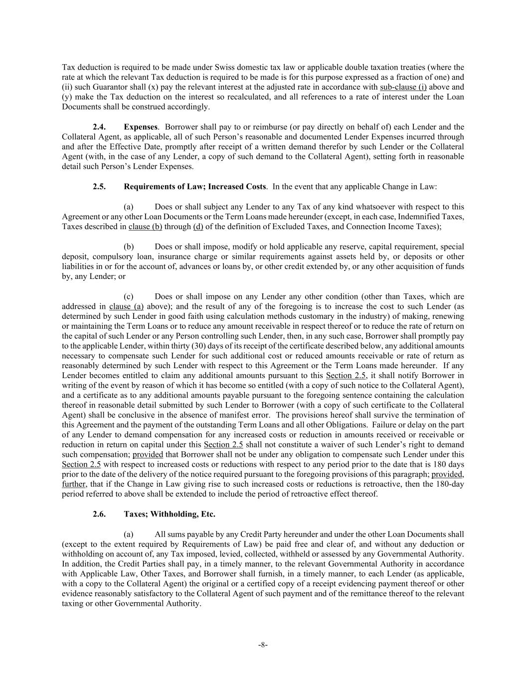 -8- Tax deduction is required to be made under Swiss domestic tax law or applicable double taxation treaties (where the rate at which the relevant Tax deduction is required to be made is for this purpose expressed as a fraction of one) and (ii) such Guarantor shall (x) pay the relevant interest at the adjusted rate in accordance with sub-clause (i) above and (y) make the Tax deduction on the interest so recalculated, and all references to a rate of interest under the Loan Documents shall be construed accordingly. 2.4. Expenses. Borrower shall pay to or reimburse (or pay directly on behalf of) each Lender and the Collateral Agent, as applicable, all of such Person’s reasonable and documented Lender Expenses incurred through and after the Effective Date, promptly after receipt of a written demand therefor by such Lender or the Collateral Agent (with, in the case of any Lender, a copy of such demand to the Collateral Agent), setting forth in reasonable detail such Person’s Lender Expenses. 2.5. Requirements of Law; Increased Costs. In the event that any applicable Change in Law: (a) Does or shall subject any Lender to any Tax of any kind whatsoever with respect to this Agreement or any other Loan Documents or the Term Loans made hereunder (except, in each case, Indemnified Taxes, Taxes described in clause (b) through (d) of the definition of Excluded Taxes, and Connection Income Taxes); (b) Does or shall impose, modify or hold applicable any reserve, capital requirement, special deposit, compulsory loan, insurance charge or similar requirements against assets held by, or deposits or other liabilities in or for the account of, advances or loans by, or other credit extended by, or any other acquisition of funds by, any Lender; or (c) Does or shall impose on any Lender any other condition (other than Taxes, which are addressed in clause (a) above); and the result of any of the foregoing is to increase the cost to such Lender (as determined by such Lender in good faith using calculation methods customary in the industry) of making, renewing or maintaining the Term Loans or to reduce any amount receivable in respect thereof or to reduce the rate of return on the capital of such Lender or any Person controlling such Lender, then, in any such case, Borrower shall promptly pay to the applicable Lender, within thirty (30) days of its receipt of the certificate described below, any additional amounts necessary to compensate such Lender for such additional cost or reduced amounts receivable or rate of return as reasonably determined by such Lender with respect to this Agreement or the Term Loans made hereunder. If any Lender becomes entitled to claim any additional amounts pursuant to this Section 2.5, it shall notify Borrower in writing of the event by reason of which it has become so entitled (with a copy of such notice to the Collateral Agent), and a certificate as to any additional amounts payable pursuant to the foregoing sentence containing the calculation thereof in reasonable detail submitted by such Lender to Borrower (with a copy of such certificate to the Collateral Agent) shall be conclusive in the absence of manifest error. The provisions hereof shall survive the termination of this Agreement and the payment of the outstanding Term Loans and all other Obligations. Failure or delay on the part of any Lender to demand compensation for any increased costs or reduction in amounts received or receivable or reduction in return on capital under this Section 2.5 shall not constitute a waiver of such Lender’s right to demand such compensation; provided that Borrower shall not be under any obligation to compensate such Lender under this Section 2.5 with respect to increased costs or reductions with respect to any period prior to the date that is 180 days prior to the date of the delivery of the notice required pursuant to the foregoing provisions of this paragraph; provided, further, that if the Change in Law giving rise to such increased costs or reductions is retroactive, then the 180-day period referred to above shall be extended to include the period of retroactive effect thereof. 2.6. Taxes; Withholding, Etc. (a) All sums payable by any Credit Party hereunder and under the other Loan Documents shall (except to the extent required by Requirements of Law) be paid free and clear of, and without any deduction or withholding on account of, any Tax imposed, levied, collected, withheld or assessed by any Governmental Authority. In addition, the Credit Parties shall pay, in a timely manner, to the relevant Governmental Authority in accordance with Applicable Law, Other Taxes, and Borrower shall furnish, in a timely manner, to each Lender (as applicable, with a copy to the Collateral Agent) the original or a certified copy of a receipt evidencing payment thereof or other evidence reasonably satisfactory to the Collateral Agent of such payment and of the remittance thereof to the relevant taxing or other Governmental Authority.