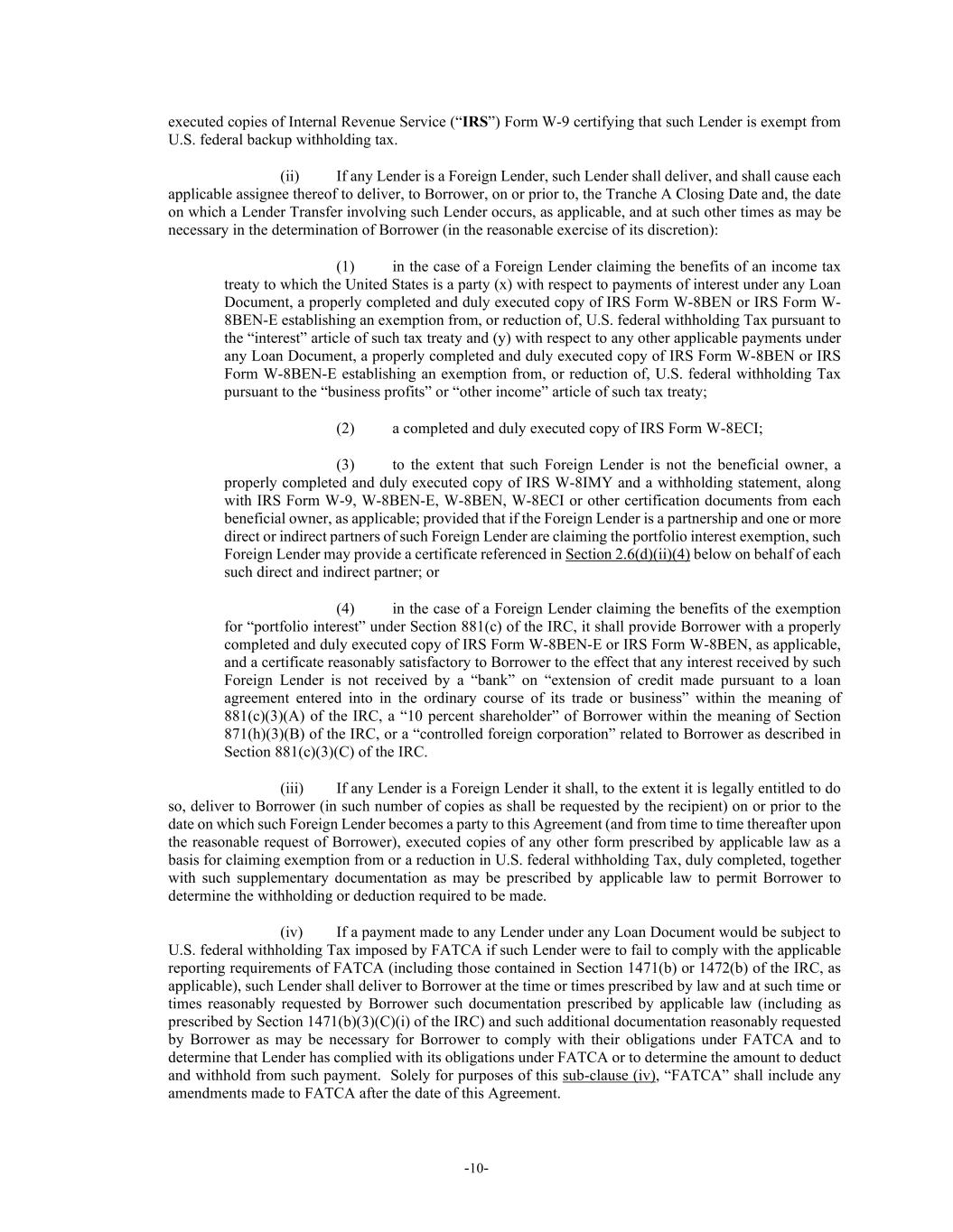 -10- executed copies of Internal Revenue Service (“IRS”) Form W-9 certifying that such Lender is exempt from U.S. federal backup withholding tax. (ii) If any Lender is a Foreign Lender, such Lender shall deliver, and shall cause each applicable assignee thereof to deliver, to Borrower, on or prior to, the Tranche A Closing Date and, the date on which a Lender Transfer involving such Lender occurs, as applicable, and at such other times as may be necessary in the determination of Borrower (in the reasonable exercise of its discretion): (1) in the case of a Foreign Lender claiming the benefits of an income tax treaty to which the United States is a party (x) with respect to payments of interest under any Loan Document, a properly completed and duly executed copy of IRS Form W-8BEN or IRS Form W- 8BEN-E establishing an exemption from, or reduction of, U.S. federal withholding Tax pursuant to the “interest” article of such tax treaty and (y) with respect to any other applicable payments under any Loan Document, a properly completed and duly executed copy of IRS Form W-8BEN or IRS Form W-8BEN-E establishing an exemption from, or reduction of, U.S. federal withholding Tax pursuant to the “business profits” or “other income” article of such tax treaty; (2) a completed and duly executed copy of IRS Form W-8ECI; (3) to the extent that such Foreign Lender is not the beneficial owner, a properly completed and duly executed copy of IRS W-8IMY and a withholding statement, along with IRS Form W-9, W-8BEN-E, W-8BEN, W-8ECI or other certification documents from each beneficial owner, as applicable; provided that if the Foreign Lender is a partnership and one or more direct or indirect partners of such Foreign Lender are claiming the portfolio interest exemption, such Foreign Lender may provide a certificate referenced in Section 2.6(d)(ii)(4) below on behalf of each such direct and indirect partner; or (4) in the case of a Foreign Lender claiming the benefits of the exemption for “portfolio interest” under Section 881(c) of the IRC, it shall provide Borrower with a properly completed and duly executed copy of IRS Form W-8BEN-E or IRS Form W-8BEN, as applicable, and a certificate reasonably satisfactory to Borrower to the effect that any interest received by such Foreign Lender is not received by a “bank” on “extension of credit made pursuant to a loan agreement entered into in the ordinary course of its trade or business” within the meaning of 881(c)(3)(A) of the IRC, a “10 percent shareholder” of Borrower within the meaning of Section 871(h)(3)(B) of the IRC, or a “controlled foreign corporation” related to Borrower as described in Section 881(c)(3)(C) of the IRC. (iii) If any Lender is a Foreign Lender it shall, to the extent it is legally entitled to do so, deliver to Borrower (in such number of copies as shall be requested by the recipient) on or prior to the date on which such Foreign Lender becomes a party to this Agreement (and from time to time thereafter upon the reasonable request of Borrower), executed copies of any other form prescribed by applicable law as a basis for claiming exemption from or a reduction in U.S. federal withholding Tax, duly completed, together with such supplementary documentation as may be prescribed by applicable law to permit Borrower to determine the withholding or deduction required to be made. (iv) If a payment made to any Lender under any Loan Document would be subject to U.S. federal withholding Tax imposed by FATCA if such Lender were to fail to comply with the applicable reporting requirements of FATCA (including those contained in Section 1471(b) or 1472(b) of the IRC, as applicable), such Lender shall deliver to Borrower at the time or times prescribed by law and at such time or times reasonably requested by Borrower such documentation prescribed by applicable law (including as prescribed by Section 1471(b)(3)(C)(i) of the IRC) and such additional documentation reasonably requested by Borrower as may be necessary for Borrower to comply with their obligations under FATCA and to determine that Lender has complied with its obligations under FATCA or to determine the amount to deduct and withhold from such payment. Solely for purposes of this sub-clause (iv), “FATCA” shall include any amendments made to FATCA after the date of this Agreement.
