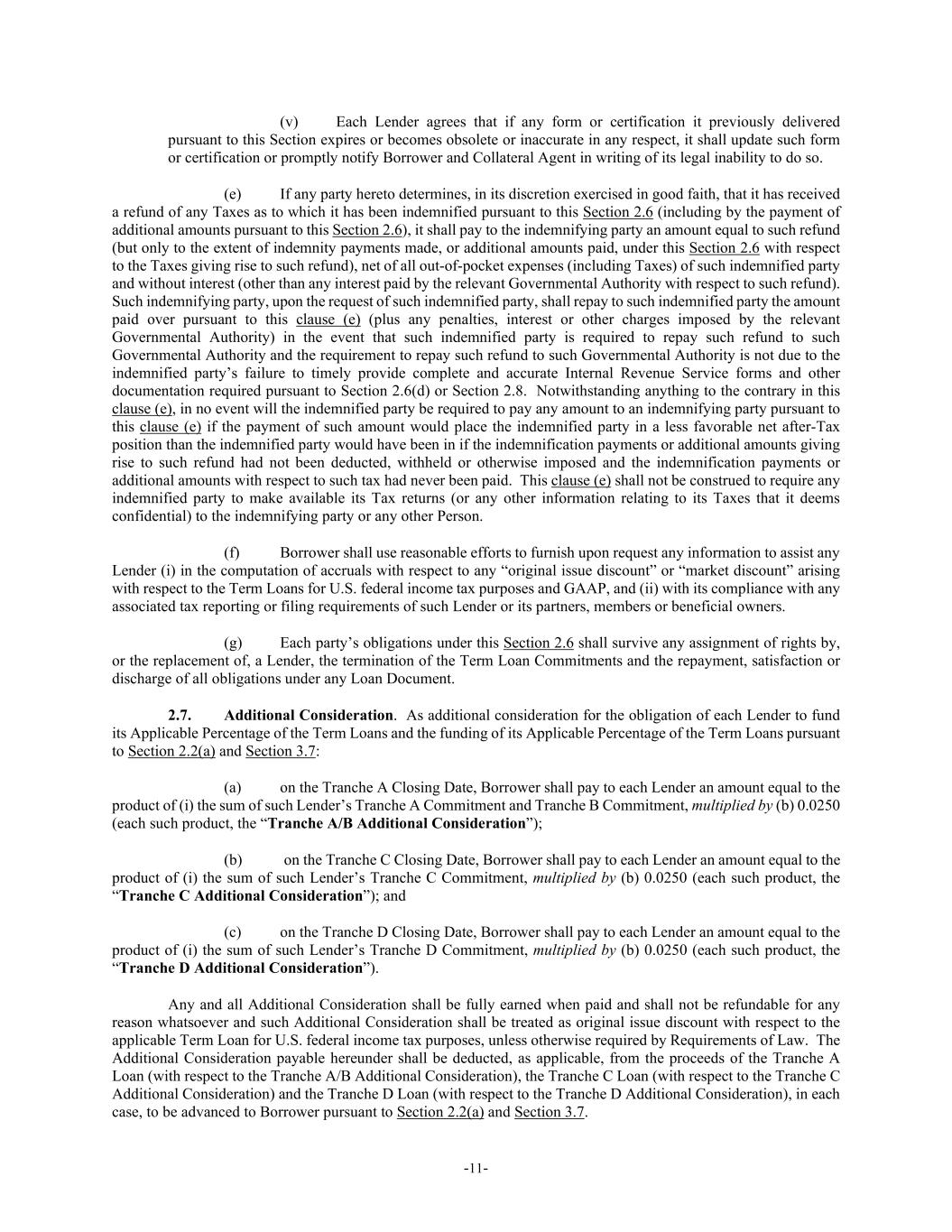 -11- (v) Each Lender agrees that if any form or certification it previously delivered pursuant to this Section expires or becomes obsolete or inaccurate in any respect, it shall update such form or certification or promptly notify Borrower and Collateral Agent in writing of its legal inability to do so. (e) If any party hereto determines, in its discretion exercised in good faith, that it has received a refund of any Taxes as to which it has been indemnified pursuant to this Section 2.6 (including by the payment of additional amounts pursuant to this Section 2.6), it shall pay to the indemnifying party an amount equal to such refund (but only to the extent of indemnity payments made, or additional amounts paid, under this Section 2.6 with respect to the Taxes giving rise to such refund), net of all out-of-pocket expenses (including Taxes) of such indemnified party and without interest (other than any interest paid by the relevant Governmental Authority with respect to such refund). Such indemnifying party, upon the request of such indemnified party, shall repay to such indemnified party the amount paid over pursuant to this clause (e) (plus any penalties, interest or other charges imposed by the relevant Governmental Authority) in the event that such indemnified party is required to repay such refund to such Governmental Authority and the requirement to repay such refund to such Governmental Authority is not due to the indemnified party’s failure to timely provide complete and accurate Internal Revenue Service forms and other documentation required pursuant to Section 2.6(d) or Section 2.8. Notwithstanding anything to the contrary in this clause (e), in no event will the indemnified party be required to pay any amount to an indemnifying party pursuant to this clause (e) if the payment of such amount would place the indemnified party in a less favorable net after-Tax position than the indemnified party would have been in if the indemnification payments or additional amounts giving rise to such refund had not been deducted, withheld or otherwise imposed and the indemnification payments or additional amounts with respect to such tax had never been paid. This clause (e) shall not be construed to require any indemnified party to make available its Tax returns (or any other information relating to its Taxes that it deems confidential) to the indemnifying party or any other Person. (f) Borrower shall use reasonable efforts to furnish upon request any information to assist any Lender (i) in the computation of accruals with respect to any “original issue discount” or “market discount” arising with respect to the Term Loans for U.S. federal income tax purposes and GAAP, and (ii) with its compliance with any associated tax reporting or filing requirements of such Lender or its partners, members or beneficial owners. (g) Each party’s obligations under this Section 2.6 shall survive any assignment of rights by, or the replacement of, a Lender, the termination of the Term Loan Commitments and the repayment, satisfaction or discharge of all obligations under any Loan Document. 2.7. Additional Consideration. As additional consideration for the obligation of each Lender to fund its Applicable Percentage of the Term Loans and the funding of its Applicable Percentage of the Term Loans pursuant to Section 2.2(a) and Section 3.7: (a) on the Tranche A Closing Date, Borrower shall pay to each Lender an amount equal to the product of (i) the sum of such Lender’s Tranche A Commitment and Tranche B Commitment, multiplied by (b) 0.0250 (each such product, the “Tranche A/B Additional Consideration”); (b) on the Tranche C Closing Date, Borrower shall pay to each Lender an amount equal to the product of (i) the sum of such Lender’s Tranche C Commitment, multiplied by (b) 0.0250 (each such product, the “Tranche C Additional Consideration”); and (c) on the Tranche D Closing Date, Borrower shall pay to each Lender an amount equal to the product of (i) the sum of such Lender’s Tranche D Commitment, multiplied by (b) 0.0250 (each such product, the “Tranche D Additional Consideration”). Any and all Additional Consideration shall be fully earned when paid and shall not be refundable for any reason whatsoever and such Additional Consideration shall be treated as original issue discount with respect to the applicable Term Loan for U.S. federal income tax purposes, unless otherwise required by Requirements of Law. The Additional Consideration payable hereunder shall be deducted, as applicable, from the proceeds of the Tranche A Loan (with respect to the Tranche A/B Additional Consideration), the Tranche C Loan (with respect to the Tranche C Additional Consideration) and the Tranche D Loan (with respect to the Tranche D Additional Consideration), in each case, to be advanced to Borrower pursuant to Section 2.2(a) and Section 3.7.