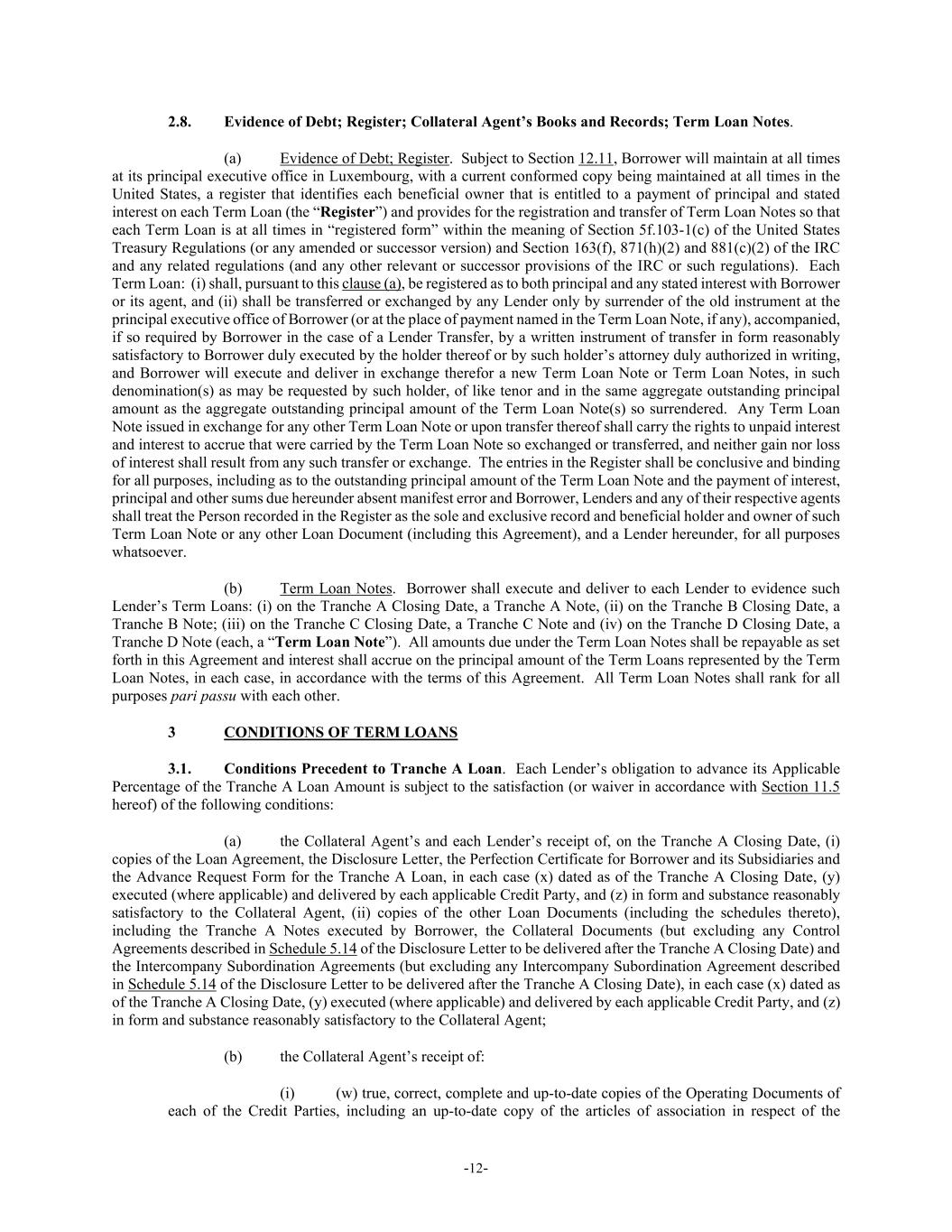 -12- 2.8. Evidence of Debt; Register; Collateral Agent’s Books and Records; Term Loan Notes. (a) Evidence of Debt; Register. Subject to Section 12.11, Borrower will maintain at all times at its principal executive office in Luxembourg, with a current conformed copy being maintained at all times in the United States, a register that identifies each beneficial owner that is entitled to a payment of principal and stated interest on each Term Loan (the “Register”) and provides for the registration and transfer of Term Loan Notes so that each Term Loan is at all times in “registered form” within the meaning of Section 5f.103-1(c) of the United States Treasury Regulations (or any amended or successor version) and Section 163(f), 871(h)(2) and 881(c)(2) of the IRC and any related regulations (and any other relevant or successor provisions of the IRC or such regulations). Each Term Loan: (i) shall, pursuant to this clause (a), be registered as to both principal and any stated interest with Borrower or its agent, and (ii) shall be transferred or exchanged by any Lender only by surrender of the old instrument at the principal executive office of Borrower (or at the place of payment named in the Term Loan Note, if any), accompanied, if so required by Borrower in the case of a Lender Transfer, by a written instrument of transfer in form reasonably satisfactory to Borrower duly executed by the holder thereof or by such holder’s attorney duly authorized in writing, and Borrower will execute and deliver in exchange therefor a new Term Loan Note or Term Loan Notes, in such denomination(s) as may be requested by such holder, of like tenor and in the same aggregate outstanding principal amount as the aggregate outstanding principal amount of the Term Loan Note(s) so surrendered. Any Term Loan Note issued in exchange for any other Term Loan Note or upon transfer thereof shall carry the rights to unpaid interest and interest to accrue that were carried by the Term Loan Note so exchanged or transferred, and neither gain nor loss of interest shall result from any such transfer or exchange. The entries in the Register shall be conclusive and binding for all purposes, including as to the outstanding principal amount of the Term Loan Note and the payment of interest, principal and other sums due hereunder absent manifest error and Borrower, Lenders and any of their respective agents shall treat the Person recorded in the Register as the sole and exclusive record and beneficial holder and owner of such Term Loan Note or any other Loan Document (including this Agreement), and a Lender hereunder, for all purposes whatsoever. (b) Term Loan Notes. Borrower shall execute and deliver to each Lender to evidence such Lender’s Term Loans: (i) on the Tranche A Closing Date, a Tranche A Note, (ii) on the Tranche B Closing Date, a Tranche B Note; (iii) on the Tranche C Closing Date, a Tranche C Note and (iv) on the Tranche D Closing Date, a Tranche D Note (each, a “Term Loan Note”). All amounts due under the Term Loan Notes shall be repayable as set forth in this Agreement and interest shall accrue on the principal amount of the Term Loans represented by the Term Loan Notes, in each case, in accordance with the terms of this Agreement. All Term Loan Notes shall rank for all purposes pari passu with each other. 3 CONDITIONS OF TERM LOANS 3.1. Conditions Precedent to Tranche A Loan. Each Lender’s obligation to advance its Applicable Percentage of the Tranche A Loan Amount is subject to the satisfaction (or waiver in accordance with Section 11.5 hereof) of the following conditions: (a) the Collateral Agent’s and each Lender’s receipt of, on the Tranche A Closing Date, (i) copies of the Loan Agreement, the Disclosure Letter, the Perfection Certificate for Borrower and its Subsidiaries and the Advance Request Form for the Tranche A Loan, in each case (x) dated as of the Tranche A Closing Date, (y) executed (where applicable) and delivered by each applicable Credit Party, and (z) in form and substance reasonably satisfactory to the Collateral Agent, (ii) copies of the other Loan Documents (including the schedules thereto), including the Tranche A Notes executed by Borrower, the Collateral Documents (but excluding any Control Agreements described in Schedule 5.14 of the Disclosure Letter to be delivered after the Tranche A Closing Date) and the Intercompany Subordination Agreements (but excluding any Intercompany Subordination Agreement described in Schedule 5.14 of the Disclosure Letter to be delivered after the Tranche A Closing Date), in each case (x) dated as of the Tranche A Closing Date, (y) executed (where applicable) and delivered by each applicable Credit Party, and (z) in form and substance reasonably satisfactory to the Collateral Agent; (b) the Collateral Agent’s receipt of: (i) (w) true, correct, complete and up-to-date copies of the Operating Documents of each of the Credit Parties, including an up-to-date copy of the articles of association in respect of the