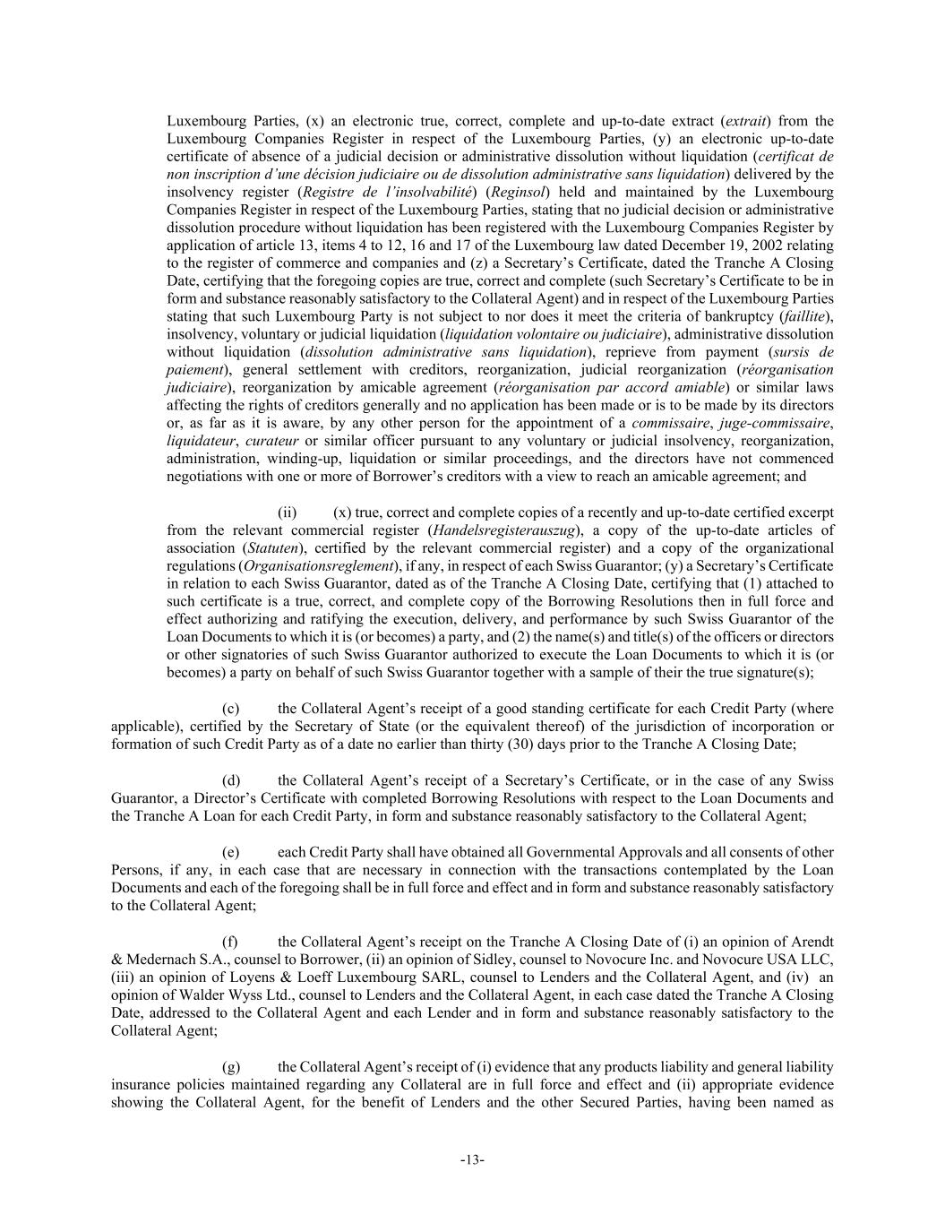 -13- Luxembourg Parties, (x) an electronic true, correct, complete and up-to-date extract (extrait) from the Luxembourg Companies Register in respect of the Luxembourg Parties, (y) an electronic up-to-date certificate of absence of a judicial decision or administrative dissolution without liquidation (certificat de non inscription d’une décision judiciaire ou de dissolution administrative sans liquidation) delivered by the insolvency register (Registre de l’insolvabilité) (Reginsol) held and maintained by the Luxembourg Companies Register in respect of the Luxembourg Parties, stating that no judicial decision or administrative dissolution procedure without liquidation has been registered with the Luxembourg Companies Register by application of article 13, items 4 to 12, 16 and 17 of the Luxembourg law dated December 19, 2002 relating to the register of commerce and companies and (z) a Secretary’s Certificate, dated the Tranche A Closing Date, certifying that the foregoing copies are true, correct and complete (such Secretary’s Certificate to be in form and substance reasonably satisfactory to the Collateral Agent) and in respect of the Luxembourg Parties stating that such Luxembourg Party is not subject to nor does it meet the criteria of bankruptcy (faillite), insolvency, voluntary or judicial liquidation (liquidation volontaire ou judiciaire), administrative dissolution without liquidation (dissolution administrative sans liquidation), reprieve from payment (sursis de paiement), general settlement with creditors, reorganization, judicial reorganization (réorganisation judiciaire), reorganization by amicable agreement (réorganisation par accord amiable) or similar laws affecting the rights of creditors generally and no application has been made or is to be made by its directors or, as far as it is aware, by any other person for the appointment of a commissaire, juge-commissaire, liquidateur, curateur or similar officer pursuant to any voluntary or judicial insolvency, reorganization, administration, winding-up, liquidation or similar proceedings, and the directors have not commenced negotiations with one or more of Borrower’s creditors with a view to reach an amicable agreement; and (ii) (x) true, correct and complete copies of a recently and up-to-date certified excerpt from the relevant commercial register (Handelsregisterauszug), a copy of the up-to-date articles of association (Statuten), certified by the relevant commercial register) and a copy of the organizational regulations (Organisationsreglement), if any, in respect of each Swiss Guarantor; (y) a Secretary’s Certificate in relation to each Swiss Guarantor, dated as of the Tranche A Closing Date, certifying that (1) attached to such certificate is a true, correct, and complete copy of the Borrowing Resolutions then in full force and effect authorizing and ratifying the execution, delivery, and performance by such Swiss Guarantor of the Loan Documents to which it is (or becomes) a party, and (2) the name(s) and title(s) of the officers or directors or other signatories of such Swiss Guarantor authorized to execute the Loan Documents to which it is (or becomes) a party on behalf of such Swiss Guarantor together with a sample of their the true signature(s); (c) the Collateral Agent’s receipt of a good standing certificate for each Credit Party (where applicable), certified by the Secretary of State (or the equivalent thereof) of the jurisdiction of incorporation or formation of such Credit Party as of a date no earlier than thirty (30) days prior to the Tranche A Closing Date; (d) the Collateral Agent’s receipt of a Secretary’s Certificate, or in the case of any Swiss Guarantor, a Director’s Certificate with completed Borrowing Resolutions with respect to the Loan Documents and the Tranche A Loan for each Credit Party, in form and substance reasonably satisfactory to the Collateral Agent; (e) each Credit Party shall have obtained all Governmental Approvals and all consents of other Persons, if any, in each case that are necessary in connection with the transactions contemplated by the Loan Documents and each of the foregoing shall be in full force and effect and in form and substance reasonably satisfactory to the Collateral Agent; (f) the Collateral Agent’s receipt on the Tranche A Closing Date of (i) an opinion of Arendt & Medernach S.A., counsel to Borrower, (ii) an opinion of Sidley, counsel to Novocure Inc. and Novocure USA LLC, (iii) an opinion of Loyens & Loeff Luxembourg SARL, counsel to Lenders and the Collateral Agent, and (iv) an opinion of Walder Wyss Ltd., counsel to Lenders and the Collateral Agent, in each case dated the Tranche A Closing Date, addressed to the Collateral Agent and each Lender and in form and substance reasonably satisfactory to the Collateral Agent; (g) the Collateral Agent’s receipt of (i) evidence that any products liability and general liability insurance policies maintained regarding any Collateral are in full force and effect and (ii) appropriate evidence showing the Collateral Agent, for the benefit of Lenders and the other Secured Parties, having been named as