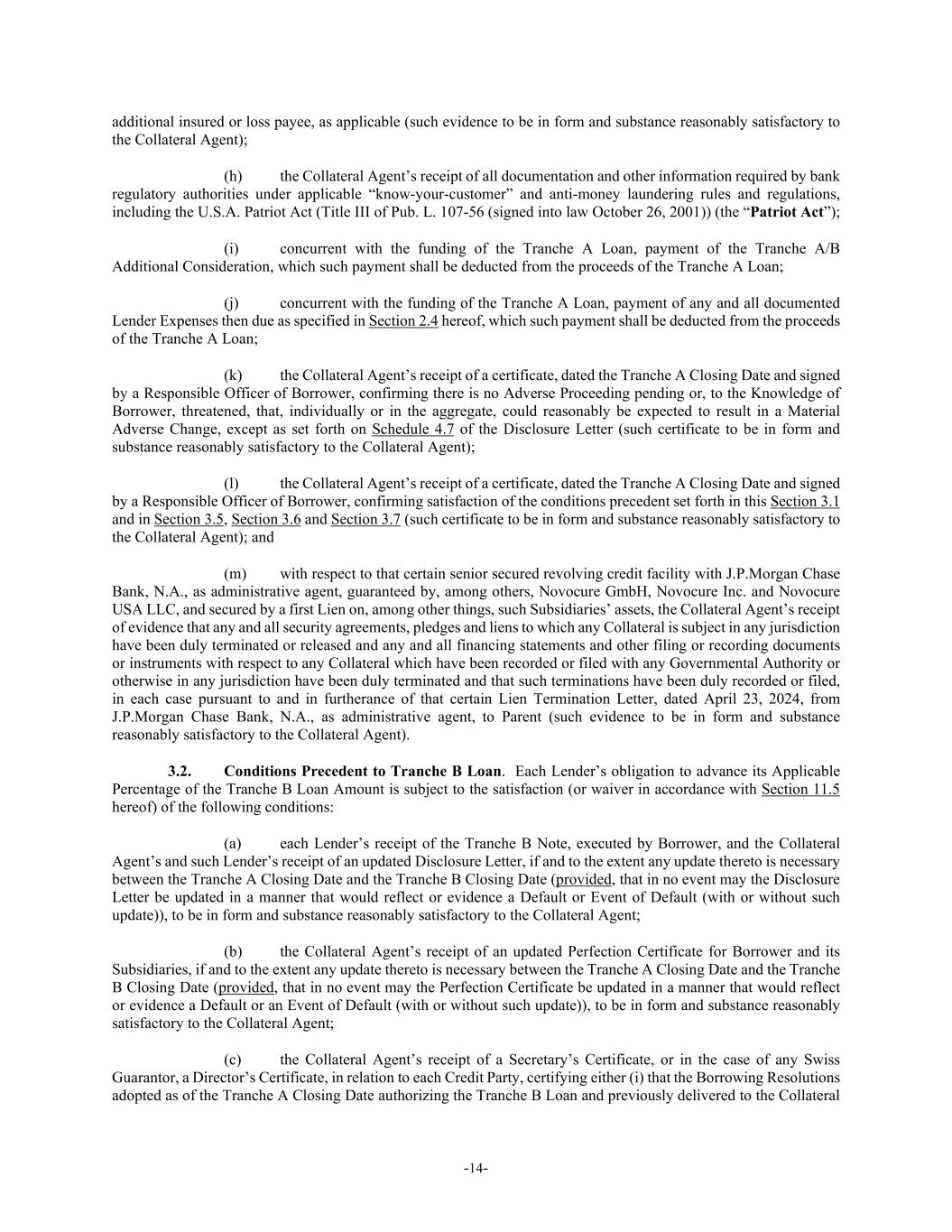 -14- additional insured or loss payee, as applicable (such evidence to be in form and substance reasonably satisfactory to the Collateral Agent); (h) the Collateral Agent’s receipt of all documentation and other information required by bank regulatory authorities under applicable “know-your-customer” and anti-money laundering rules and regulations, including the U.S.A. Patriot Act (Title III of Pub. L. 107-56 (signed into law October 26, 2001)) (the “Patriot Act”); (i) concurrent with the funding of the Tranche A Loan, payment of the Tranche A/B Additional Consideration, which such payment shall be deducted from the proceeds of the Tranche A Loan; (j) concurrent with the funding of the Tranche A Loan, payment of any and all documented Lender Expenses then due as specified in Section 2.4 hereof, which such payment shall be deducted from the proceeds of the Tranche A Loan; (k) the Collateral Agent’s receipt of a certificate, dated the Tranche A Closing Date and signed by a Responsible Officer of Borrower, confirming there is no Adverse Proceeding pending or, to the Knowledge of Borrower, threatened, that, individually or in the aggregate, could reasonably be expected to result in a Material Adverse Change, except as set forth on Schedule 4.7 of the Disclosure Letter (such certificate to be in form and substance reasonably satisfactory to the Collateral Agent); (l) the Collateral Agent’s receipt of a certificate, dated the Tranche A Closing Date and signed by a Responsible Officer of Borrower, confirming satisfaction of the conditions precedent set forth in this Section 3.1 and in Section 3.5, Section 3.6 and Section 3.7 (such certificate to be in form and substance reasonably satisfactory to the Collateral Agent); and (m) with respect to that certain senior secured revolving credit facility with J.P.Morgan Chase Bank, N.A., as administrative agent, guaranteed by, among others, Novocure GmbH, Novocure Inc. and Novocure USA LLC, and secured by a first Lien on, among other things, such Subsidiaries’ assets, the Collateral Agent’s receipt of evidence that any and all security agreements, pledges and liens to which any Collateral is subject in any jurisdiction have been duly terminated or released and any and all financing statements and other filing or recording documents or instruments with respect to any Collateral which have been recorded or filed with any Governmental Authority or otherwise in any jurisdiction have been duly terminated and that such terminations have been duly recorded or filed, in each case pursuant to and in furtherance of that certain Lien Termination Letter, dated April 23, 2024, from J.P.Morgan Chase Bank, N.A., as administrative agent, to Parent (such evidence to be in form and substance reasonably satisfactory to the Collateral Agent). 3.2. Conditions Precedent to Tranche B Loan. Each Lender’s obligation to advance its Applicable Percentage of the Tranche B Loan Amount is subject to the satisfaction (or waiver in accordance with Section 11.5 hereof) of the following conditions: (a) each Lender’s receipt of the Tranche B Note, executed by Borrower, and the Collateral Agent’s and such Lender’s receipt of an updated Disclosure Letter, if and to the extent any update thereto is necessary between the Tranche A Closing Date and the Tranche B Closing Date (provided, that in no event may the Disclosure Letter be updated in a manner that would reflect or evidence a Default or Event of Default (with or without such update)), to be in form and substance reasonably satisfactory to the Collateral Agent; (b) the Collateral Agent’s receipt of an updated Perfection Certificate for Borrower and its Subsidiaries, if and to the extent any update thereto is necessary between the Tranche A Closing Date and the Tranche B Closing Date (provided, that in no event may the Perfection Certificate be updated in a manner that would reflect or evidence a Default or an Event of Default (with or without such update)), to be in form and substance reasonably satisfactory to the Collateral Agent; (c) the Collateral Agent’s receipt of a Secretary’s Certificate, or in the case of any Swiss Guarantor, a Director’s Certificate, in relation to each Credit Party, certifying either (i) that the Borrowing Resolutions adopted as of the Tranche A Closing Date authorizing the Tranche B Loan and previously delivered to the Collateral
