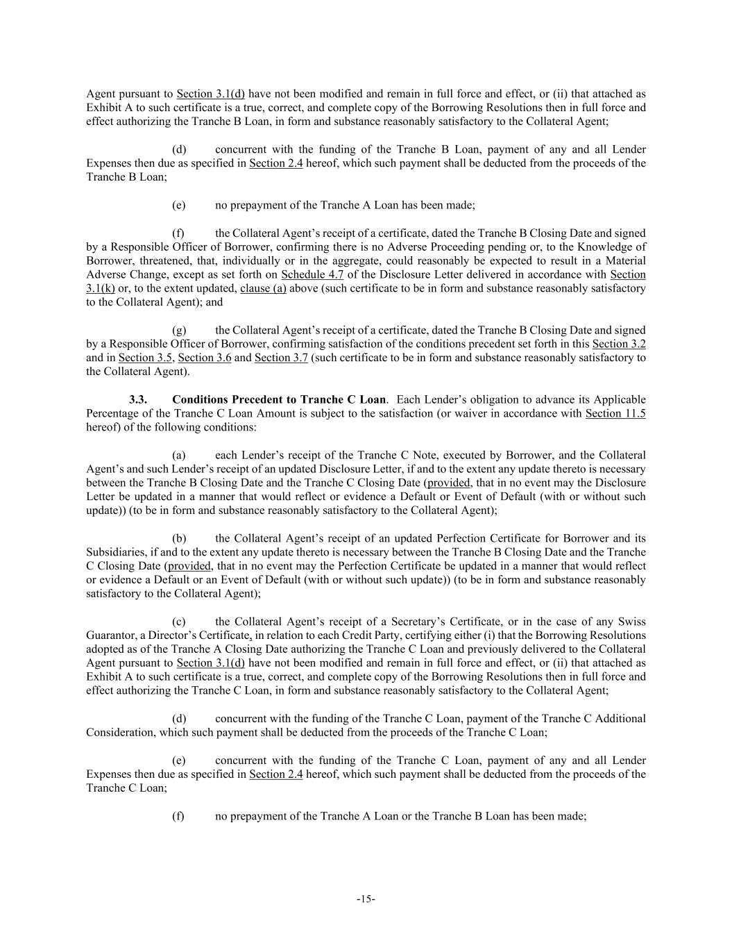 -15- Agent pursuant to Section 3.1(d) have not been modified and remain in full force and effect, or (ii) that attached as Exhibit A to such certificate is a true, correct, and complete copy of the Borrowing Resolutions then in full force and effect authorizing the Tranche B Loan, in form and substance reasonably satisfactory to the Collateral Agent; (d) concurrent with the funding of the Tranche B Loan, payment of any and all Lender Expenses then due as specified in Section 2.4 hereof, which such payment shall be deducted from the proceeds of the Tranche B Loan; (e) no prepayment of the Tranche A Loan has been made; (f) the Collateral Agent’s receipt of a certificate, dated the Tranche B Closing Date and signed by a Responsible Officer of Borrower, confirming there is no Adverse Proceeding pending or, to the Knowledge of Borrower, threatened, that, individually or in the aggregate, could reasonably be expected to result in a Material Adverse Change, except as set forth on Schedule 4.7 of the Disclosure Letter delivered in accordance with Section 3.1(k) or, to the extent updated, clause (a) above (such certificate to be in form and substance reasonably satisfactory to the Collateral Agent); and (g) the Collateral Agent’s receipt of a certificate, dated the Tranche B Closing Date and signed by a Responsible Officer of Borrower, confirming satisfaction of the conditions precedent set forth in this Section 3.2 and in Section 3.5, Section 3.6 and Section 3.7 (such certificate to be in form and substance reasonably satisfactory to the Collateral Agent). 3.3. Conditions Precedent to Tranche C Loan. Each Lender’s obligation to advance its Applicable Percentage of the Tranche C Loan Amount is subject to the satisfaction (or waiver in accordance with Section 11.5 hereof) of the following conditions: (a) each Lender’s receipt of the Tranche C Note, executed by Borrower, and the Collateral Agent’s and such Lender’s receipt of an updated Disclosure Letter, if and to the extent any update thereto is necessary between the Tranche B Closing Date and the Tranche C Closing Date (provided, that in no event may the Disclosure Letter be updated in a manner that would reflect or evidence a Default or Event of Default (with or without such update)) (to be in form and substance reasonably satisfactory to the Collateral Agent); (b) the Collateral Agent’s receipt of an updated Perfection Certificate for Borrower and its Subsidiaries, if and to the extent any update thereto is necessary between the Tranche B Closing Date and the Tranche C Closing Date (provided, that in no event may the Perfection Certificate be updated in a manner that would reflect or evidence a Default or an Event of Default (with or without such update)) (to be in form and substance reasonably satisfactory to the Collateral Agent); (c) the Collateral Agent’s receipt of a Secretary’s Certificate, or in the case of any Swiss Guarantor, a Director’s Certificate, in relation to each Credit Party, certifying either (i) that the Borrowing Resolutions adopted as of the Tranche A Closing Date authorizing the Tranche C Loan and previously delivered to the Collateral Agent pursuant to Section 3.1(d) have not been modified and remain in full force and effect, or (ii) that attached as Exhibit A to such certificate is a true, correct, and complete copy of the Borrowing Resolutions then in full force and effect authorizing the Tranche C Loan, in form and substance reasonably satisfactory to the Collateral Agent; (d) concurrent with the funding of the Tranche C Loan, payment of the Tranche C Additional Consideration, which such payment shall be deducted from the proceeds of the Tranche C Loan; (e) concurrent with the funding of the Tranche C Loan, payment of any and all Lender Expenses then due as specified in Section 2.4 hereof, which such payment shall be deducted from the proceeds of the Tranche C Loan; (f) no prepayment of the Tranche A Loan or the Tranche B Loan has been made;