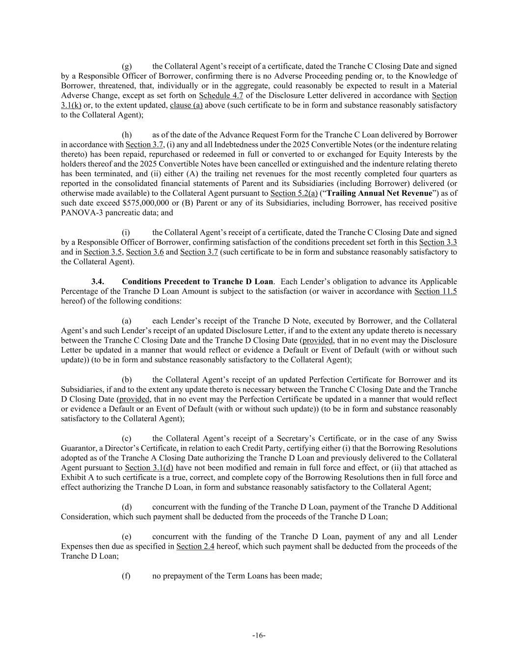 -16- (g) the Collateral Agent’s receipt of a certificate, dated the Tranche C Closing Date and signed by a Responsible Officer of Borrower, confirming there is no Adverse Proceeding pending or, to the Knowledge of Borrower, threatened, that, individually or in the aggregate, could reasonably be expected to result in a Material Adverse Change, except as set forth on Schedule 4.7 of the Disclosure Letter delivered in accordance with Section 3.1(k) or, to the extent updated, clause (a) above (such certificate to be in form and substance reasonably satisfactory to the Collateral Agent); (h) as of the date of the Advance Request Form for the Tranche C Loan delivered by Borrower in accordance with Section 3.7, (i) any and all Indebtedness under the 2025 Convertible Notes (or the indenture relating thereto) has been repaid, repurchased or redeemed in full or converted to or exchanged for Equity Interests by the holders thereof and the 2025 Convertible Notes have been cancelled or extinguished and the indenture relating thereto has been terminated, and (ii) either (A) the trailing net revenues for the most recently completed four quarters as reported in the consolidated financial statements of Parent and its Subsidiaries (including Borrower) delivered (or otherwise made available) to the Collateral Agent pursuant to Section 5.2(a) (“Trailing Annual Net Revenue”) as of such date exceed $575,000,000 or (B) Parent or any of its Subsidiaries, including Borrower, has received positive PANOVA-3 pancreatic data; and (i) the Collateral Agent’s receipt of a certificate, dated the Tranche C Closing Date and signed by a Responsible Officer of Borrower, confirming satisfaction of the conditions precedent set forth in this Section 3.3 and in Section 3.5, Section 3.6 and Section 3.7 (such certificate to be in form and substance reasonably satisfactory to the Collateral Agent). 3.4. Conditions Precedent to Tranche D Loan. Each Lender’s obligation to advance its Applicable Percentage of the Tranche D Loan Amount is subject to the satisfaction (or waiver in accordance with Section 11.5 hereof) of the following conditions: (a) each Lender’s receipt of the Tranche D Note, executed by Borrower, and the Collateral Agent’s and such Lender’s receipt of an updated Disclosure Letter, if and to the extent any update thereto is necessary between the Tranche C Closing Date and the Tranche D Closing Date (provided, that in no event may the Disclosure Letter be updated in a manner that would reflect or evidence a Default or Event of Default (with or without such update)) (to be in form and substance reasonably satisfactory to the Collateral Agent); (b) the Collateral Agent’s receipt of an updated Perfection Certificate for Borrower and its Subsidiaries, if and to the extent any update thereto is necessary between the Tranche C Closing Date and the Tranche D Closing Date (provided, that in no event may the Perfection Certificate be updated in a manner that would reflect or evidence a Default or an Event of Default (with or without such update)) (to be in form and substance reasonably satisfactory to the Collateral Agent); (c) the Collateral Agent’s receipt of a Secretary’s Certificate, or in the case of any Swiss Guarantor, a Director’s Certificate, in relation to each Credit Party, certifying either (i) that the Borrowing Resolutions adopted as of the Tranche A Closing Date authorizing the Tranche D Loan and previously delivered to the Collateral Agent pursuant to Section 3.1(d) have not been modified and remain in full force and effect, or (ii) that attached as Exhibit A to such certificate is a true, correct, and complete copy of the Borrowing Resolutions then in full force and effect authorizing the Tranche D Loan, in form and substance reasonably satisfactory to the Collateral Agent; (d) concurrent with the funding of the Tranche D Loan, payment of the Tranche D Additional Consideration, which such payment shall be deducted from the proceeds of the Tranche D Loan; (e) concurrent with the funding of the Tranche D Loan, payment of any and all Lender Expenses then due as specified in Section 2.4 hereof, which such payment shall be deducted from the proceeds of the Tranche D Loan; (f) no prepayment of the Term Loans has been made;