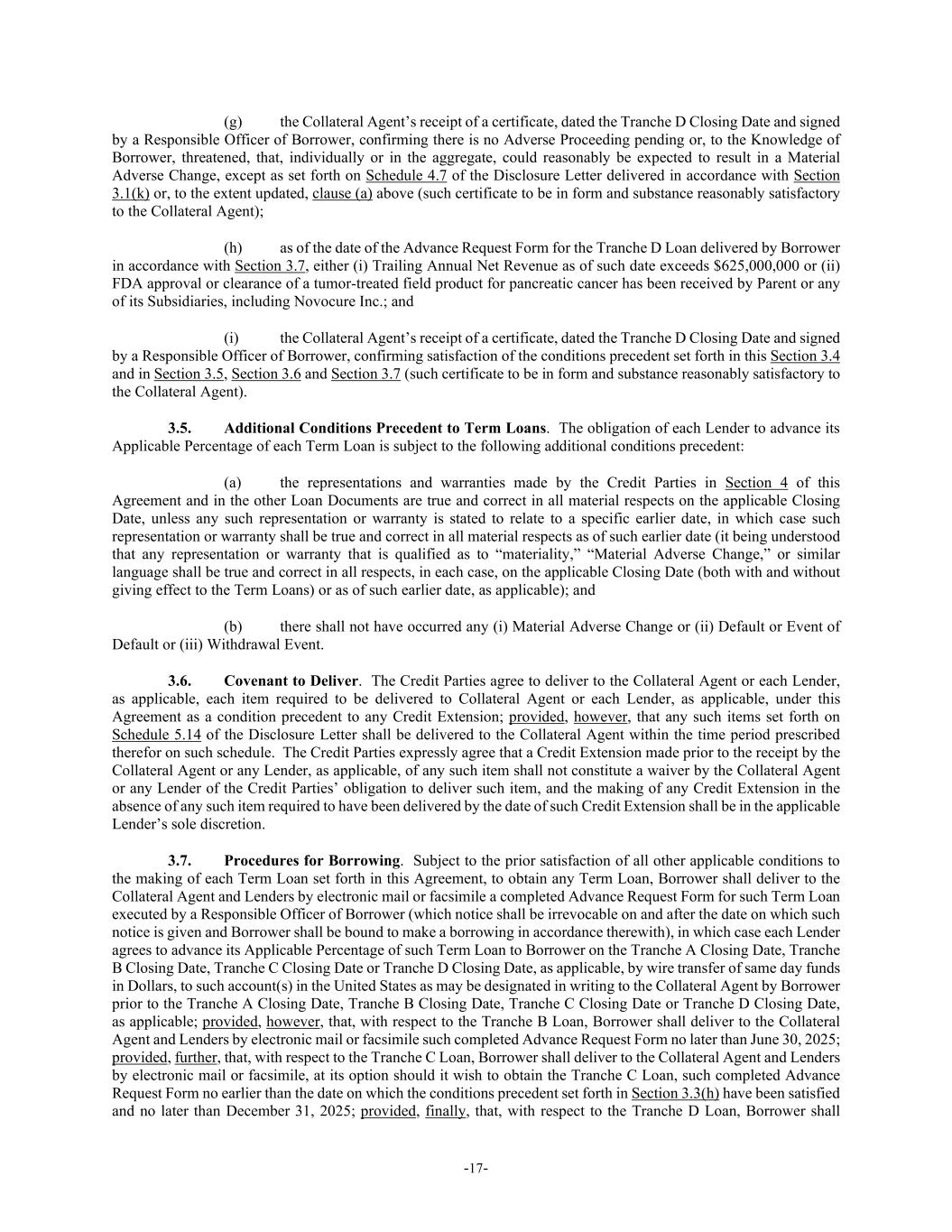 -17- (g) the Collateral Agent’s receipt of a certificate, dated the Tranche D Closing Date and signed by a Responsible Officer of Borrower, confirming there is no Adverse Proceeding pending or, to the Knowledge of Borrower, threatened, that, individually or in the aggregate, could reasonably be expected to result in a Material Adverse Change, except as set forth on Schedule 4.7 of the Disclosure Letter delivered in accordance with Section 3.1(k) or, to the extent updated, clause (a) above (such certificate to be in form and substance reasonably satisfactory to the Collateral Agent); (h) as of the date of the Advance Request Form for the Tranche D Loan delivered by Borrower in accordance with Section 3.7, either (i) Trailing Annual Net Revenue as of such date exceeds $625,000,000 or (ii) FDA approval or clearance of a tumor-treated field product for pancreatic cancer has been received by Parent or any of its Subsidiaries, including Novocure Inc.; and (i) the Collateral Agent’s receipt of a certificate, dated the Tranche D Closing Date and signed by a Responsible Officer of Borrower, confirming satisfaction of the conditions precedent set forth in this Section 3.4 and in Section 3.5, Section 3.6 and Section 3.7 (such certificate to be in form and substance reasonably satisfactory to the Collateral Agent). 3.5. Additional Conditions Precedent to Term Loans. The obligation of each Lender to advance its Applicable Percentage of each Term Loan is subject to the following additional conditions precedent: (a) the representations and warranties made by the Credit Parties in Section 4 of this Agreement and in the other Loan Documents are true and correct in all material respects on the applicable Closing Date, unless any such representation or warranty is stated to relate to a specific earlier date, in which case such representation or warranty shall be true and correct in all material respects as of such earlier date (it being understood that any representation or warranty that is qualified as to “materiality,” “Material Adverse Change,” or similar language shall be true and correct in all respects, in each case, on the applicable Closing Date (both with and without giving effect to the Term Loans) or as of such earlier date, as applicable); and (b) there shall not have occurred any (i) Material Adverse Change or (ii) Default or Event of Default or (iii) Withdrawal Event. 3.6. Covenant to Deliver. The Credit Parties agree to deliver to the Collateral Agent or each Lender, as applicable, each item required to be delivered to Collateral Agent or each Lender, as applicable, under this Agreement as a condition precedent to any Credit Extension; provided, however, that any such items set forth on Schedule 5.14 of the Disclosure Letter shall be delivered to the Collateral Agent within the time period prescribed therefor on such schedule. The Credit Parties expressly agree that a Credit Extension made prior to the receipt by the Collateral Agent or any Lender, as applicable, of any such item shall not constitute a waiver by the Collateral Agent or any Lender of the Credit Parties’ obligation to deliver such item, and the making of any Credit Extension in the absence of any such item required to have been delivered by the date of such Credit Extension shall be in the applicable Lender’s sole discretion. 3.7. Procedures for Borrowing. Subject to the prior satisfaction of all other applicable conditions to the making of each Term Loan set forth in this Agreement, to obtain any Term Loan, Borrower shall deliver to the Collateral Agent and Lenders by electronic mail or facsimile a completed Advance Request Form for such Term Loan executed by a Responsible Officer of Borrower (which notice shall be irrevocable on and after the date on which such notice is given and Borrower shall be bound to make a borrowing in accordance therewith), in which case each Lender agrees to advance its Applicable Percentage of such Term Loan to Borrower on the Tranche A Closing Date, Tranche B Closing Date, Tranche C Closing Date or Tranche D Closing Date, as applicable, by wire transfer of same day funds in Dollars, to such account(s) in the United States as may be designated in writing to the Collateral Agent by Borrower prior to the Tranche A Closing Date, Tranche B Closing Date, Tranche C Closing Date or Tranche D Closing Date, as applicable; provided, however, that, with respect to the Tranche B Loan, Borrower shall deliver to the Collateral Agent and Lenders by electronic mail or facsimile such completed Advance Request Form no later than June 30, 2025; provided, further, that, with respect to the Tranche C Loan, Borrower shall deliver to the Collateral Agent and Lenders by electronic mail or facsimile, at its option should it wish to obtain the Tranche C Loan, such completed Advance Request Form no earlier than the date on which the conditions precedent set forth in Section 3.3(h) have been satisfied and no later than December 31, 2025; provided, finally, that, with respect to the Tranche D Loan, Borrower shall