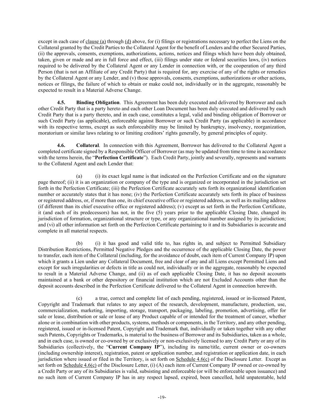 -19- except in each case of clause (a) through (d) above, for (i) filings or registrations necessary to perfect the Liens on the Collateral granted by the Credit Parties to the Collateral Agent for the benefit of Lenders and the other Secured Parties, (ii) the approvals, consents, exemptions, authorizations, actions, notices and filings which have been duly obtained, taken, given or made and are in full force and effect, (iii) filings under state or federal securities laws, (iv) notices required to be delivered by the Collateral Agent or any Lender in connection with, or the cooperation of any third Person (that is not an Affiliate of any Credit Party) that is required for, any exercise of any of the rights or remedies by the Collateral Agent or any Lender, and (v) those approvals, consents, exemptions, authorizations or other actions, notices or filings, the failure of which to obtain or make could not, individually or in the aggregate, reasonably be expected to result in a Material Adverse Change. 4.5. Binding Obligation. This Agreement has been duly executed and delivered by Borrower and each other Credit Party that is a party hereto and each other Loan Document has been duly executed and delivered by each Credit Party that is a party thereto, and in each case, constitutes a legal, valid and binding obligation of Borrower or such Credit Party (as applicable), enforceable against Borrower or such Credit Party (as applicable) in accordance with its respective terms, except as such enforceability may be limited by bankruptcy, insolvency, reorganization, moratorium or similar laws relating to or limiting creditors’ rights generally, by general principles of equity. 4.6. Collateral. In connection with this Agreement, Borrower has delivered to the Collateral Agent a completed certificate signed by a Responsible Officer of Borrower (as may be updated from time to time in accordance with the terms herein, the “Perfection Certificate”). Each Credit Party, jointly and severally, represents and warrants to the Collateral Agent and each Lender that: (a) (i) its exact legal name is that indicated on the Perfection Certificate and on the signature page thereof; (ii) it is an organization or company of the type and is organized or incorporated in the jurisdiction set forth in the Perfection Certificate; (iii) the Perfection Certificate accurately sets forth its organizational identification number or accurately states that it has none; (iv) the Perfection Certificate accurately sets forth its place of business or registered address, or, if more than one, its chief executive office or registered address, as well as its mailing address (if different than its chief executive office or registered address); (v) except as set forth in the Perfection Certificate, it (and each of its predecessors) has not, in the five (5) years prior to the applicable Closing Date, changed its jurisdiction of formation, organizational structure or type, or any organizational number assigned by its jurisdiction; and (vi) all other information set forth on the Perfection Certificate pertaining to it and its Subsidiaries is accurate and complete in all material respects. (b) (i) it has good and valid title to, has rights in, and subject to Permitted Subsidiary Distribution Restrictions, Permitted Negative Pledges and the occurrence of the applicable Closing Date, the power to transfer, each item of the Collateral (including, for the avoidance of doubt, each item of Current Company IP) upon which it grants a Lien under any Collateral Document, free and clear of any and all Liens except Permitted Liens and except for such irregularities or defects in title as could not, individually or in the aggregate, reasonably be expected to result in a Material Adverse Change, and (ii) as of each applicable Closing Date, it has no deposit accounts maintained at a bank or other depository or financial institution which are not Excluded Accounts other than the deposit accounts described in the Perfection Certificate delivered to the Collateral Agent in connection herewith. (c) a true, correct and complete list of each pending, registered, issued or in-licensed Patent, Copyright and Trademark that relates to any aspect of the research, development, manufacture, production, use, commercialization, marketing, importing, storage, transport, packaging, labeling, promotion, advertising, offer for sale or lease, distribution or sale or lease of any Product capable of or intended for the treatment of cancer, whether alone or in combination with other products, systems, methods or components, in the Territory, and any other pending, registered, issued or in-licensed Patent, Copyright and Trademark that, individually or taken together with any other such Patents, Copyrights or Trademarks, is material to the business of Borrower and its Subsidiaries, taken as a whole, and in each case, is owned or co-owned by or exclusively or non-exclusively licensed to any Credit Party or any of its Subsidiaries (collectively, the “Current Company IP”), including its name/title, current owner or co-owners (including ownership interest), registration, patent or application number, and registration or application date, in each jurisdiction where issued or filed in the Territory, is set forth on Schedule 4.6(c) of the Disclosure Letter. Except as set forth on Schedule 4.6(c) of the Disclosure Letter, (i) (A) each item of Current Company IP owned or co-owned by a Credit Party or any of its Subsidiaries is valid, subsisting and enforceable (or will be enforceable upon issuance) and no such item of Current Company IP has in any respect lapsed, expired, been cancelled, held unpatentable, held