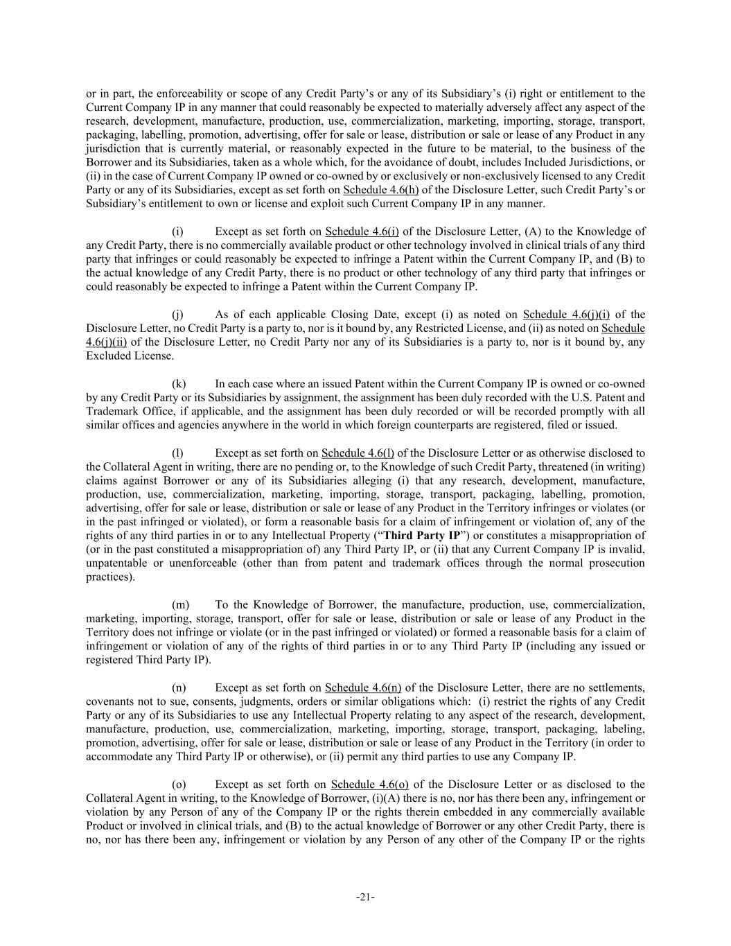 -21- or in part, the enforceability or scope of any Credit Party’s or any of its Subsidiary’s (i) right or entitlement to the Current Company IP in any manner that could reasonably be expected to materially adversely affect any aspect of the research, development, manufacture, production, use, commercialization, marketing, importing, storage, transport, packaging, labelling, promotion, advertising, offer for sale or lease, distribution or sale or lease of any Product in any jurisdiction that is currently material, or reasonably expected in the future to be material, to the business of the Borrower and its Subsidiaries, taken as a whole which, for the avoidance of doubt, includes Included Jurisdictions, or (ii) in the case of Current Company IP owned or co-owned by or exclusively or non-exclusively licensed to any Credit Party or any of its Subsidiaries, except as set forth on Schedule 4.6(h) of the Disclosure Letter, such Credit Party’s or Subsidiary’s entitlement to own or license and exploit such Current Company IP in any manner. (i) Except as set forth on Schedule 4.6(i) of the Disclosure Letter, (A) to the Knowledge of any Credit Party, there is no commercially available product or other technology involved in clinical trials of any third party that infringes or could reasonably be expected to infringe a Patent within the Current Company IP, and (B) to the actual knowledge of any Credit Party, there is no product or other technology of any third party that infringes or could reasonably be expected to infringe a Patent within the Current Company IP. (j) As of each applicable Closing Date, except (i) as noted on Schedule 4.6(j)(i) of the Disclosure Letter, no Credit Party is a party to, nor is it bound by, any Restricted License, and (ii) as noted on Schedule 4.6(j)(ii) of the Disclosure Letter, no Credit Party nor any of its Subsidiaries is a party to, nor is it bound by, any Excluded License. (k) In each case where an issued Patent within the Current Company IP is owned or co-owned by any Credit Party or its Subsidiaries by assignment, the assignment has been duly recorded with the U.S. Patent and Trademark Office, if applicable, and the assignment has been duly recorded or will be recorded promptly with all similar offices and agencies anywhere in the world in which foreign counterparts are registered, filed or issued. (l) Except as set forth on Schedule 4.6(l) of the Disclosure Letter or as otherwise disclosed to the Collateral Agent in writing, there are no pending or, to the Knowledge of such Credit Party, threatened (in writing) claims against Borrower or any of its Subsidiaries alleging (i) that any research, development, manufacture, production, use, commercialization, marketing, importing, storage, transport, packaging, labelling, promotion, advertising, offer for sale or lease, distribution or sale or lease of any Product in the Territory infringes or violates (or in the past infringed or violated), or form a reasonable basis for a claim of infringement or violation of, any of the rights of any third parties in or to any Intellectual Property (“Third Party IP”) or constitutes a misappropriation of (or in the past constituted a misappropriation of) any Third Party IP, or (ii) that any Current Company IP is invalid, unpatentable or unenforceable (other than from patent and trademark offices through the normal prosecution practices). (m) To the Knowledge of Borrower, the manufacture, production, use, commercialization, marketing, importing, storage, transport, offer for sale or lease, distribution or sale or lease of any Product in the Territory does not infringe or violate (or in the past infringed or violated) or formed a reasonable basis for a claim of infringement or violation of any of the rights of third parties in or to any Third Party IP (including any issued or registered Third Party IP). (n) Except as set forth on Schedule 4.6(n) of the Disclosure Letter, there are no settlements, covenants not to sue, consents, judgments, orders or similar obligations which: (i) restrict the rights of any Credit Party or any of its Subsidiaries to use any Intellectual Property relating to any aspect of the research, development, manufacture, production, use, commercialization, marketing, importing, storage, transport, packaging, labeling, promotion, advertising, offer for sale or lease, distribution or sale or lease of any Product in the Territory (in order to accommodate any Third Party IP or otherwise), or (ii) permit any third parties to use any Company IP. (o) Except as set forth on Schedule 4.6(o) of the Disclosure Letter or as disclosed to the Collateral Agent in writing, to the Knowledge of Borrower, (i)(A) there is no, nor has there been any, infringement or violation by any Person of any of the Company IP or the rights therein embedded in any commercially available Product or involved in clinical trials, and (B) to the actual knowledge of Borrower or any other Credit Party, there is no, nor has there been any, infringement or violation by any Person of any other of the Company IP or the rights