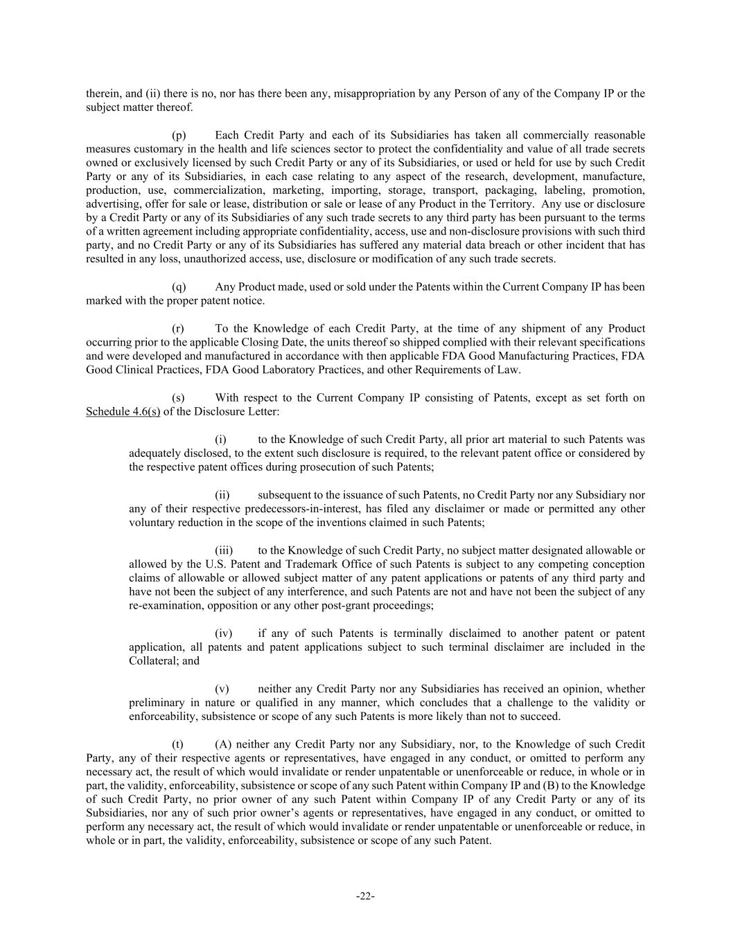 -22- therein, and (ii) there is no, nor has there been any, misappropriation by any Person of any of the Company IP or the subject matter thereof. (p) Each Credit Party and each of its Subsidiaries has taken all commercially reasonable measures customary in the health and life sciences sector to protect the confidentiality and value of all trade secrets owned or exclusively licensed by such Credit Party or any of its Subsidiaries, or used or held for use by such Credit Party or any of its Subsidiaries, in each case relating to any aspect of the research, development, manufacture, production, use, commercialization, marketing, importing, storage, transport, packaging, labeling, promotion, advertising, offer for sale or lease, distribution or sale or lease of any Product in the Territory. Any use or disclosure by a Credit Party or any of its Subsidiaries of any such trade secrets to any third party has been pursuant to the terms of a written agreement including appropriate confidentiality, access, use and non-disclosure provisions with such third party, and no Credit Party or any of its Subsidiaries has suffered any material data breach or other incident that has resulted in any loss, unauthorized access, use, disclosure or modification of any such trade secrets. (q) Any Product made, used or sold under the Patents within the Current Company IP has been marked with the proper patent notice. (r) To the Knowledge of each Credit Party, at the time of any shipment of any Product occurring prior to the applicable Closing Date, the units thereof so shipped complied with their relevant specifications and were developed and manufactured in accordance with then applicable FDA Good Manufacturing Practices, FDA Good Clinical Practices, FDA Good Laboratory Practices, and other Requirements of Law. (s) With respect to the Current Company IP consisting of Patents, except as set forth on Schedule 4.6(s) of the Disclosure Letter: (i) to the Knowledge of such Credit Party, all prior art material to such Patents was adequately disclosed, to the extent such disclosure is required, to the relevant patent office or considered by the respective patent offices during prosecution of such Patents; (ii) subsequent to the issuance of such Patents, no Credit Party nor any Subsidiary nor any of their respective predecessors-in-interest, has filed any disclaimer or made or permitted any other voluntary reduction in the scope of the inventions claimed in such Patents; (iii) to the Knowledge of such Credit Party, no subject matter designated allowable or allowed by the U.S. Patent and Trademark Office of such Patents is subject to any competing conception claims of allowable or allowed subject matter of any patent applications or patents of any third party and have not been the subject of any interference, and such Patents are not and have not been the subject of any re-examination, opposition or any other post-grant proceedings; (iv) if any of such Patents is terminally disclaimed to another patent or patent application, all patents and patent applications subject to such terminal disclaimer are included in the Collateral; and (v) neither any Credit Party nor any Subsidiaries has received an opinion, whether preliminary in nature or qualified in any manner, which concludes that a challenge to the validity or enforceability, subsistence or scope of any such Patents is more likely than not to succeed. (t) (A) neither any Credit Party nor any Subsidiary, nor, to the Knowledge of such Credit Party, any of their respective agents or representatives, have engaged in any conduct, or omitted to perform any necessary act, the result of which would invalidate or render unpatentable or unenforceable or reduce, in whole or in part, the validity, enforceability, subsistence or scope of any such Patent within Company IP and (B) to the Knowledge of such Credit Party, no prior owner of any such Patent within Company IP of any Credit Party or any of its Subsidiaries, nor any of such prior owner’s agents or representatives, have engaged in any conduct, or omitted to perform any necessary act, the result of which would invalidate or render unpatentable or unenforceable or reduce, in whole or in part, the validity, enforceability, subsistence or scope of any such Patent.