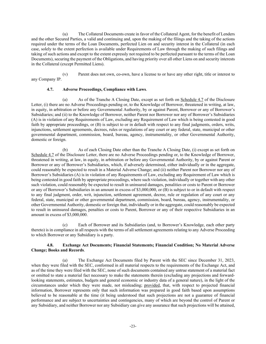 -23- (u) The Collateral Documents create in favor of the Collateral Agent, for the benefit of Lenders and the other Secured Parties, a valid and continuing and, upon the making of the filings and the taking of the actions required under the terms of the Loan Documents, perfected Lien on and security interest in the Collateral (in each case, solely to the extent perfection is available under Requirements of Law through the making of such filings and taking of such actions and except to the extent expressly not required to be perfected pursuant to the terms of the Loan Documents), securing the payment of the Obligations, and having priority over all other Liens on and security interests in the Collateral (except Permitted Liens). (v) Parent does not own, co-own, have a license to or have any other right, title or interest to any Company IP. 4.7. Adverse Proceedings, Compliance with Laws. (a) As of the Tranche A Closing Date, except as set forth on Schedule 4.7 of the Disclosure Letter, (i) there are no Adverse Proceedings pending or, to the Knowledge of Borrower, threatened in writing, at law, in equity, in arbitration or before any Governmental Authority, by or against Parent, Borrower or any of Borrower’s Subsidiaries; and (ii) to the Knowledge of Borrower, neither Parent nor Borrower nor any of Borrower’s Subsidiaries (A) is in violation of any Requirements of Law, excluding any Requirement of Law which is being contested in good faith by appropriate proceedings, or (B) is subject to or in default with respect to any final judgments, orders, writs, injunctions, settlement agreements, decrees, rules or regulations of any court or any federal, state, municipal or other governmental department, commission, board, bureau, agency, instrumentality, or other Governmental Authority, domestic or foreign. (b) As of each Closing Date other than the Tranche A Closing Date, (i) except as set forth on Schedule 4.7 of the Disclosure Letter, there are no Adverse Proceedings pending or, to the Knowledge of Borrower, threatened in writing, at law, in equity, in arbitration or before any Governmental Authority, by or against Parent or Borrower or any of Borrower’s Subsidiaries, which, if adversely determined, either individually or in the aggregate, could reasonably be expected to result in a Material Adverse Change; and (ii) neither Parent nor Borrower nor any of Borrower’s Subsidiaries (A) is in violation of any Requirements of Law, excluding any Requirement of Law which is being contested in good faith by appropriate proceedings, where such violation, individually or together with any other such violation, could reasonably be expected to result in uninsured damages, penalities or costs to Parent or Borrower or any of Borrower’s Subsidiaries in an amount in excess of $3,000,000, or (B) is subject to or in default with respect to any final judgment, order, writ, injunction, settlement agreement, decree, rule or regulation of any court or any federal, state, municipal or other governmental department, commission, board, bureau, agency, instrumentality, or other Governmental Authority, domestic or foreign that, individually or in the aggregate, could reasonably be expected to result in uninsured damages, penalties or costs to Parent, Borrower or any of their respective Subsidiaries in an amount in excess of $3,000,000. (c) Each of Borrower and its Subsidiaries (and, to Borrower’s Knowledge, each other party thereto) is in compliance in all respects with the terms of all settlement agreements relating to any Adverse Proceeding to which Borrower or any Subsidiary is a party. 4.8. Exchange Act Documents; Financial Statements; Financial Condition; No Material Adverse Change; Books and Records. (a) The Exchange Act Documents filed by Parent with the SEC since December 31, 2023, when they were filed with the SEC, conformed in all material respects to the requirements of the Exchange Act, and as of the time they were filed with the SEC, none of such documents contained any untrue statement of a material fact or omitted to state a material fact necessary to make the statements therein (excluding any projections and forward- looking statements, estimates, budgets and general economic or industry data of a general nature), in the light of the circumstances under which they were made, not misleading; provided, that, with respect to projected financial information, Borrower represents only that such information was prepared in good faith based upon assumptions believed to be reasonable at the time (it being understood that such projections are not a guarantee of financial performance and are subject to uncertainties and contingencies, many of which are beyond the control of Parent or any Subsidiary, and neither Borrower nor any Subsidiary can give any assurance that such projections will be attained,