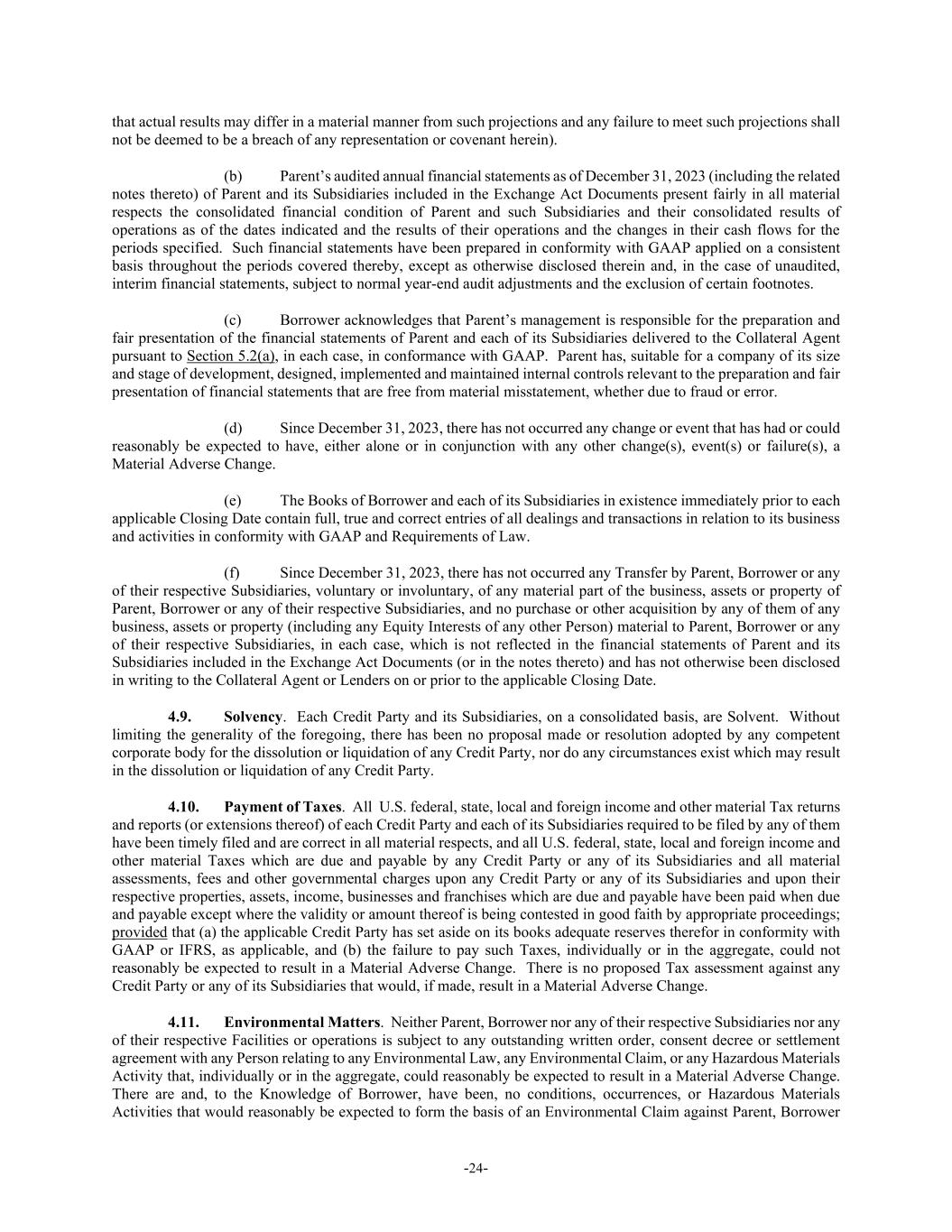 -24- that actual results may differ in a material manner from such projections and any failure to meet such projections shall not be deemed to be a breach of any representation or covenant herein). (b) Parent’s audited annual financial statements as of December 31, 2023 (including the related notes thereto) of Parent and its Subsidiaries included in the Exchange Act Documents present fairly in all material respects the consolidated financial condition of Parent and such Subsidiaries and their consolidated results of operations as of the dates indicated and the results of their operations and the changes in their cash flows for the periods specified. Such financial statements have been prepared in conformity with GAAP applied on a consistent basis throughout the periods covered thereby, except as otherwise disclosed therein and, in the case of unaudited, interim financial statements, subject to normal year-end audit adjustments and the exclusion of certain footnotes. (c) Borrower acknowledges that Parent’s management is responsible for the preparation and fair presentation of the financial statements of Parent and each of its Subsidiaries delivered to the Collateral Agent pursuant to Section 5.2(a), in each case, in conformance with GAAP. Parent has, suitable for a company of its size and stage of development, designed, implemented and maintained internal controls relevant to the preparation and fair presentation of financial statements that are free from material misstatement, whether due to fraud or error. (d) Since December 31, 2023, there has not occurred any change or event that has had or could reasonably be expected to have, either alone or in conjunction with any other change(s), event(s) or failure(s), a Material Adverse Change. (e) The Books of Borrower and each of its Subsidiaries in existence immediately prior to each applicable Closing Date contain full, true and correct entries of all dealings and transactions in relation to its business and activities in conformity with GAAP and Requirements of Law. (f) Since December 31, 2023, there has not occurred any Transfer by Parent, Borrower or any of their respective Subsidiaries, voluntary or involuntary, of any material part of the business, assets or property of Parent, Borrower or any of their respective Subsidiaries, and no purchase or other acquisition by any of them of any business, assets or property (including any Equity Interests of any other Person) material to Parent, Borrower or any of their respective Subsidiaries, in each case, which is not reflected in the financial statements of Parent and its Subsidiaries included in the Exchange Act Documents (or in the notes thereto) and has not otherwise been disclosed in writing to the Collateral Agent or Lenders on or prior to the applicable Closing Date. 4.9. Solvency. Each Credit Party and its Subsidiaries, on a consolidated basis, are Solvent. Without limiting the generality of the foregoing, there has been no proposal made or resolution adopted by any competent corporate body for the dissolution or liquidation of any Credit Party, nor do any circumstances exist which may result in the dissolution or liquidation of any Credit Party. 4.10. Payment of Taxes. All U.S. federal, state, local and foreign income and other material Tax returns and reports (or extensions thereof) of each Credit Party and each of its Subsidiaries required to be filed by any of them have been timely filed and are correct in all material respects, and all U.S. federal, state, local and foreign income and other material Taxes which are due and payable by any Credit Party or any of its Subsidiaries and all material assessments, fees and other governmental charges upon any Credit Party or any of its Subsidiaries and upon their respective properties, assets, income, businesses and franchises which are due and payable have been paid when due and payable except where the validity or amount thereof is being contested in good faith by appropriate proceedings; provided that (a) the applicable Credit Party has set aside on its books adequate reserves therefor in conformity with GAAP or IFRS, as applicable, and (b) the failure to pay such Taxes, individually or in the aggregate, could not reasonably be expected to result in a Material Adverse Change. There is no proposed Tax assessment against any Credit Party or any of its Subsidiaries that would, if made, result in a Material Adverse Change. 4.11. Environmental Matters. Neither Parent, Borrower nor any of their respective Subsidiaries nor any of their respective Facilities or operations is subject to any outstanding written order, consent decree or settlement agreement with any Person relating to any Environmental Law, any Environmental Claim, or any Hazardous Materials Activity that, individually or in the aggregate, could reasonably be expected to result in a Material Adverse Change. There are and, to the Knowledge of Borrower, have been, no conditions, occurrences, or Hazardous Materials Activities that would reasonably be expected to form the basis of an Environmental Claim against Parent, Borrower