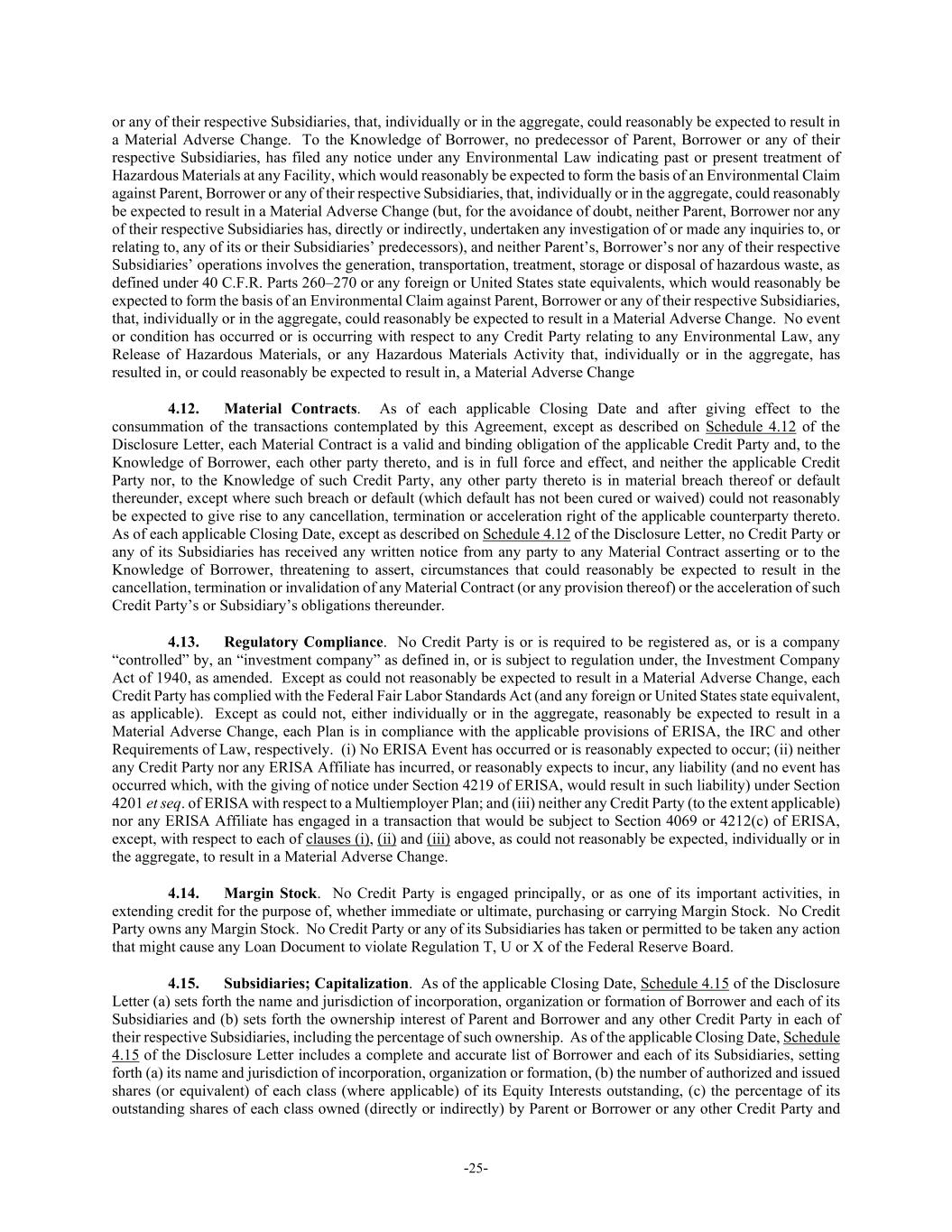 -25- or any of their respective Subsidiaries, that, individually or in the aggregate, could reasonably be expected to result in a Material Adverse Change. To the Knowledge of Borrower, no predecessor of Parent, Borrower or any of their respective Subsidiaries, has filed any notice under any Environmental Law indicating past or present treatment of Hazardous Materials at any Facility, which would reasonably be expected to form the basis of an Environmental Claim against Parent, Borrower or any of their respective Subsidiaries, that, individually or in the aggregate, could reasonably be expected to result in a Material Adverse Change (but, for the avoidance of doubt, neither Parent, Borrower nor any of their respective Subsidiaries has, directly or indirectly, undertaken any investigation of or made any inquiries to, or relating to, any of its or their Subsidiaries’ predecessors), and neither Parent’s, Borrower’s nor any of their respective Subsidiaries’ operations involves the generation, transportation, treatment, storage or disposal of hazardous waste, as defined under 40 C.F.R. Parts 260–270 or any foreign or United States state equivalents, which would reasonably be expected to form the basis of an Environmental Claim against Parent, Borrower or any of their respective Subsidiaries, that, individually or in the aggregate, could reasonably be expected to result in a Material Adverse Change. No event or condition has occurred or is occurring with respect to any Credit Party relating to any Environmental Law, any Release of Hazardous Materials, or any Hazardous Materials Activity that, individually or in the aggregate, has resulted in, or could reasonably be expected to result in, a Material Adverse Change 4.12. Material Contracts. As of each applicable Closing Date and after giving effect to the consummation of the transactions contemplated by this Agreement, except as described on Schedule 4.12 of the Disclosure Letter, each Material Contract is a valid and binding obligation of the applicable Credit Party and, to the Knowledge of Borrower, each other party thereto, and is in full force and effect, and neither the applicable Credit Party nor, to the Knowledge of such Credit Party, any other party thereto is in material breach thereof or default thereunder, except where such breach or default (which default has not been cured or waived) could not reasonably be expected to give rise to any cancellation, termination or acceleration right of the applicable counterparty thereto. As of each applicable Closing Date, except as described on Schedule 4.12 of the Disclosure Letter, no Credit Party or any of its Subsidiaries has received any written notice from any party to any Material Contract asserting or to the Knowledge of Borrower, threatening to assert, circumstances that could reasonably be expected to result in the cancellation, termination or invalidation of any Material Contract (or any provision thereof) or the acceleration of such Credit Party’s or Subsidiary’s obligations thereunder. 4.13. Regulatory Compliance. No Credit Party is or is required to be registered as, or is a company “controlled” by, an “investment company” as defined in, or is subject to regulation under, the Investment Company Act of 1940, as amended. Except as could not reasonably be expected to result in a Material Adverse Change, each Credit Party has complied with the Federal Fair Labor Standards Act (and any foreign or United States state equivalent, as applicable). Except as could not, either individually or in the aggregate, reasonably be expected to result in a Material Adverse Change, each Plan is in compliance with the applicable provisions of ERISA, the IRC and other Requirements of Law, respectively. (i) No ERISA Event has occurred or is reasonably expected to occur; (ii) neither any Credit Party nor any ERISA Affiliate has incurred, or reasonably expects to incur, any liability (and no event has occurred which, with the giving of notice under Section 4219 of ERISA, would result in such liability) under Section 4201 et seq. of ERISA with respect to a Multiemployer Plan; and (iii) neither any Credit Party (to the extent applicable) nor any ERISA Affiliate has engaged in a transaction that would be subject to Section 4069 or 4212(c) of ERISA, except, with respect to each of clauses (i), (ii) and (iii) above, as could not reasonably be expected, individually or in the aggregate, to result in a Material Adverse Change. 4.14. Margin Stock. No Credit Party is engaged principally, or as one of its important activities, in extending credit for the purpose of, whether immediate or ultimate, purchasing or carrying Margin Stock. No Credit Party owns any Margin Stock. No Credit Party or any of its Subsidiaries has taken or permitted to be taken any action that might cause any Loan Document to violate Regulation T, U or X of the Federal Reserve Board. 4.15. Subsidiaries; Capitalization. As of the applicable Closing Date, Schedule 4.15 of the Disclosure Letter (a) sets forth the name and jurisdiction of incorporation, organization or formation of Borrower and each of its Subsidiaries and (b) sets forth the ownership interest of Parent and Borrower and any other Credit Party in each of their respective Subsidiaries, including the percentage of such ownership. As of the applicable Closing Date, Schedule 4.15 of the Disclosure Letter includes a complete and accurate list of Borrower and each of its Subsidiaries, setting forth (a) its name and jurisdiction of incorporation, organization or formation, (b) the number of authorized and issued shares (or equivalent) of each class (where applicable) of its Equity Interests outstanding, (c) the percentage of its outstanding shares of each class owned (directly or indirectly) by Parent or Borrower or any other Credit Party and