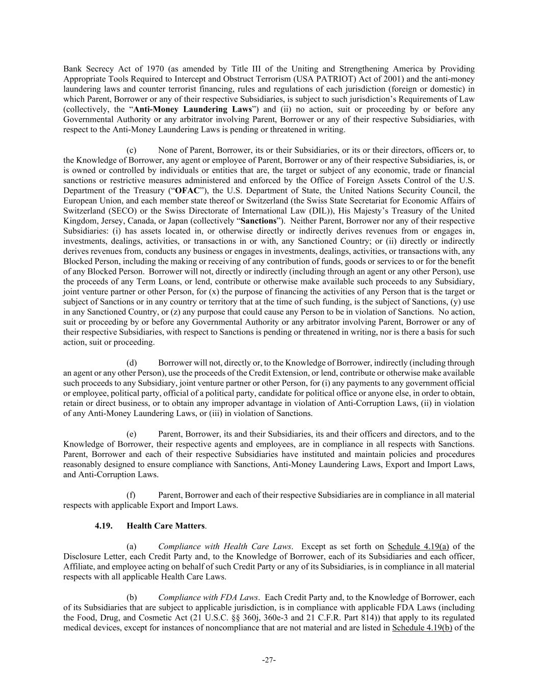 -27- Bank Secrecy Act of 1970 (as amended by Title III of the Uniting and Strengthening America by Providing Appropriate Tools Required to Intercept and Obstruct Terrorism (USA PATRIOT) Act of 2001) and the anti-money laundering laws and counter terrorist financing, rules and regulations of each jurisdiction (foreign or domestic) in which Parent, Borrower or any of their respective Subsidiaries, is subject to such jurisdiction’s Requirements of Law (collectively, the “Anti-Money Laundering Laws”) and (ii) no action, suit or proceeding by or before any Governmental Authority or any arbitrator involving Parent, Borrower or any of their respective Subsidiaries, with respect to the Anti-Money Laundering Laws is pending or threatened in writing. (c) None of Parent, Borrower, its or their Subsidiaries, or its or their directors, officers or, to the Knowledge of Borrower, any agent or employee of Parent, Borrower or any of their respective Subsidiaries, is, or is owned or controlled by individuals or entities that are, the target or subject of any economic, trade or financial sanctions or restrictive measures administered and enforced by the Office of Foreign Assets Control of the U.S. Department of the Treasury (“OFAC”), the U.S. Department of State, the United Nations Security Council, the European Union, and each member state thereof or Switzerland (the Swiss State Secretariat for Economic Affairs of Switzerland (SECO) or the Swiss Directorate of International Law (DIL)), His Majesty’s Treasury of the United Kingdom, Jersey, Canada, or Japan (collectively “Sanctions”). Neither Parent, Borrower nor any of their respective Subsidiaries: (i) has assets located in, or otherwise directly or indirectly derives revenues from or engages in, investments, dealings, activities, or transactions in or with, any Sanctioned Country; or (ii) directly or indirectly derives revenues from, conducts any business or engages in investments, dealings, activities, or transactions with, any Blocked Person, including the making or receiving of any contribution of funds, goods or services to or for the benefit of any Blocked Person. Borrower will not, directly or indirectly (including through an agent or any other Person), use the proceeds of any Term Loans, or lend, contribute or otherwise make available such proceeds to any Subsidiary, joint venture partner or other Person, for (x) the purpose of financing the activities of any Person that is the target or subject of Sanctions or in any country or territory that at the time of such funding, is the subject of Sanctions, (y) use in any Sanctioned Country, or (z) any purpose that could cause any Person to be in violation of Sanctions. No action, suit or proceeding by or before any Governmental Authority or any arbitrator involving Parent, Borrower or any of their respective Subsidiaries, with respect to Sanctions is pending or threatened in writing, nor is there a basis for such action, suit or proceeding. (d) Borrower will not, directly or, to the Knowledge of Borrower, indirectly (including through an agent or any other Person), use the proceeds of the Credit Extension, or lend, contribute or otherwise make available such proceeds to any Subsidiary, joint venture partner or other Person, for (i) any payments to any government official or employee, political party, official of a political party, candidate for political office or anyone else, in order to obtain, retain or direct business, or to obtain any improper advantage in violation of Anti-Corruption Laws, (ii) in violation of any Anti-Money Laundering Laws, or (iii) in violation of Sanctions. (e) Parent, Borrower, its and their Subsidiaries, its and their officers and directors, and to the Knowledge of Borrower, their respective agents and employees, are in compliance in all respects with Sanctions. Parent, Borrower and each of their respective Subsidiaries have instituted and maintain policies and procedures reasonably designed to ensure compliance with Sanctions, Anti-Money Laundering Laws, Export and Import Laws, and Anti-Corruption Laws. (f) Parent, Borrower and each of their respective Subsidiaries are in compliance in all material respects with applicable Export and Import Laws. 4.19. Health Care Matters. (a) Compliance with Health Care Laws. Except as set forth on Schedule 4.19(a) of the Disclosure Letter, each Credit Party and, to the Knowledge of Borrower, each of its Subsidiaries and each officer, Affiliate, and employee acting on behalf of such Credit Party or any of its Subsidiaries, is in compliance in all material respects with all applicable Health Care Laws. (b) Compliance with FDA Laws. Each Credit Party and, to the Knowledge of Borrower, each of its Subsidiaries that are subject to applicable jurisdiction, is in compliance with applicable FDA Laws (including the Food, Drug, and Cosmetic Act (21 U.S.C. §§ 360j, 360e-3 and 21 C.F.R. Part 814)) that apply to its regulated medical devices, except for instances of noncompliance that are not material and are listed in Schedule 4.19(b) of the