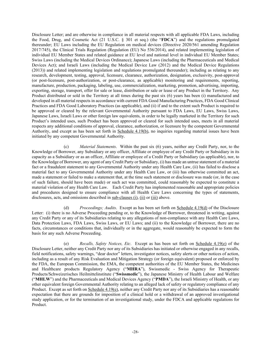 -28- Disclosure Letter; and are otherwise in compliance in all material respects with all applicable FDA Laws, including the Food, Drug, and Cosmetic Act (21 U.S.C. § 301 et seq.) (the “FDCA”) and the regulations promulgated thereunder; EU Laws including the EU Regulation on medical devices (Directive 2020/561 amending Regulation 2017/745), the Clinical Trials Regulation (Regulation (EU) No 536/2014), and related implementing legislation of individual EU Member States and related guidance at EU level and national level in individual EU Member States; Swiss Laws (including the Medical Devices Ordinance); Japanese Laws (including the Pharmaceuticals and Medical Devices Act); and Israeli Laws (including the Medical Device Law (2012) and the Medical Device Regulations (2013)) and related implementing legislation and regulations promulgated thereunder); including as relating to any research, development, testing, approval, licensure, clearance, authorization, designation, exclusivity, post-approval (or post-licensure, post-authorization, or post-clearance, as applicable) monitoring and requirements, reporting, manufacture, production, packaging, labeling, use, commercialization, marketing, promotion, advertising, importing, exporting, storage, transport, offer for sale or lease, distribution or sale or lease of any Product in the Territory. Any Product distributed or sold in the Territory at all times during the past six (6) years has been (i) manufactured and developed in all material respects in accordance with current FDA Good Manufacturing Practices, FDA Good Clinical Practices and FDA Good Laboratory Practices (as applicable), and (ii) if and to the extent such Product is required to be approved or cleared by the relevant Governmental Authority pursuant to FDA Laws, EU Laws, Swiss Laws, Japanese Laws, Israeli Laws or other foreign law equivalents, in order to be legally marketed in the Territory for such Product’s intended uses, such Product has been approved or cleared for such intended uses, meets in all material respects any additional conditions of approval, clearance, authorization, or licensure by the competent Governmental Authority, and except as has been set forth in Schedule 4.19(b), no inquiries regarding material issues have been initiated by any competent Governmental Authority. (c) Material Statements. Within the past six (6) years, neither any Credit Party, nor, to the Knowledge of Borrower, any Subsidiary or any officer, Affiliate or employee of any Credit Party or Subsidiary in its capacity as a Subsidiary or as an officer, Affiliate or employee of a Credit Party or Subsidiary (as applicable), nor, to the Knowledge of Borrower, any agent of any Credit Party or Subsidiary, (i) has made an untrue statement of a material fact or a fraudulent statement to any Governmental Authority under any Health Care Law, (ii) has failed to disclose a material fact to any Governmental Authority under any Health Care Law, or (iii) has otherwise committed an act, made a statement or failed to make a statement that, at the time such statement or disclosure was made (or, in the case of such failure, should have been made) or such act was committed, could reasonably be expected to constitute a material violation of any Health Care Law. Each Credit Party has implemented reasonable and appropriate policies and procedures designed to ensure compliance with all Health Care Laws concerning the types of statements, disclosures, acts, and omissions described in sub-clauses (i), (ii) or (iii) above. (d) Proceedings; Audits. Except as has been set forth on Schedule 4.19(d) of the Disclosure Letter: (i) there is no Adverse Proceeding pending or, to the Knowledge of Borrower, threatened in writing, against any Credit Party or any of its Subsidiaries relating to any allegations of non-compliance with any Health Care Laws, Data Protection Laws, FDA Laws, Swiss Laws, or EU Laws; and (ii) to the Knowledge of Borrower, there are no facts, circumstances or conditions that, individually or in the aggregate, would reasonably be expected to form the basis for any such Adverse Proceeding. (e) Recalls, Safety Notices, Etc. Except as has been set forth on Schedule 4.19(e) of the Disclosure Letter, neither any Credit Party nor any of its Subsidiaries has initiated or otherwise engaged in any recalls, field notifications, safety warnings, “dear doctor” letters, investigator notices, safety alerts or other notices of action, including as a result of any Risk Evaluation and Mitigation Strategy (or foreign equivalent) proposed or enforced by the FDA, the European Commission, the EMA, the competent authorities of the EU Member States, the Medicines and Healthcare products Regulatory Agency (“MHRA”), Swissmedic - Swiss Agency for Therapeutic Products/Schweizerisches Heilmittelinstitute (“Swissmedic”), the Japanese Ministry of Health Labour and Welfare (“MHLW”) and the Pharmaceuticals and Medical Devices Agency (“PMDA”), the Israeli Ministry of Health, or any other equivalent foreign Governmental Authority relating to an alleged lack of safety or regulatory compliance of any Product. Except as set forth on Schedule 4.19(e), neither any Credit Party nor any of its Subsidiaries has a reasonable expectation that there are grounds for imposition of a clinical hold or a withdrawal of an approved investigational study application, or for the termination of an investigational study, under the FDCA and applicable regulations for Product.