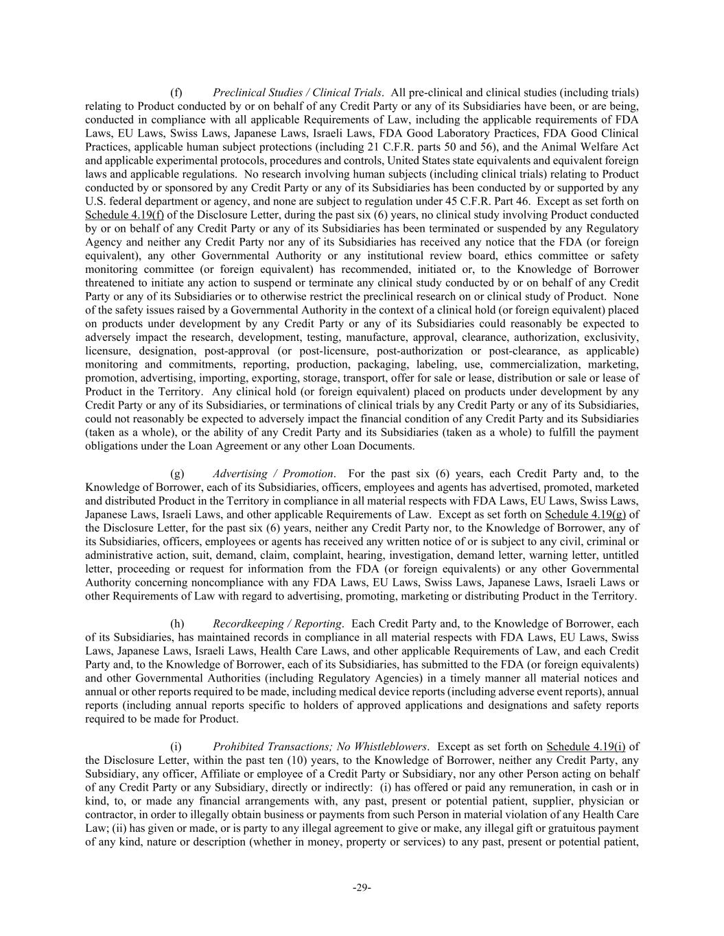 -29- (f) Preclinical Studies / Clinical Trials. All pre-clinical and clinical studies (including trials) relating to Product conducted by or on behalf of any Credit Party or any of its Subsidiaries have been, or are being, conducted in compliance with all applicable Requirements of Law, including the applicable requirements of FDA Laws, EU Laws, Swiss Laws, Japanese Laws, Israeli Laws, FDA Good Laboratory Practices, FDA Good Clinical Practices, applicable human subject protections (including 21 C.F.R. parts 50 and 56), and the Animal Welfare Act and applicable experimental protocols, procedures and controls, United States state equivalents and equivalent foreign laws and applicable regulations. No research involving human subjects (including clinical trials) relating to Product conducted by or sponsored by any Credit Party or any of its Subsidiaries has been conducted by or supported by any U.S. federal department or agency, and none are subject to regulation under 45 C.F.R. Part 46. Except as set forth on Schedule 4.19(f) of the Disclosure Letter, during the past six (6) years, no clinical study involving Product conducted by or on behalf of any Credit Party or any of its Subsidiaries has been terminated or suspended by any Regulatory Agency and neither any Credit Party nor any of its Subsidiaries has received any notice that the FDA (or foreign equivalent), any other Governmental Authority or any institutional review board, ethics committee or safety monitoring committee (or foreign equivalent) has recommended, initiated or, to the Knowledge of Borrower threatened to initiate any action to suspend or terminate any clinical study conducted by or on behalf of any Credit Party or any of its Subsidiaries or to otherwise restrict the preclinical research on or clinical study of Product. None of the safety issues raised by a Governmental Authority in the context of a clinical hold (or foreign equivalent) placed on products under development by any Credit Party or any of its Subsidiaries could reasonably be expected to adversely impact the research, development, testing, manufacture, approval, clearance, authorization, exclusivity, licensure, designation, post-approval (or post-licensure, post-authorization or post-clearance, as applicable) monitoring and commitments, reporting, production, packaging, labeling, use, commercialization, marketing, promotion, advertising, importing, exporting, storage, transport, offer for sale or lease, distribution or sale or lease of Product in the Territory. Any clinical hold (or foreign equivalent) placed on products under development by any Credit Party or any of its Subsidiaries, or terminations of clinical trials by any Credit Party or any of its Subsidiaries, could not reasonably be expected to adversely impact the financial condition of any Credit Party and its Subsidiaries (taken as a whole), or the ability of any Credit Party and its Subsidiaries (taken as a whole) to fulfill the payment obligations under the Loan Agreement or any other Loan Documents. (g) Advertising / Promotion. For the past six (6) years, each Credit Party and, to the Knowledge of Borrower, each of its Subsidiaries, officers, employees and agents has advertised, promoted, marketed and distributed Product in the Territory in compliance in all material respects with FDA Laws, EU Laws, Swiss Laws, Japanese Laws, Israeli Laws, and other applicable Requirements of Law. Except as set forth on Schedule 4.19(g) of the Disclosure Letter, for the past six (6) years, neither any Credit Party nor, to the Knowledge of Borrower, any of its Subsidiaries, officers, employees or agents has received any written notice of or is subject to any civil, criminal or administrative action, suit, demand, claim, complaint, hearing, investigation, demand letter, warning letter, untitled letter, proceeding or request for information from the FDA (or foreign equivalents) or any other Governmental Authority concerning noncompliance with any FDA Laws, EU Laws, Swiss Laws, Japanese Laws, Israeli Laws or other Requirements of Law with regard to advertising, promoting, marketing or distributing Product in the Territory. (h) Recordkeeping / Reporting. Each Credit Party and, to the Knowledge of Borrower, each of its Subsidiaries, has maintained records in compliance in all material respects with FDA Laws, EU Laws, Swiss Laws, Japanese Laws, Israeli Laws, Health Care Laws, and other applicable Requirements of Law, and each Credit Party and, to the Knowledge of Borrower, each of its Subsidiaries, has submitted to the FDA (or foreign equivalents) and other Governmental Authorities (including Regulatory Agencies) in a timely manner all material notices and annual or other reports required to be made, including medical device reports (including adverse event reports), annual reports (including annual reports specific to holders of approved applications and designations and safety reports required to be made for Product. (i) Prohibited Transactions; No Whistleblowers. Except as set forth on Schedule 4.19(i) of the Disclosure Letter, within the past ten (10) years, to the Knowledge of Borrower, neither any Credit Party, any Subsidiary, any officer, Affiliate or employee of a Credit Party or Subsidiary, nor any other Person acting on behalf of any Credit Party or any Subsidiary, directly or indirectly: (i) has offered or paid any remuneration, in cash or in kind, to, or made any financial arrangements with, any past, present or potential patient, supplier, physician or contractor, in order to illegally obtain business or payments from such Person in material violation of any Health Care Law; (ii) has given or made, or is party to any illegal agreement to give or make, any illegal gift or gratuitous payment of any kind, nature or description (whether in money, property or services) to any past, present or potential patient,
