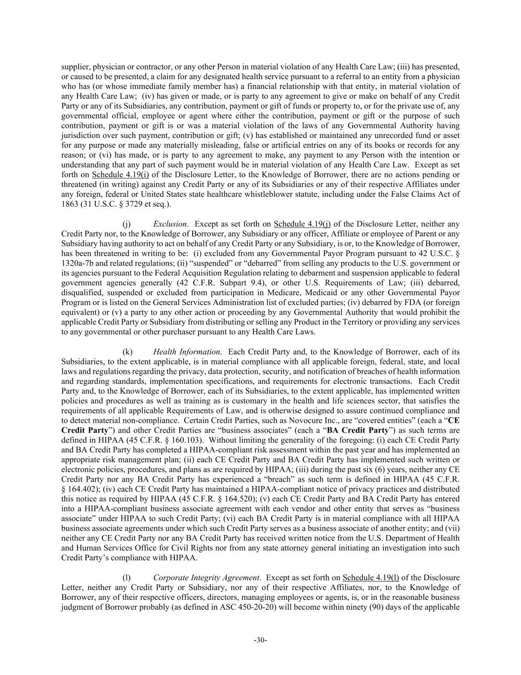-30- supplier, physician or contractor, or any other Person in material violation of any Health Care Law; (iii) has presented, or caused to be presented, a claim for any designated health service pursuant to a referral to an entity from a physician who has (or whose immediate family member has) a financial relationship with that entity, in material violation of any Health Care Law; (iv) has given or made, or is party to any agreement to give or make on behalf of any Credit Party or any of its Subsidiaries, any contribution, payment or gift of funds or property to, or for the private use of, any governmental official, employee or agent where either the contribution, payment or gift or the purpose of such contribution, payment or gift is or was a material violation of the laws of any Governmental Authority having jurisdiction over such payment, contribution or gift; (v) has established or maintained any unrecorded fund or asset for any purpose or made any materially misleading, false or artificial entries on any of its books or records for any reason; or (vi) has made, or is party to any agreement to make, any payment to any Person with the intention or understanding that any part of such payment would be in material violation of any Health Care Law. Except as set forth on Schedule 4.19(i) of the Disclosure Letter, to the Knowledge of Borrower, there are no actions pending or threatened (in writing) against any Credit Party or any of its Subsidiaries or any of their respective Affiliates under any foreign, federal or United States state healthcare whistleblower statute, including under the False Claims Act of 1863 (31 U.S.C. § 3729 et seq.). (j) Exclusion. Except as set forth on Schedule 4.19(j) of the Disclosure Letter, neither any Credit Party nor, to the Knowledge of Borrower, any Subsidiary or any officer, Affiliate or employee of Parent or any Subsidiary having authority to act on behalf of any Credit Party or any Subsidiary, is or, to the Knowledge of Borrower, has been threatened in writing to be: (i) excluded from any Governmental Payor Program pursuant to 42 U.S.C. § 1320a-7b and related regulations; (ii) “suspended” or “debarred” from selling any products to the U.S. government or its agencies pursuant to the Federal Acquisition Regulation relating to debarment and suspension applicable to federal government agencies generally (42 C.F.R. Subpart 9.4), or other U.S. Requirements of Law; (iii) debarred, disqualified, suspended or excluded from participation in Medicare, Medicaid or any other Governmental Payor Program or is listed on the General Services Administration list of excluded parties; (iv) debarred by FDA (or foreign equivalent) or (v) a party to any other action or proceeding by any Governmental Authority that would prohibit the applicable Credit Party or Subsidiary from distributing or selling any Product in the Territory or providing any services to any governmental or other purchaser pursuant to any Health Care Laws. (k) Health Information. Each Credit Party and, to the Knowledge of Borrower, each of its Subsidiaries, to the extent applicable, is in material compliance with all applicable foreign, federal, state, and local laws and regulations regarding the privacy, data protection, security, and notification of breaches of health information and regarding standards, implementation specifications, and requirements for electronic transactions. Each Credit Party and, to the Knowledge of Borrower, each of its Subsidiaries, to the extent applicable, has implemented written policies and procedures as well as training as is customary in the health and life sciences sector, that satisfies the requirements of all applicable Requirements of Law, and is otherwise designed to assure continued compliance and to detect material non-compliance. Certain Credit Parties, such as Novocure Inc., are “covered entities” (each a “CE Credit Party”) and other Credit Parties are “business associates” (each a “BA Credit Party”) as such terms are defined in HIPAA (45 C.F.R. § 160.103). Without limiting the generality of the foregoing: (i) each CE Credit Party and BA Credit Party has completed a HIPAA-compliant risk assessment within the past year and has implemented an appropriate risk management plan; (ii) each CE Credit Party and BA Credit Party has implemented such written or electronic policies, procedures, and plans as are required by HIPAA; (iii) during the past six (6) years, neither any CE Credit Party nor any BA Credit Party has experienced a “breach” as such term is defined in HIPAA (45 C.F.R. § 164.402); (iv) each CE Credit Party has maintained a HIPAA-compliant notice of privacy practices and distributed this notice as required by HIPAA (45 C.F.R. § 164.520); (v) each CE Credit Party and BA Credit Party has entered into a HIPAA-compliant business associate agreement with each vendor and other entity that serves as “business associate” under HIPAA to such Credit Party; (vi) each BA Credit Party is in material compliance with all HIPAA business associate agreements under which such Credit Party serves as a business associate of another entity; and (vii) neither any CE Credit Party nor any BA Credit Party has received written notice from the U.S. Department of Health and Human Services Office for Civil Rights nor from any state attorney general initiating an investigation into such Credit Party’s compliance with HIPAA. (l) Corporate Integrity Agreement. Except as set forth on Schedule 4.19(l) of the Disclosure Letter, neither any Credit Party or Subsidiary, nor any of their respective Affiliates, nor, to the Knowledge of Borrower, any of their respective officers, directors, managing employees or agents, is, or in the reasonable business judgment of Borrower probably (as defined in ASC 450-20-20) will become within ninety (90) days of the applicable