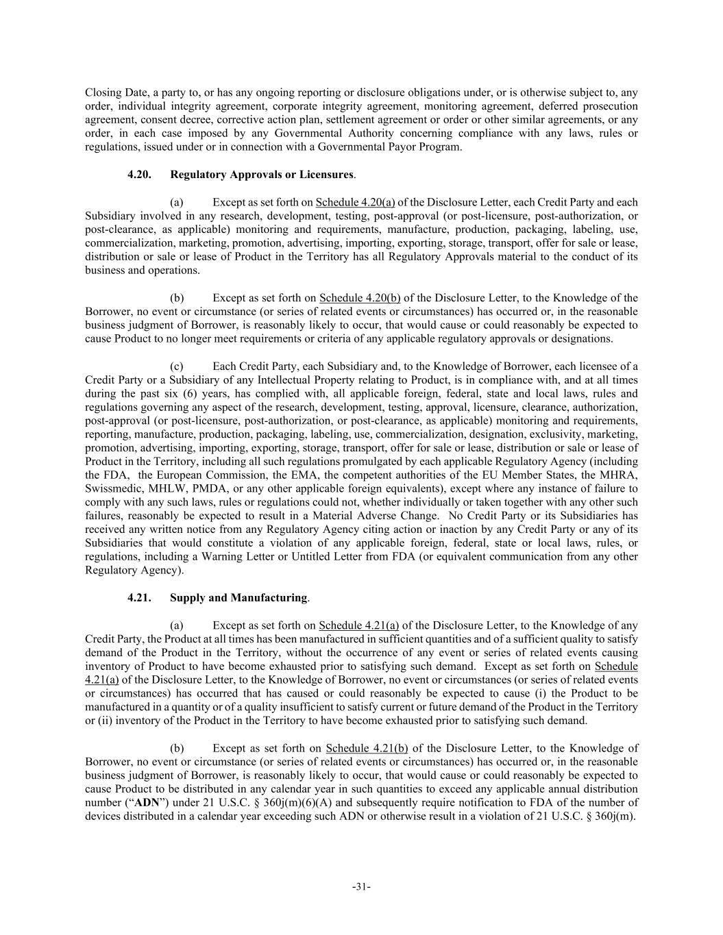 -31- Closing Date, a party to, or has any ongoing reporting or disclosure obligations under, or is otherwise subject to, any order, individual integrity agreement, corporate integrity agreement, monitoring agreement, deferred prosecution agreement, consent decree, corrective action plan, settlement agreement or order or other similar agreements, or any order, in each case imposed by any Governmental Authority concerning compliance with any laws, rules or regulations, issued under or in connection with a Governmental Payor Program. 4.20. Regulatory Approvals or Licensures. (a) Except as set forth on Schedule 4.20(a) of the Disclosure Letter, each Credit Party and each Subsidiary involved in any research, development, testing, post-approval (or post-licensure, post-authorization, or post-clearance, as applicable) monitoring and requirements, manufacture, production, packaging, labeling, use, commercialization, marketing, promotion, advertising, importing, exporting, storage, transport, offer for sale or lease, distribution or sale or lease of Product in the Territory has all Regulatory Approvals material to the conduct of its business and operations. (b) Except as set forth on Schedule 4.20(b) of the Disclosure Letter, to the Knowledge of the Borrower, no event or circumstance (or series of related events or circumstances) has occurred or, in the reasonable business judgment of Borrower, is reasonably likely to occur, that would cause or could reasonably be expected to cause Product to no longer meet requirements or criteria of any applicable regulatory approvals or designations. (c) Each Credit Party, each Subsidiary and, to the Knowledge of Borrower, each licensee of a Credit Party or a Subsidiary of any Intellectual Property relating to Product, is in compliance with, and at all times during the past six (6) years, has complied with, all applicable foreign, federal, state and local laws, rules and regulations governing any aspect of the research, development, testing, approval, licensure, clearance, authorization, post-approval (or post-licensure, post-authorization, or post-clearance, as applicable) monitoring and requirements, reporting, manufacture, production, packaging, labeling, use, commercialization, designation, exclusivity, marketing, promotion, advertising, importing, exporting, storage, transport, offer for sale or lease, distribution or sale or lease of Product in the Territory, including all such regulations promulgated by each applicable Regulatory Agency (including the FDA, the European Commission, the EMA, the competent authorities of the EU Member States, the MHRA, Swissmedic, MHLW, PMDA, or any other applicable foreign equivalents), except where any instance of failure to comply with any such laws, rules or regulations could not, whether individually or taken together with any other such failures, reasonably be expected to result in a Material Adverse Change. No Credit Party or its Subsidiaries has received any written notice from any Regulatory Agency citing action or inaction by any Credit Party or any of its Subsidiaries that would constitute a violation of any applicable foreign, federal, state or local laws, rules, or regulations, including a Warning Letter or Untitled Letter from FDA (or equivalent communication from any other Regulatory Agency). 4.21. Supply and Manufacturing. (a) Except as set forth on Schedule 4.21(a) of the Disclosure Letter, to the Knowledge of any Credit Party, the Product at all times has been manufactured in sufficient quantities and of a sufficient quality to satisfy demand of the Product in the Territory, without the occurrence of any event or series of related events causing inventory of Product to have become exhausted prior to satisfying such demand. Except as set forth on Schedule 4.21(a) of the Disclosure Letter, to the Knowledge of Borrower, no event or circumstances (or series of related events or circumstances) has occurred that has caused or could reasonably be expected to cause (i) the Product to be manufactured in a quantity or of a quality insufficient to satisfy current or future demand of the Product in the Territory or (ii) inventory of the Product in the Territory to have become exhausted prior to satisfying such demand. (b) Except as set forth on Schedule 4.21(b) of the Disclosure Letter, to the Knowledge of Borrower, no event or circumstance (or series of related events or circumstances) has occurred or, in the reasonable business judgment of Borrower, is reasonably likely to occur, that would cause or could reasonably be expected to cause Product to be distributed in any calendar year in such quantities to exceed any applicable annual distribution number (“ADN”) under 21 U.S.C. § 360j(m)(6)(A) and subsequently require notification to FDA of the number of devices distributed in a calendar year exceeding such ADN or otherwise result in a violation of 21 U.S.C. § 360j(m).