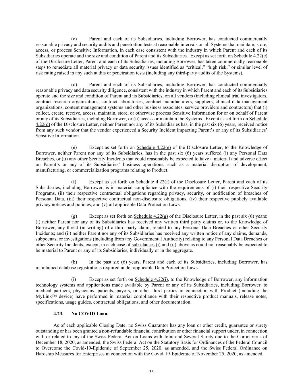 -33- (c) Parent and each of its Subsidiaries, including Borrower, has conducted commercially reasonable privacy and security audits and penetration tests at reasonable intervals on all Systems that maintain, store, access, or process Sensitive Information, in each case consistent with the industry in which Parent and each of its Subsidiaries operate and the size and condition of Parent and its Subsidiaries. Except as set forth on Schedule 4.22(c) of the Disclosure Letter, Parent and each of its Subsidiaries, including Borrower, has taken commercially reasonable steps to remediate all material privacy or data security issues identified as “critical,” “high risk,” or similar level of risk rating raised in any such audits or penetration tests (including any third-party audits of the Systems). (d) Parent and each of its Subsidiaries, including Borrower, has conducted commercially reasonable privacy and data security diligence, consistent with the industry in which Parent and each of its Subsidiaries operate and the size and condition of Parent and its Subsidiaries, on all vendors (including clinical trial investigators, contract research organizations, contract laboratories, contract manufacturers, suppliers, clinical data management organizations, content management systems and other business associates, service providers and contractors) that (i) collect, create, receive, access, maintain, store, or otherwise process Sensitive Information for or on behalf of Parent or any of its Subsidiaries, including Borrower, or (ii) access or maintain the Systems. Except as set forth on Schedule 4.22(d) of the Disclosure Letter, neither Parent nor any of its Subsidiaries has, in the past six (6) years, received notice from any such vendor that the vendor experienced a Security Incident impacting Parent’s or any of its Subsidiaries’ Sensitive Information. (e) Except as set forth on Schedule 4.22(e) of the Disclosure Letter, to the Knowledge of Borrower, neither Parent nor any of its Subsidiaries, has in the past six (6) years suffered (i) any Personal Data Breaches, or (ii) any other Security Incidents that could reasonably be expected to have a material and adverse effect on Parent’s or any of its Subsidiaries’ business operations, such as a material disruption of development, manufacturing, or commercialization programs relating to Product. (f) Except as set forth on Schedule 4.22(f) of the Disclosure Letter, Parent and each of its Subsidiaries, including Borrower, is in material compliance with the requirements of (i) their respective Security Programs, (ii) their respective contractual obligations regarding privacy, security, or notification of breaches of Personal Data, (iii) their respective contractual non-disclosure obligations, (iv) their respective publicly available privacy notices and policies, and (v) all applicable Data Protection Laws. (g) Except as set forth on Schedule 4.22(g) of the Disclosure Letter, in the past six (6) years: (i) neither Parent nor any of its Subsidiaries has received any written third party claims or, to the Knowledge of Borrower, any threat (in writing) of a third party claim, related to any Personal Data Breaches or other Security Incidents; and (ii) neither Parent nor any of its Subsidiaries has received any written notice of any claims, demands, subpoenas, or investigations (including from any Governmental Authority) relating to any Personal Data Breaches or other Security Incidents, except, in each case of sub-clauses (i) and (ii) above as could not reasonably be expected to be material to Parent or any of its Subsidiaries, individually or in the aggregate. (h) In the past six (6) years, Parent and each of its Subsidiaries, including Borrower, has maintained database registrations required under applicable Data Protection Laws. (i) Except as set forth on Schedule 4.22(i), to the Knowledge of Borrower, any information technology systems and applications made available by Parent or any of its Subsidiaries, including Borrower, to medical partners, physicians, patients, payors, or other third parties in connection with Product (including the MyLink™ device) have performed in material compliance with their respective product manuals, release notes, specifications, usage guides, contractual obligations, and other documentation. 4.23. No COVID Loan. As of each applicable Closing Date, no Swiss Guarantor has any loan or other credit, guarantee or surety outstanding or has been granted a non-refundable financial contribution or other financial support under, in connection with or related to any of the Swiss Federal Act on Loans with Joint and Several Surety due to the Coronavirus of December 18, 2020, as amended, the Swiss Federal Act on the Statutory Basis for Ordinances of the Federal Council to Overcome the Covid-19-Epidemic of September 25, 2020, as amended, and the Swiss Federal Ordinance on Hardship Measures for Enterprises in connection with the Covid-19-Epidemic of November 25, 2020, as amended.