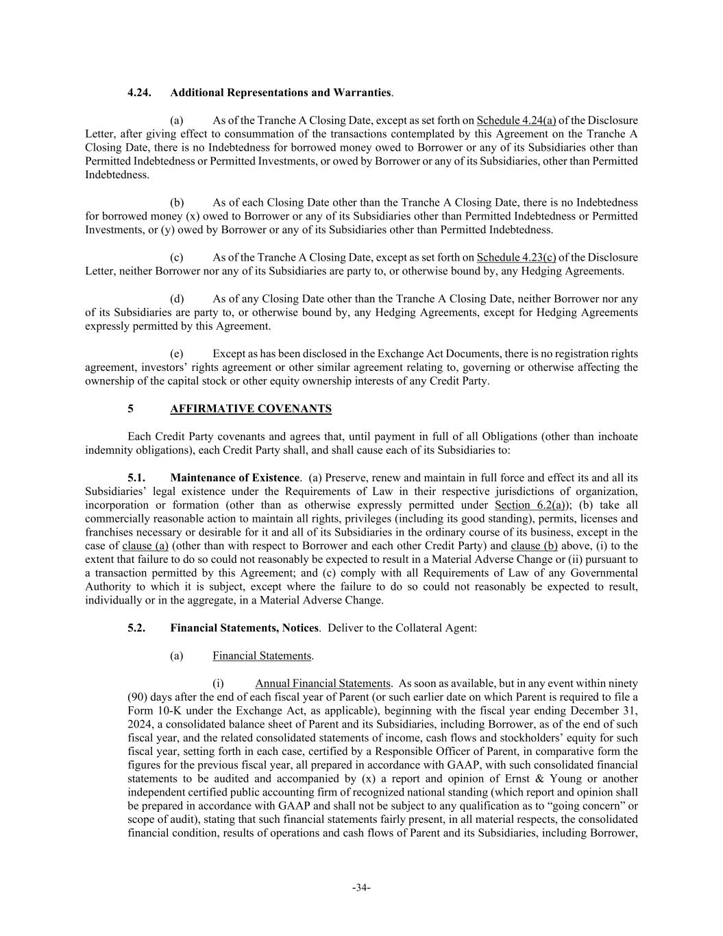 -34- 4.24. Additional Representations and Warranties. (a) As of the Tranche A Closing Date, except as set forth on Schedule 4.24(a) of the Disclosure Letter, after giving effect to consummation of the transactions contemplated by this Agreement on the Tranche A Closing Date, there is no Indebtedness for borrowed money owed to Borrower or any of its Subsidiaries other than Permitted Indebtedness or Permitted Investments, or owed by Borrower or any of its Subsidiaries, other than Permitted Indebtedness. (b) As of each Closing Date other than the Tranche A Closing Date, there is no Indebtedness for borrowed money (x) owed to Borrower or any of its Subsidiaries other than Permitted Indebtedness or Permitted Investments, or (y) owed by Borrower or any of its Subsidiaries other than Permitted Indebtedness. (c) As of the Tranche A Closing Date, except as set forth on Schedule 4.23(c) of the Disclosure Letter, neither Borrower nor any of its Subsidiaries are party to, or otherwise bound by, any Hedging Agreements. (d) As of any Closing Date other than the Tranche A Closing Date, neither Borrower nor any of its Subsidiaries are party to, or otherwise bound by, any Hedging Agreements, except for Hedging Agreements expressly permitted by this Agreement. (e) Except as has been disclosed in the Exchange Act Documents, there is no registration rights agreement, investors’ rights agreement or other similar agreement relating to, governing or otherwise affecting the ownership of the capital stock or other equity ownership interests of any Credit Party. 5 AFFIRMATIVE COVENANTS Each Credit Party covenants and agrees that, until payment in full of all Obligations (other than inchoate indemnity obligations), each Credit Party shall, and shall cause each of its Subsidiaries to: 5.1. Maintenance of Existence. (a) Preserve, renew and maintain in full force and effect its and all its Subsidiaries’ legal existence under the Requirements of Law in their respective jurisdictions of organization, incorporation or formation (other than as otherwise expressly permitted under Section 6.2(a)); (b) take all commercially reasonable action to maintain all rights, privileges (including its good standing), permits, licenses and franchises necessary or desirable for it and all of its Subsidiaries in the ordinary course of its business, except in the case of clause (a) (other than with respect to Borrower and each other Credit Party) and clause (b) above, (i) to the extent that failure to do so could not reasonably be expected to result in a Material Adverse Change or (ii) pursuant to a transaction permitted by this Agreement; and (c) comply with all Requirements of Law of any Governmental Authority to which it is subject, except where the failure to do so could not reasonably be expected to result, individually or in the aggregate, in a Material Adverse Change. 5.2. Financial Statements, Notices. Deliver to the Collateral Agent: (a) Financial Statements. (i) Annual Financial Statements. As soon as available, but in any event within ninety (90) days after the end of each fiscal year of Parent (or such earlier date on which Parent is required to file a Form 10-K under the Exchange Act, as applicable), beginning with the fiscal year ending December 31, 2024, a consolidated balance sheet of Parent and its Subsidiaries, including Borrower, as of the end of such fiscal year, and the related consolidated statements of income, cash flows and stockholders’ equity for such fiscal year, setting forth in each case, certified by a Responsible Officer of Parent, in comparative form the figures for the previous fiscal year, all prepared in accordance with GAAP, with such consolidated financial statements to be audited and accompanied by (x) a report and opinion of Ernst & Young or another independent certified public accounting firm of recognized national standing (which report and opinion shall be prepared in accordance with GAAP and shall not be subject to any qualification as to “going concern” or scope of audit), stating that such financial statements fairly present, in all material respects, the consolidated financial condition, results of operations and cash flows of Parent and its Subsidiaries, including Borrower,