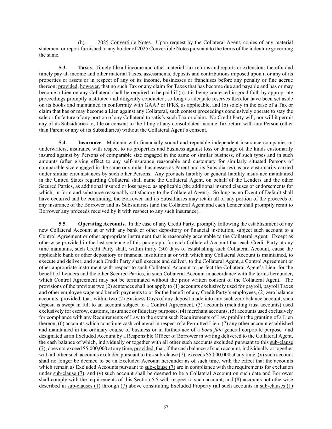 -37- (h) 2025 Convertible Notes. Upon request by the Collateral Agent, copies of any material statement or report furnished to any holder of 2025 Convertible Notes pursuant to the terms of the indenture governing the same. 5.3. Taxes. Timely file all income and other material Tax returns and reports or extensions therefor and timely pay all income and other material Taxes, assessments, deposits and contributions imposed upon it or any of its properties or assets or in respect of any of its income, businesses or franchises before any penalty or fine accrue thereon; provided, however, that no such Tax or any claim for Taxes that has become due and payable and has or may become a Lien on any Collateral shall be required to be paid if (a) it is being contested in good faith by appropriate proceedings promptly instituted and diligently conducted, so long as adequate reserves therefor have been set aside on its books and maintained in conformity with GAAP or IFRS, as applicable, and (b) solely in the case of a Tax or claim that has or may become a Lien against any Collateral, such contest proceedings conclusively operate to stay the sale or forfeiture of any portion of any Collateral to satisfy such Tax or claim. No Credit Party will, nor will it permit any of its Subsidiaries to, file or consent to the filing of any consolidated income Tax return with any Person (other than Parent or any of its Subsidiaries) without the Collateral Agent’s consent. 5.4. Insurance. Maintain with financially sound and reputable independent insurance companies or underwriters, insurance with respect to its properties and business against loss or damage of the kinds customarily insured against by Persons of comparable size engaged in the same or similar business, of such types and in such amounts (after giving effect to any self-insurance reasonable and customary for similarly situated Persons of comparable size engaged in the same or similar businesses as Parent and its Subsidiaries) as are customarily carried under similar circumstances by such other Persons. Any products liability or general liability insurance maintained in the United States regarding Collateral shall name the Collateral Agent, on behalf of the Lenders and the other Secured Parties, as additional insured or loss payee, as applicable (the additional insured clauses or endorsements for which, in form and substance reasonably satisfactory to the Collateral Agent). So long as no Event of Default shall have occurred and be continuing, the Borrower and its Subsidiaries may retain all or any portion of the proceeds of any insurance of the Borrower and its Subsidiaries (and the Collateral Agent and each Lender shall promptly remit to Borrower any proceeds received by it with respect to any such insurance). 5.5. Operating Accounts. In the case of any Credit Party, promptly following the establishment of any new Collateral Account at or with any bank or other depository or financial institution, subject such account to a Control Agreement or other appropriate instrument that is reasonably acceptable to the Collateral Agent. Except as otherwise provided in the last sentence of this paragraph, for each Collateral Account that each Credit Party at any time maintains, such Credit Party shall, within thirty (30) days of establishing such Collateral Account, cause the applicable bank or other depository or financial institution at or with which any Collateral Account is maintained, to execute and deliver, and such Credit Party shall execute and deliver, to the Collateral Agent, a Control Agreement or other appropriate instrument with respect to such Collateral Account to perfect the Collateral Agent’s Lien, for the benefit of Lenders and the other Secured Parties, in such Collateral Account in accordance with the terms hereunder, which Control Agreement may not be terminated without the prior written consent of the Collateral Agent. The provisions of the previous two (2) sentences shall not apply to (1) accounts exclusively used for payroll, payroll Taxes and other employee wage and benefit payments to or for the benefit of any Credit Party’s employees, (2) zero balance accounts, provided, that, within two (2) Business Days of any deposit made into any such zero balance account, such deposit is swept in full to an account subject to a Control Agreement, (3) accounts (including trust accounts) used exclusively for escrow, customs, insurance or fiduciary purposes, (4) merchant accounts, (5) accounts used exclusively for compliance with any Requirements of Law to the extent such Requirements of Law prohibit the granting of a Lien thereon, (6) accounts which constitute cash collateral in respect of a Permitted Lien, (7) any other account established and maintained in the ordinary course of business or in furtherance of a bona fide general corporate purpose and designated as an Excluded Account by a Responsible Officer of Borrower in writing delivered to the Collateral Agent, the cash balance of which, individually or together with all other such accounts excluded pursuant to this sub-clause (7), does not exceed $5,000,000 at any time, provided, that, if the cash balance of such account, individually or together with all other such accounts excluded pursuant to this sub-clause (7), exceeds $5,000,000 at any time, (x) such account shall no longer be deemed to be an Excluded Account hereunder as of such time, with the effect that the accounts which remain as Excluded Accounts pursuant to sub-clause (7) are in compliance with the requirements for exclusion under sub-clause (7), and (y) such account shall be deemed to be a Collateral Account on such date and Borrower shall comply with the requirements of this Section 5.5 with respect to such account, and (8) accounts not otherwise described in sub-clauses (1) through (7) above constituting Excluded Property (all such accounts in sub-clauses (1)