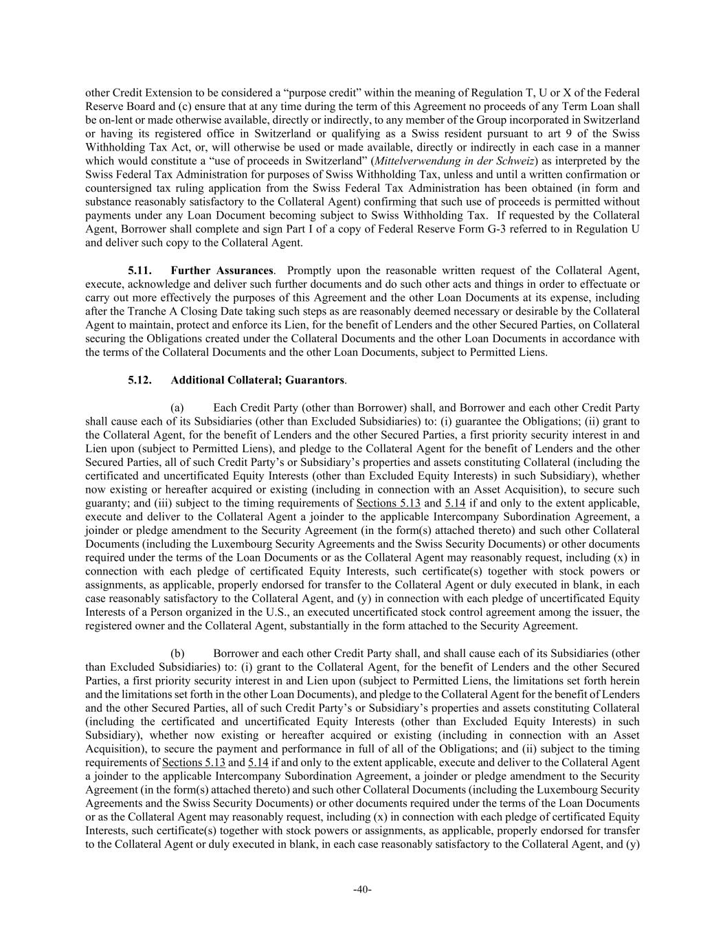 -40- other Credit Extension to be considered a “purpose credit” within the meaning of Regulation T, U or X of the Federal Reserve Board and (c) ensure that at any time during the term of this Agreement no proceeds of any Term Loan shall be on-lent or made otherwise available, directly or indirectly, to any member of the Group incorporated in Switzerland or having its registered office in Switzerland or qualifying as a Swiss resident pursuant to art 9 of the Swiss Withholding Tax Act, or, will otherwise be used or made available, directly or indirectly in each case in a manner which would constitute a “use of proceeds in Switzerland” (Mittelverwendung in der Schweiz) as interpreted by the Swiss Federal Tax Administration for purposes of Swiss Withholding Tax, unless and until a written confirmation or countersigned tax ruling application from the Swiss Federal Tax Administration has been obtained (in form and substance reasonably satisfactory to the Collateral Agent) confirming that such use of proceeds is permitted without payments under any Loan Document becoming subject to Swiss Withholding Tax. If requested by the Collateral Agent, Borrower shall complete and sign Part I of a copy of Federal Reserve Form G-3 referred to in Regulation U and deliver such copy to the Collateral Agent. 5.11. Further Assurances. Promptly upon the reasonable written request of the Collateral Agent, execute, acknowledge and deliver such further documents and do such other acts and things in order to effectuate or carry out more effectively the purposes of this Agreement and the other Loan Documents at its expense, including after the Tranche A Closing Date taking such steps as are reasonably deemed necessary or desirable by the Collateral Agent to maintain, protect and enforce its Lien, for the benefit of Lenders and the other Secured Parties, on Collateral securing the Obligations created under the Collateral Documents and the other Loan Documents in accordance with the terms of the Collateral Documents and the other Loan Documents, subject to Permitted Liens. 5.12. Additional Collateral; Guarantors. (a) Each Credit Party (other than Borrower) shall, and Borrower and each other Credit Party shall cause each of its Subsidiaries (other than Excluded Subsidiaries) to: (i) guarantee the Obligations; (ii) grant to the Collateral Agent, for the benefit of Lenders and the other Secured Parties, a first priority security interest in and Lien upon (subject to Permitted Liens), and pledge to the Collateral Agent for the benefit of Lenders and the other Secured Parties, all of such Credit Party’s or Subsidiary’s properties and assets constituting Collateral (including the certificated and uncertificated Equity Interests (other than Excluded Equity Interests) in such Subsidiary), whether now existing or hereafter acquired or existing (including in connection with an Asset Acquisition), to secure such guaranty; and (iii) subject to the timing requirements of Sections 5.13 and 5.14 if and only to the extent applicable, execute and deliver to the Collateral Agent a joinder to the applicable Intercompany Subordination Agreement, a joinder or pledge amendment to the Security Agreement (in the form(s) attached thereto) and such other Collateral Documents (including the Luxembourg Security Agreements and the Swiss Security Documents) or other documents required under the terms of the Loan Documents or as the Collateral Agent may reasonably request, including (x) in connection with each pledge of certificated Equity Interests, such certificate(s) together with stock powers or assignments, as applicable, properly endorsed for transfer to the Collateral Agent or duly executed in blank, in each case reasonably satisfactory to the Collateral Agent, and (y) in connection with each pledge of uncertificated Equity Interests of a Person organized in the U.S., an executed uncertificated stock control agreement among the issuer, the registered owner and the Collateral Agent, substantially in the form attached to the Security Agreement. (b) Borrower and each other Credit Party shall, and shall cause each of its Subsidiaries (other than Excluded Subsidiaries) to: (i) grant to the Collateral Agent, for the benefit of Lenders and the other Secured Parties, a first priority security interest in and Lien upon (subject to Permitted Liens, the limitations set forth herein and the limitations set forth in the other Loan Documents), and pledge to the Collateral Agent for the benefit of Lenders and the other Secured Parties, all of such Credit Party’s or Subsidiary’s properties and assets constituting Collateral (including the certificated and uncertificated Equity Interests (other than Excluded Equity Interests) in such Subsidiary), whether now existing or hereafter acquired or existing (including in connection with an Asset Acquisition), to secure the payment and performance in full of all of the Obligations; and (ii) subject to the timing requirements of Sections 5.13 and 5.14 if and only to the extent applicable, execute and deliver to the Collateral Agent a joinder to the applicable Intercompany Subordination Agreement, a joinder or pledge amendment to the Security Agreement (in the form(s) attached thereto) and such other Collateral Documents (including the Luxembourg Security Agreements and the Swiss Security Documents) or other documents required under the terms of the Loan Documents or as the Collateral Agent may reasonably request, including (x) in connection with each pledge of certificated Equity Interests, such certificate(s) together with stock powers or assignments, as applicable, properly endorsed for transfer to the Collateral Agent or duly executed in blank, in each case reasonably satisfactory to the Collateral Agent, and (y)