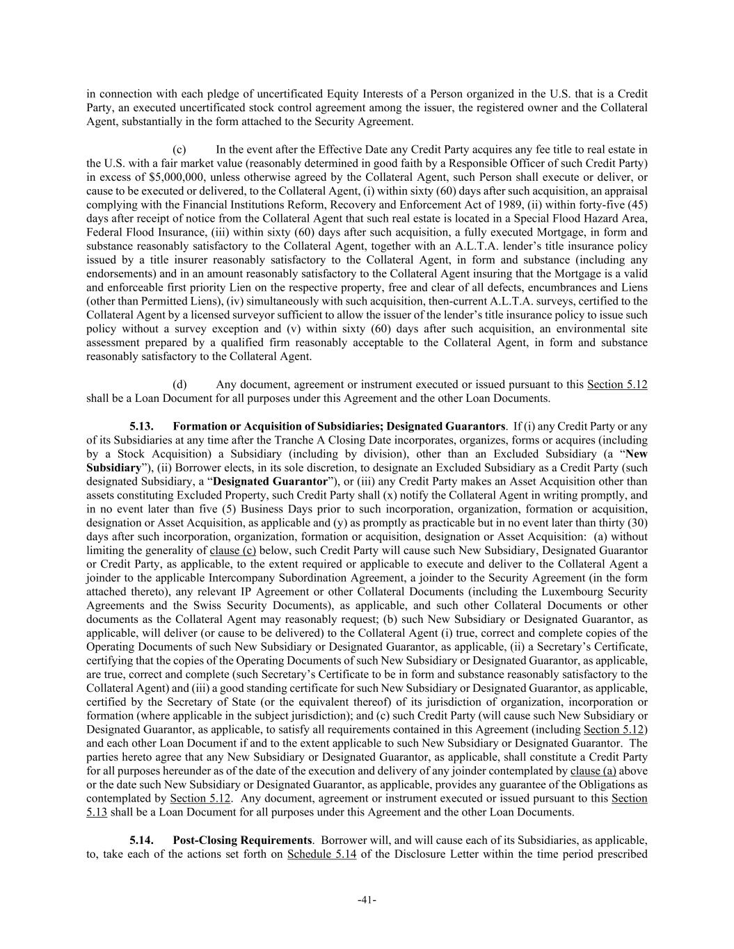 -41- in connection with each pledge of uncertificated Equity Interests of a Person organized in the U.S. that is a Credit Party, an executed uncertificated stock control agreement among the issuer, the registered owner and the Collateral Agent, substantially in the form attached to the Security Agreement. (c) In the event after the Effective Date any Credit Party acquires any fee title to real estate in the U.S. with a fair market value (reasonably determined in good faith by a Responsible Officer of such Credit Party) in excess of $5,000,000, unless otherwise agreed by the Collateral Agent, such Person shall execute or deliver, or cause to be executed or delivered, to the Collateral Agent, (i) within sixty (60) days after such acquisition, an appraisal complying with the Financial Institutions Reform, Recovery and Enforcement Act of 1989, (ii) within forty-five (45) days after receipt of notice from the Collateral Agent that such real estate is located in a Special Flood Hazard Area, Federal Flood Insurance, (iii) within sixty (60) days after such acquisition, a fully executed Mortgage, in form and substance reasonably satisfactory to the Collateral Agent, together with an A.L.T.A. lender’s title insurance policy issued by a title insurer reasonably satisfactory to the Collateral Agent, in form and substance (including any endorsements) and in an amount reasonably satisfactory to the Collateral Agent insuring that the Mortgage is a valid and enforceable first priority Lien on the respective property, free and clear of all defects, encumbrances and Liens (other than Permitted Liens), (iv) simultaneously with such acquisition, then-current A.L.T.A. surveys, certified to the Collateral Agent by a licensed surveyor sufficient to allow the issuer of the lender’s title insurance policy to issue such policy without a survey exception and (v) within sixty (60) days after such acquisition, an environmental site assessment prepared by a qualified firm reasonably acceptable to the Collateral Agent, in form and substance reasonably satisfactory to the Collateral Agent. (d) Any document, agreement or instrument executed or issued pursuant to this Section 5.12 shall be a Loan Document for all purposes under this Agreement and the other Loan Documents. 5.13. Formation or Acquisition of Subsidiaries; Designated Guarantors. If (i) any Credit Party or any of its Subsidiaries at any time after the Tranche A Closing Date incorporates, organizes, forms or acquires (including by a Stock Acquisition) a Subsidiary (including by division), other than an Excluded Subsidiary (a “New Subsidiary”), (ii) Borrower elects, in its sole discretion, to designate an Excluded Subsidiary as a Credit Party (such designated Subsidiary, a “Designated Guarantor”), or (iii) any Credit Party makes an Asset Acquisition other than assets constituting Excluded Property, such Credit Party shall (x) notify the Collateral Agent in writing promptly, and in no event later than five (5) Business Days prior to such incorporation, organization, formation or acquisition, designation or Asset Acquisition, as applicable and (y) as promptly as practicable but in no event later than thirty (30) days after such incorporation, organization, formation or acquisition, designation or Asset Acquisition: (a) without limiting the generality of clause (c) below, such Credit Party will cause such New Subsidiary, Designated Guarantor or Credit Party, as applicable, to the extent required or applicable to execute and deliver to the Collateral Agent a joinder to the applicable Intercompany Subordination Agreement, a joinder to the Security Agreement (in the form attached thereto), any relevant IP Agreement or other Collateral Documents (including the Luxembourg Security Agreements and the Swiss Security Documents), as applicable, and such other Collateral Documents or other documents as the Collateral Agent may reasonably request; (b) such New Subsidiary or Designated Guarantor, as applicable, will deliver (or cause to be delivered) to the Collateral Agent (i) true, correct and complete copies of the Operating Documents of such New Subsidiary or Designated Guarantor, as applicable, (ii) a Secretary’s Certificate, certifying that the copies of the Operating Documents of such New Subsidiary or Designated Guarantor, as applicable, are true, correct and complete (such Secretary’s Certificate to be in form and substance reasonably satisfactory to the Collateral Agent) and (iii) a good standing certificate for such New Subsidiary or Designated Guarantor, as applicable, certified by the Secretary of State (or the equivalent thereof) of its jurisdiction of organization, incorporation or formation (where applicable in the subject jurisdiction); and (c) such Credit Party (will cause such New Subsidiary or Designated Guarantor, as applicable, to satisfy all requirements contained in this Agreement (including Section 5.12) and each other Loan Document if and to the extent applicable to such New Subsidiary or Designated Guarantor. The parties hereto agree that any New Subsidiary or Designated Guarantor, as applicable, shall constitute a Credit Party for all purposes hereunder as of the date of the execution and delivery of any joinder contemplated by clause (a) above or the date such New Subsidiary or Designated Guarantor, as applicable, provides any guarantee of the Obligations as contemplated by Section 5.12. Any document, agreement or instrument executed or issued pursuant to this Section 5.13 shall be a Loan Document for all purposes under this Agreement and the other Loan Documents. 5.14. Post-Closing Requirements. Borrower will, and will cause each of its Subsidiaries, as applicable, to, take each of the actions set forth on Schedule 5.14 of the Disclosure Letter within the time period prescribed