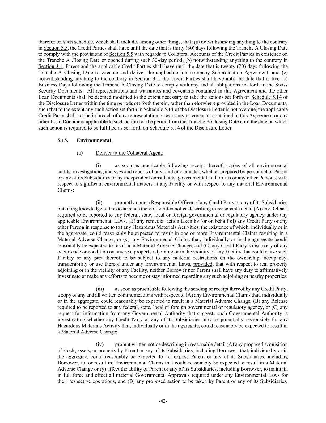 -42- therefor on such schedule, which shall include, among other things, that: (a) notwithstanding anything to the contrary in Section 5.5, the Credit Parties shall have until the date that is thirty (30) days following the Tranche A Closing Date to comply with the provisions of Section 5.5 with regards to Collateral Accounts of the Credit Parties in existence on the Tranche A Closing Date or opened during such 30-day period; (b) notwithstanding anything to the contrary in Section 3.1, Parent and the applicable Credit Parties shall have until the date that is twenty (20) days following the Tranche A Closing Date to execute and deliver the applicable Intercompany Subordination Agreement; and (c) notwithstanding anything to the contrary in Section 3.1, the Credit Parties shall have until the date that is five (5) Business Days following the Tranche A Closing Date to comply with any and all obligations set forth in the Swiss Security Documents. All representations and warranties and covenants contained in this Agreement and the other Loan Documents shall be deemed modified to the extent necessary to take the actions set forth on Schedule 5.14 of the Disclosure Letter within the time periods set forth therein, rather than elsewhere provided in the Loan Documents, such that to the extent any such action set forth in Schedule 5.14 of the Disclosure Letter is not overdue, the applicable Credit Party shall not be in breach of any representation or warranty or covenant contained in this Agreement or any other Loan Document applicable to such action for the period from the Tranche A Closing Date until the date on which such action is required to be fulfilled as set forth on Schedule 5.14 of the Disclosure Letter. 5.15. Environmental. (a) Deliver to the Collateral Agent: (i) as soon as practicable following receipt thereof, copies of all environmental audits, investigations, analyses and reports of any kind or character, whether prepared by personnel of Parent or any of its Subsidiaries or by independent consultants, governmental authorities or any other Persons, with respect to significant environmental matters at any Facility or with respect to any material Environmental Claims; (ii) promptly upon a Responsible Officer of any Credit Party or any of its Subsidiaries obtaining knowledge of the occurrence thereof, written notice describing in reasonable detail (A) any Release required to be reported to any federal, state, local or foreign governmental or regulatory agency under any applicable Environmental Laws, (B) any remedial action taken by (or on behalf of) any Credit Party or any other Person in response to (x) any Hazardous Materials Activities, the existence of which, individually or in the aggregate, could reasonably be expected to result in one or more Environmental Claims resulting in a Material Adverse Change, or (y) any Environmental Claims that, individually or in the aggregate, could reasonably be expected to result in a Material Adverse Change, and (C) any Credit Party’s discovery of any occurrence or condition on any real property adjoining or in the vicinity of any Facility that could cause such Facility or any part thereof to be subject to any material restrictions on the ownership, occupancy, transferability or use thereof under any Environmental Laws, provided, that with respect to real property adjoining or in the vicinity of any Facility, neither Borrower nor Parent shall have any duty to affirmatively investigate or make any efforts to become or stay informed regarding any such adjoining or nearby properties; (iii) as soon as practicable following the sending or receipt thereof by any Credit Party, a copy of any and all written communications with respect to (A) any Environmental Claims that, individually or in the aggregate, could reasonably be expected to result in a Material Adverse Change, (B) any Release required to be reported to any federal, state, local or foreign governmental or regulatory agency, or (C) any request for information from any Governmental Authority that suggests such Governmental Authority is investigating whether any Credit Party or any of its Subsidiaries may be potentially responsible for any Hazardous Materials Activity that, individually or in the aggregate, could reasonably be expected to result in a Material Adverse Change; (iv) prompt written notice describing in reasonable detail (A) any proposed acquisition of stock, assets, or property by Parent or any of its Subsidiaries, including Borrower, that, individually or in the aggregate, could reasonably be expected to (x) expose Parent or any of its Subsidiaries, including Borrower, to, or result in, Environmental Claims that could reasonably be expected to result in a Material Adverse Change or (y) affect the ability of Parent or any of its Subsidiaries, including Borrower, to maintain in full force and effect all material Governmental Approvals required under any Environmental Laws for their respective operations, and (B) any proposed action to be taken by Parent or any of its Subsidiaries,