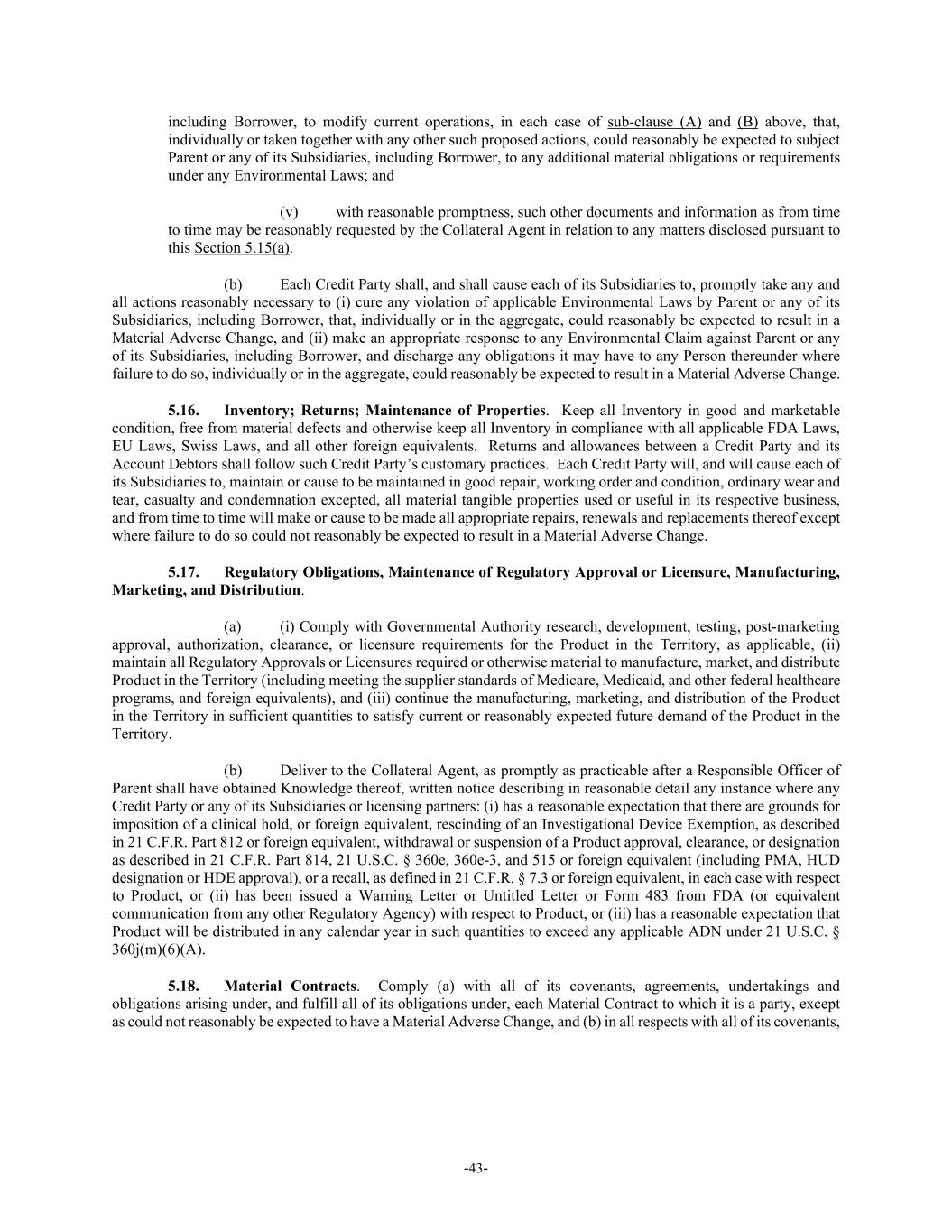 -43- including Borrower, to modify current operations, in each case of sub-clause (A) and (B) above, that, individually or taken together with any other such proposed actions, could reasonably be expected to subject Parent or any of its Subsidiaries, including Borrower, to any additional material obligations or requirements under any Environmental Laws; and (v) with reasonable promptness, such other documents and information as from time to time may be reasonably requested by the Collateral Agent in relation to any matters disclosed pursuant to this Section 5.15(a). (b) Each Credit Party shall, and shall cause each of its Subsidiaries to, promptly take any and all actions reasonably necessary to (i) cure any violation of applicable Environmental Laws by Parent or any of its Subsidiaries, including Borrower, that, individually or in the aggregate, could reasonably be expected to result in a Material Adverse Change, and (ii) make an appropriate response to any Environmental Claim against Parent or any of its Subsidiaries, including Borrower, and discharge any obligations it may have to any Person thereunder where failure to do so, individually or in the aggregate, could reasonably be expected to result in a Material Adverse Change. 5.16. Inventory; Returns; Maintenance of Properties. Keep all Inventory in good and marketable condition, free from material defects and otherwise keep all Inventory in compliance with all applicable FDA Laws, EU Laws, Swiss Laws, and all other foreign equivalents. Returns and allowances between a Credit Party and its Account Debtors shall follow such Credit Party’s customary practices. Each Credit Party will, and will cause each of its Subsidiaries to, maintain or cause to be maintained in good repair, working order and condition, ordinary wear and tear, casualty and condemnation excepted, all material tangible properties used or useful in its respective business, and from time to time will make or cause to be made all appropriate repairs, renewals and replacements thereof except where failure to do so could not reasonably be expected to result in a Material Adverse Change. 5.17. Regulatory Obligations, Maintenance of Regulatory Approval or Licensure, Manufacturing, Marketing, and Distribution. (a) (i) Comply with Governmental Authority research, development, testing, post-marketing approval, authorization, clearance, or licensure requirements for the Product in the Territory, as applicable, (ii) maintain all Regulatory Approvals or Licensures required or otherwise material to manufacture, market, and distribute Product in the Territory (including meeting the supplier standards of Medicare, Medicaid, and other federal healthcare programs, and foreign equivalents), and (iii) continue the manufacturing, marketing, and distribution of the Product in the Territory in sufficient quantities to satisfy current or reasonably expected future demand of the Product in the Territory. (b) Deliver to the Collateral Agent, as promptly as practicable after a Responsible Officer of Parent shall have obtained Knowledge thereof, written notice describing in reasonable detail any instance where any Credit Party or any of its Subsidiaries or licensing partners: (i) has a reasonable expectation that there are grounds for imposition of a clinical hold, or foreign equivalent, rescinding of an Investigational Device Exemption, as described in 21 C.F.R. Part 812 or foreign equivalent, withdrawal or suspension of a Product approval, clearance, or designation as described in 21 C.F.R. Part 814, 21 U.S.C. § 360e, 360e-3, and 515 or foreign equivalent (including PMA, HUD designation or HDE approval), or a recall, as defined in 21 C.F.R. § 7.3 or foreign equivalent, in each case with respect to Product, or (ii) has been issued a Warning Letter or Untitled Letter or Form 483 from FDA (or equivalent communication from any other Regulatory Agency) with respect to Product, or (iii) has a reasonable expectation that Product will be distributed in any calendar year in such quantities to exceed any applicable ADN under 21 U.S.C. § 360j(m)(6)(A). 5.18. Material Contracts. Comply (a) with all of its covenants, agreements, undertakings and obligations arising under, and fulfill all of its obligations under, each Material Contract to which it is a party, except as could not reasonably be expected to have a Material Adverse Change, and (b) in all respects with all of its covenants,