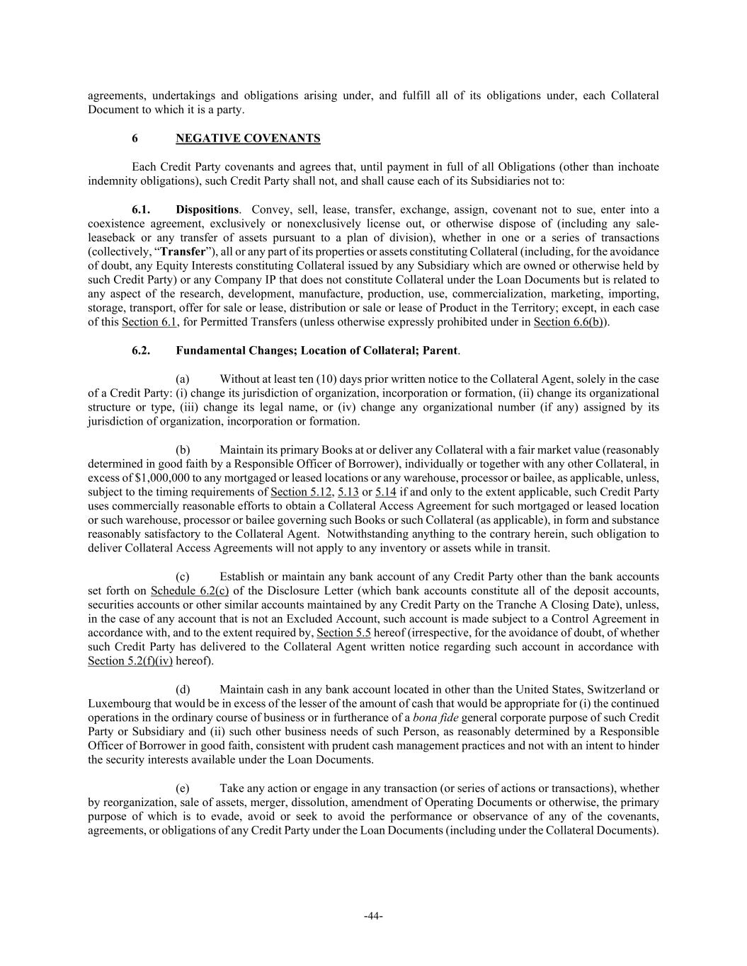-44- agreements, undertakings and obligations arising under, and fulfill all of its obligations under, each Collateral Document to which it is a party. 6 NEGATIVE COVENANTS Each Credit Party covenants and agrees that, until payment in full of all Obligations (other than inchoate indemnity obligations), such Credit Party shall not, and shall cause each of its Subsidiaries not to: 6.1. Dispositions. Convey, sell, lease, transfer, exchange, assign, covenant not to sue, enter into a coexistence agreement, exclusively or nonexclusively license out, or otherwise dispose of (including any sale- leaseback or any transfer of assets pursuant to a plan of division), whether in one or a series of transactions (collectively, “Transfer”), all or any part of its properties or assets constituting Collateral (including, for the avoidance of doubt, any Equity Interests constituting Collateral issued by any Subsidiary which are owned or otherwise held by such Credit Party) or any Company IP that does not constitute Collateral under the Loan Documents but is related to any aspect of the research, development, manufacture, production, use, commercialization, marketing, importing, storage, transport, offer for sale or lease, distribution or sale or lease of Product in the Territory; except, in each case of this Section 6.1, for Permitted Transfers (unless otherwise expressly prohibited under in Section 6.6(b)). 6.2. Fundamental Changes; Location of Collateral; Parent. (a) Without at least ten (10) days prior written notice to the Collateral Agent, solely in the case of a Credit Party: (i) change its jurisdiction of organization, incorporation or formation, (ii) change its organizational structure or type, (iii) change its legal name, or (iv) change any organizational number (if any) assigned by its jurisdiction of organization, incorporation or formation. (b) Maintain its primary Books at or deliver any Collateral with a fair market value (reasonably determined in good faith by a Responsible Officer of Borrower), individually or together with any other Collateral, in excess of $1,000,000 to any mortgaged or leased locations or any warehouse, processor or bailee, as applicable, unless, subject to the timing requirements of Section 5.12, 5.13 or 5.14 if and only to the extent applicable, such Credit Party uses commercially reasonable efforts to obtain a Collateral Access Agreement for such mortgaged or leased location or such warehouse, processor or bailee governing such Books or such Collateral (as applicable), in form and substance reasonably satisfactory to the Collateral Agent. Notwithstanding anything to the contrary herein, such obligation to deliver Collateral Access Agreements will not apply to any inventory or assets while in transit. (c) Establish or maintain any bank account of any Credit Party other than the bank accounts set forth on Schedule 6.2(c) of the Disclosure Letter (which bank accounts constitute all of the deposit accounts, securities accounts or other similar accounts maintained by any Credit Party on the Tranche A Closing Date), unless, in the case of any account that is not an Excluded Account, such account is made subject to a Control Agreement in accordance with, and to the extent required by, Section 5.5 hereof (irrespective, for the avoidance of doubt, of whether such Credit Party has delivered to the Collateral Agent written notice regarding such account in accordance with Section 5.2(f)(iv) hereof). (d) Maintain cash in any bank account located in other than the United States, Switzerland or Luxembourg that would be in excess of the lesser of the amount of cash that would be appropriate for (i) the continued operations in the ordinary course of business or in furtherance of a bona fide general corporate purpose of such Credit Party or Subsidiary and (ii) such other business needs of such Person, as reasonably determined by a Responsible Officer of Borrower in good faith, consistent with prudent cash management practices and not with an intent to hinder the security interests available under the Loan Documents. (e) Take any action or engage in any transaction (or series of actions or transactions), whether by reorganization, sale of assets, merger, dissolution, amendment of Operating Documents or otherwise, the primary purpose of which is to evade, avoid or seek to avoid the performance or observance of any of the covenants, agreements, or obligations of any Credit Party under the Loan Documents (including under the Collateral Documents).